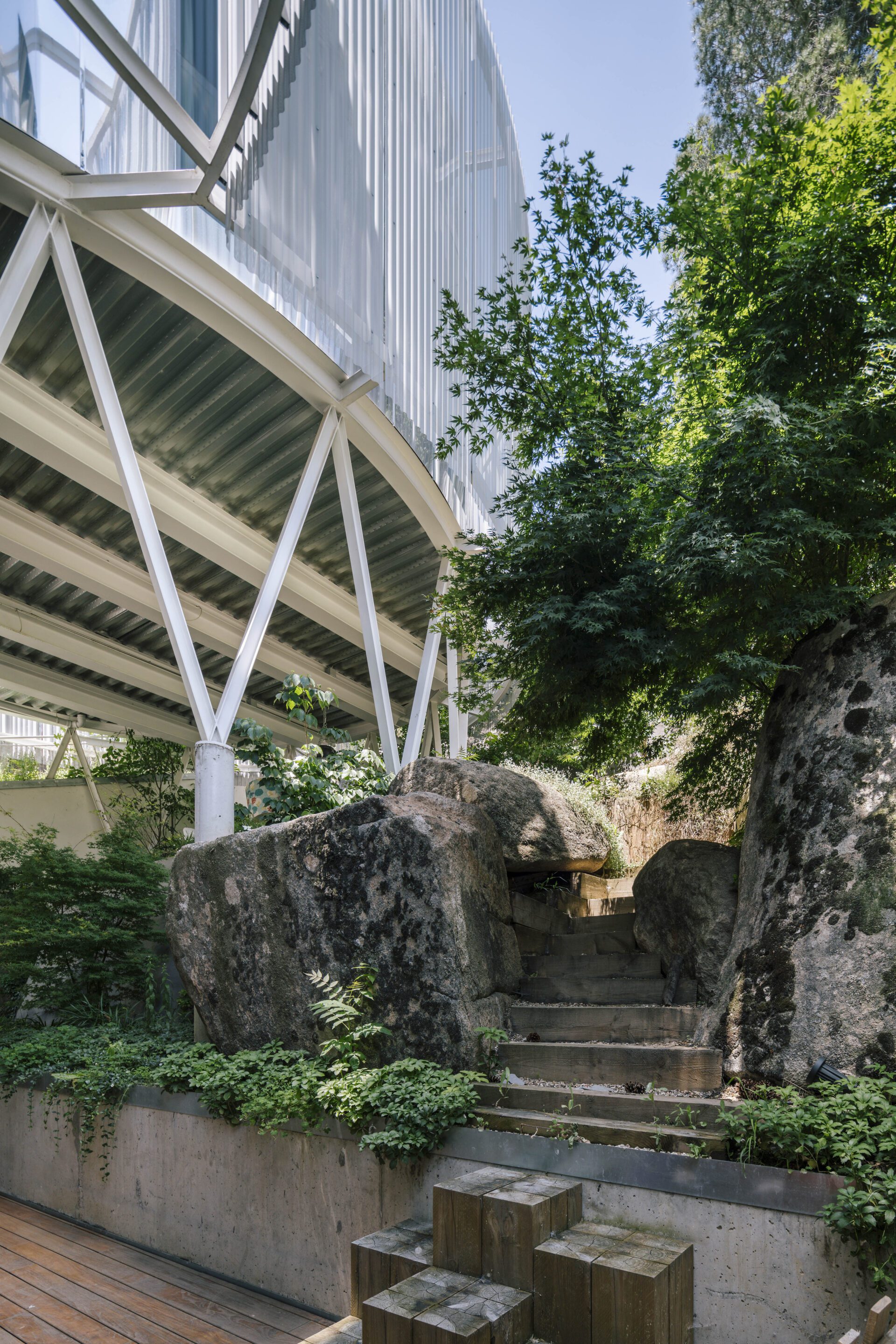 At the rear of the basement, between the house and the mountain, the excavation required for construction created a steep, irregular space. This area was stabilized with large rock placements and shade-tolerant vegetation, reinforcing a cave-like atmosphere that the landform naturally suggests. This unexpected and evocative space contributes to the contemplative and immersive quality of the overall project.