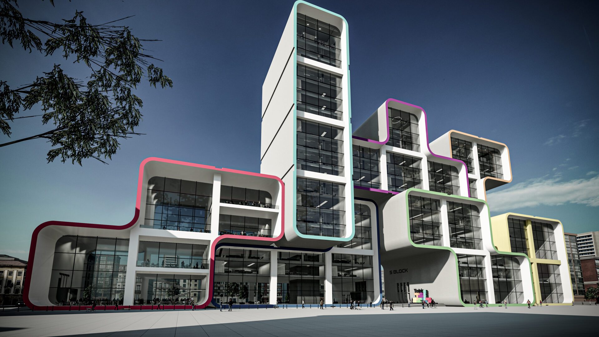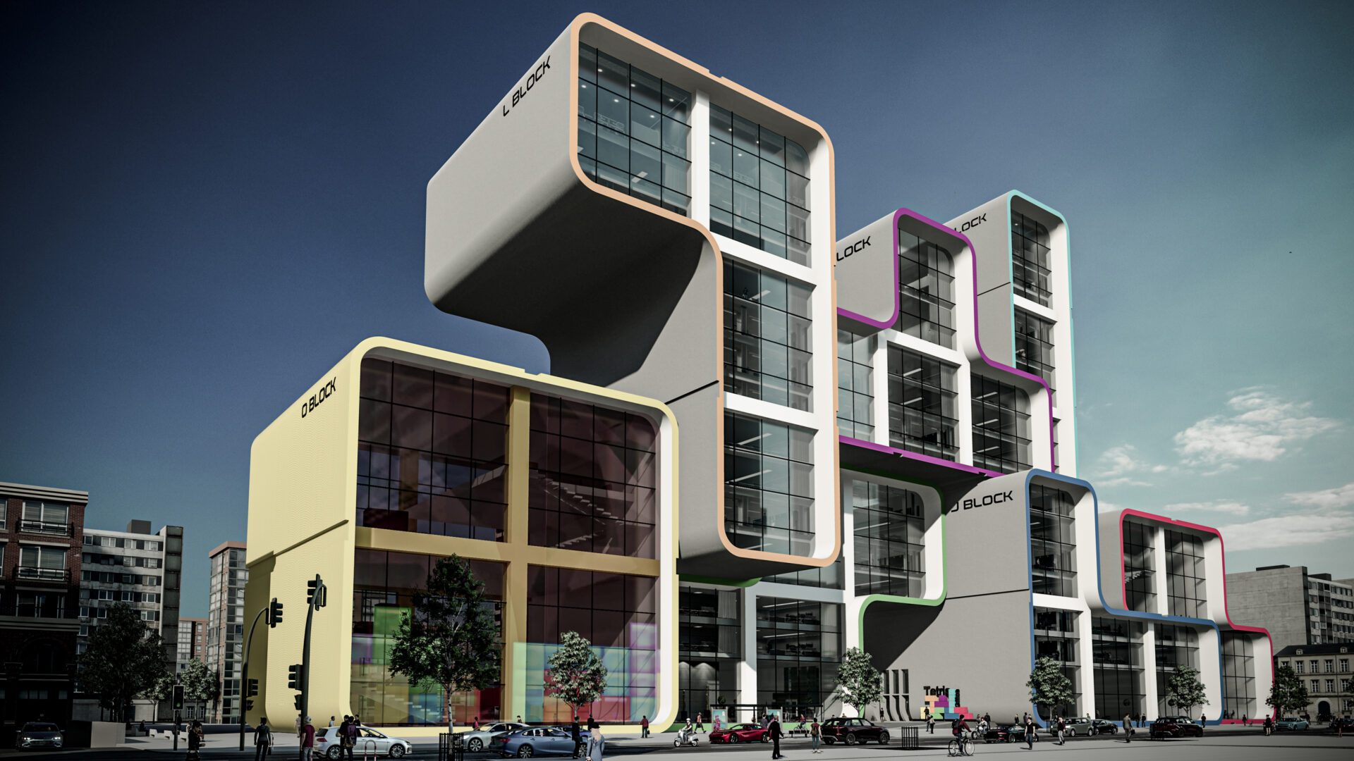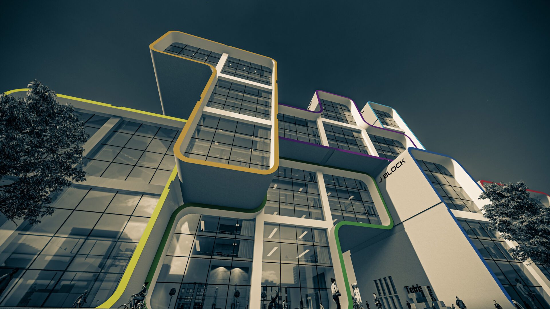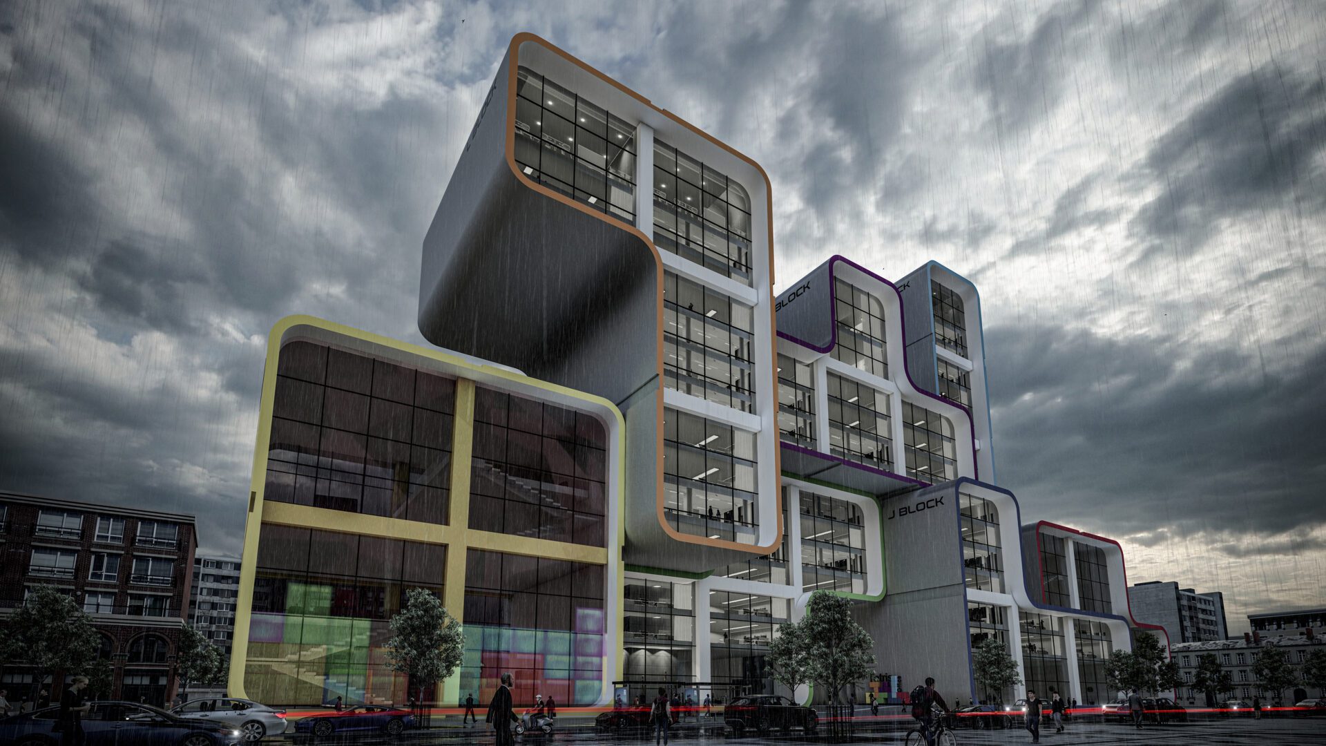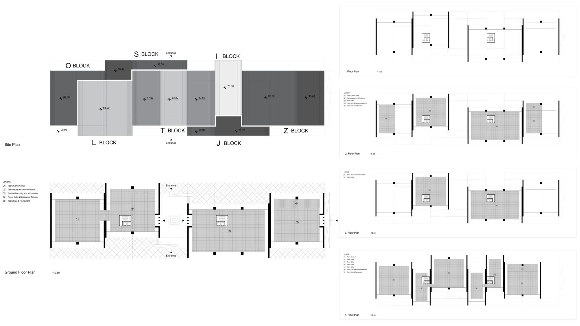 The blocks are given different functions. O Block, children's center, S Block shopping, museum and office lobby, L Block office block, T Block CEO and her/his employees, I Block office block, J Block office and lobby, Z Block, Café, Restaurante with 4-storey, terrace and balcony.