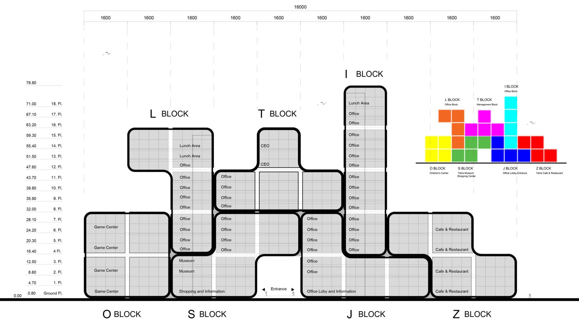 26,250 m2 total construction area. The highest block (I BLOCK) is 78.80 mt high. The building plot area is 160 mt X 45 mt. Clean Floor Height: 3.10 mt. All Tetrominos consist of four parts. The dimensions of this one piece in the project are H16xW16xD32 mt.