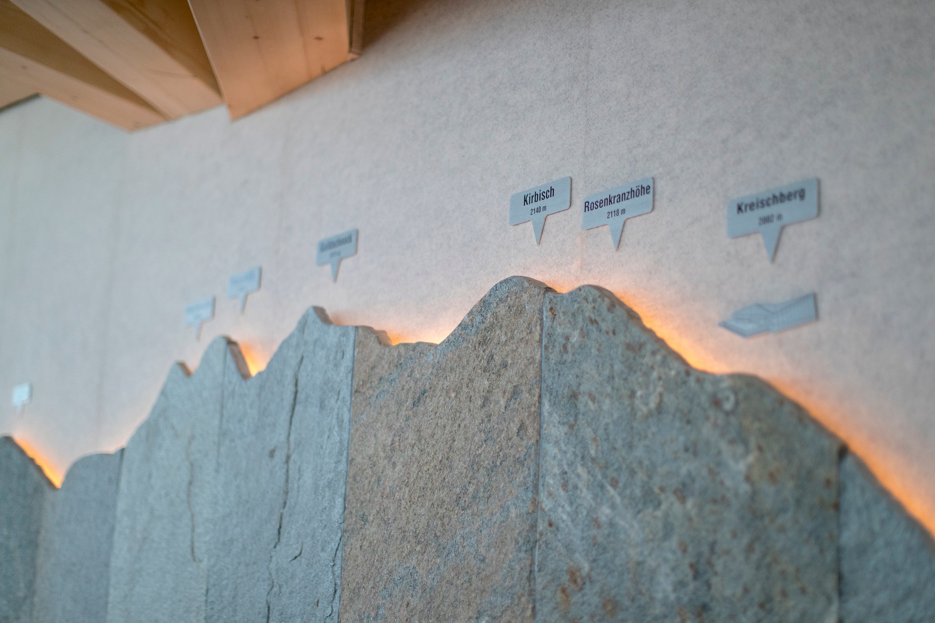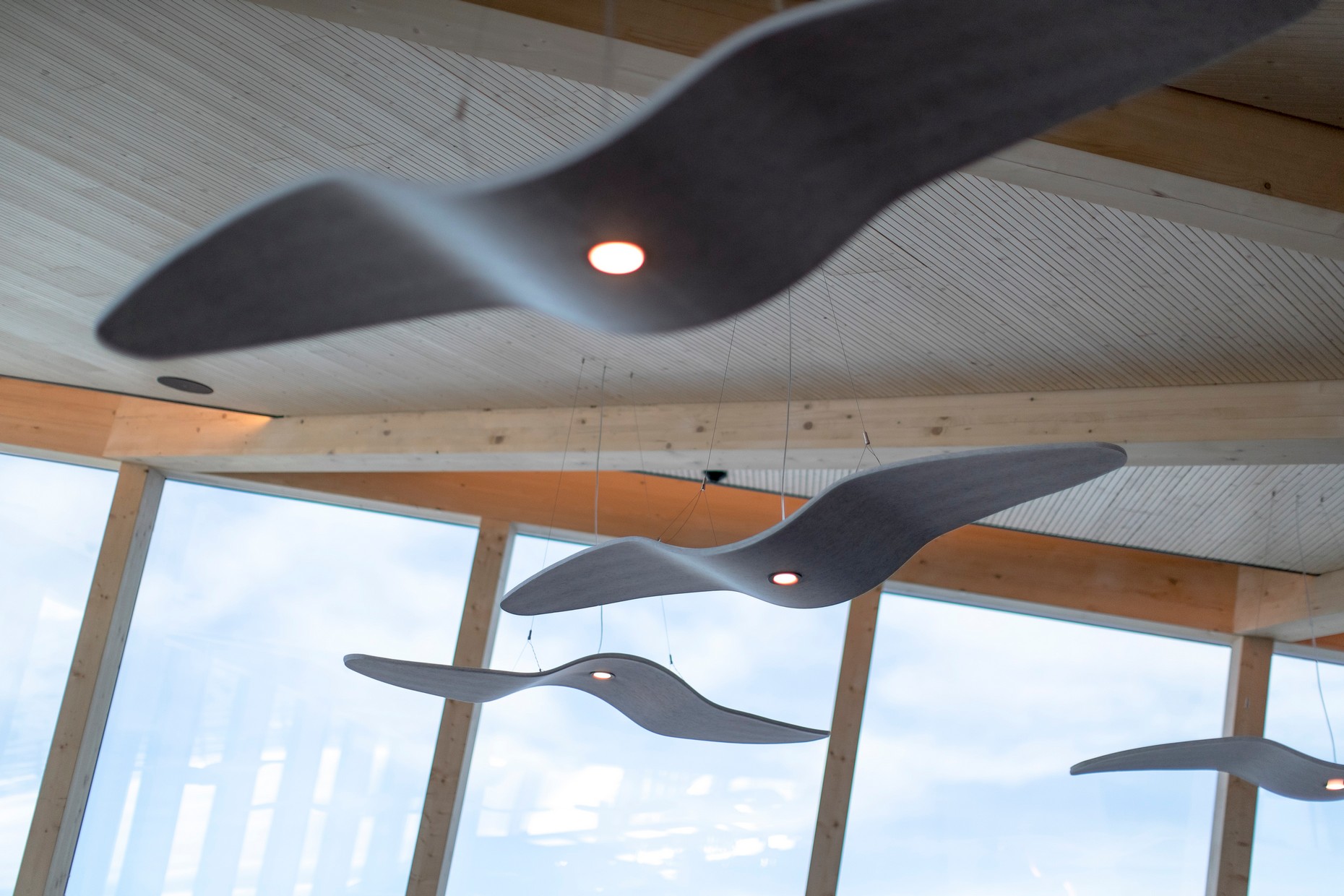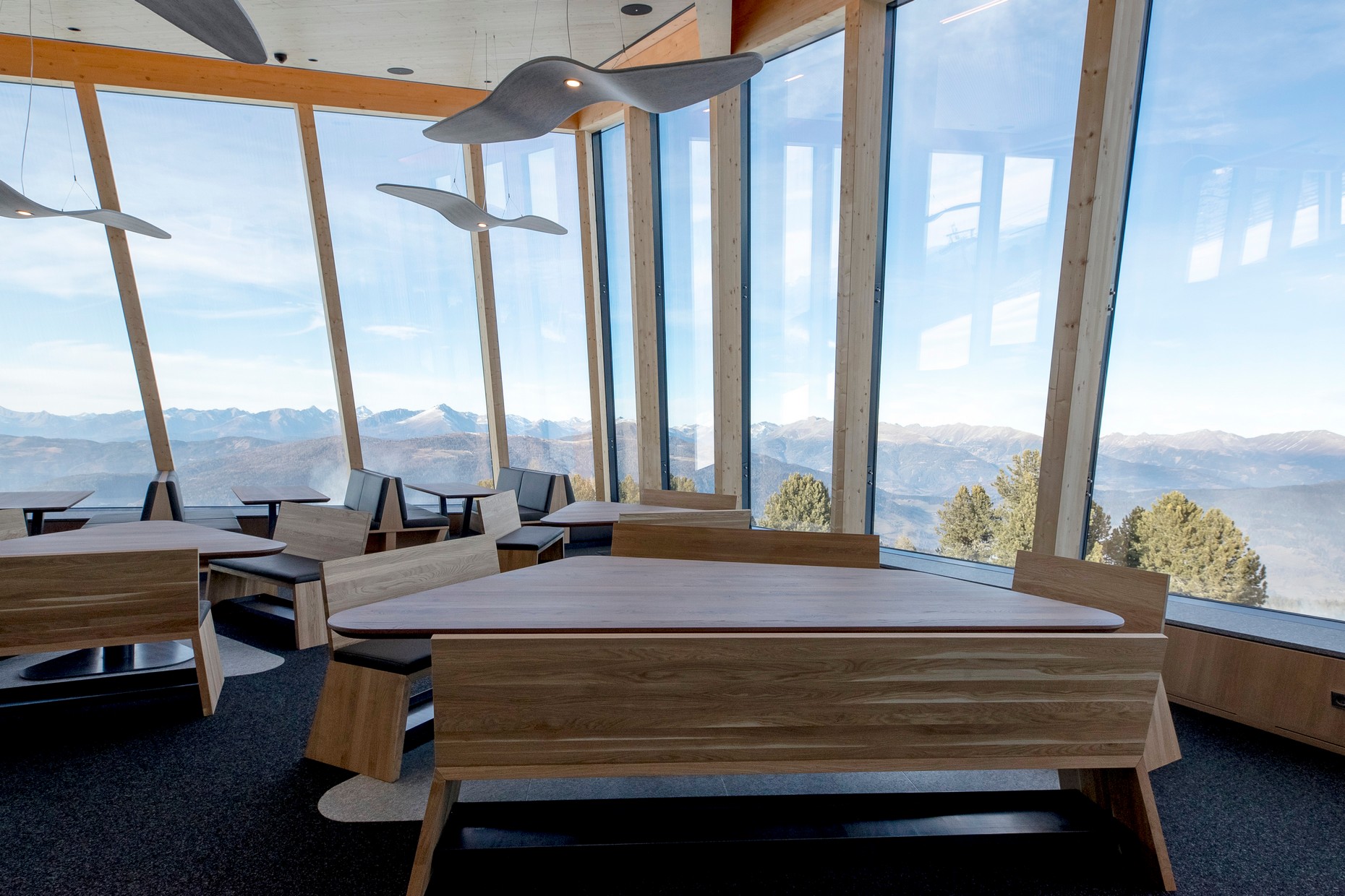 In a way we decided to serve the stereotype of mountain huts to be built in timber, but interpreted in a modern and contemporary way: Large visible CLT beams define the restaurant space and provide, together with CLT ceiling panels, a warm and cozy atmosphere. The CLT beams are organized in a star- shape to add a dramatic ceiling design, changing constantly as you walk through the building. The triangular areas between the beams are filled with perforated timber acoustic panels which serve as false ceiling where ventilation systems and electric installations are hidden. The whole interior space is filled with, especially for this building designed, bird- like pendant lamps, which are entirely made of compressed felt to create a bird swarm flying through the building, as reference to its contextual wildlife.
