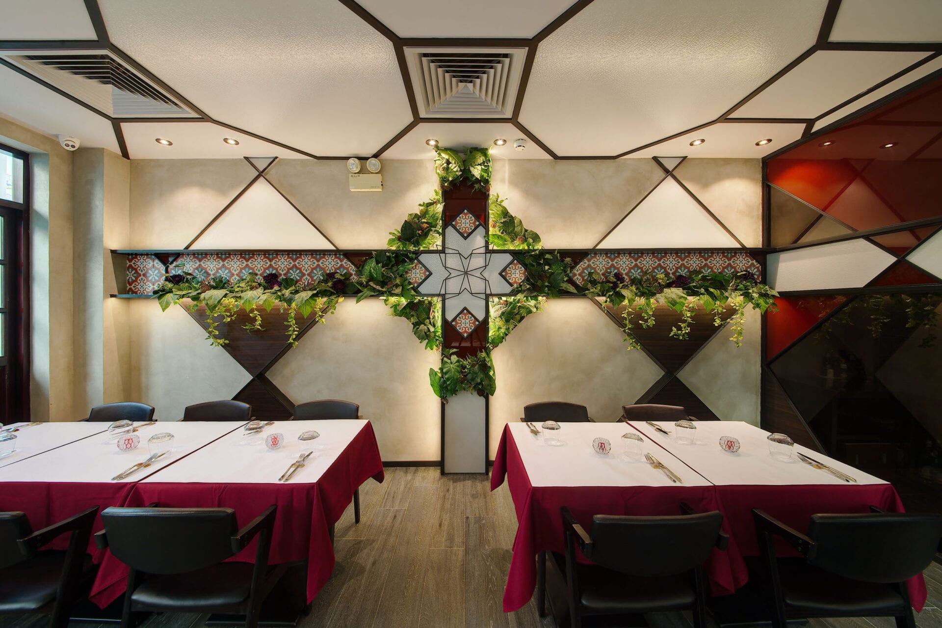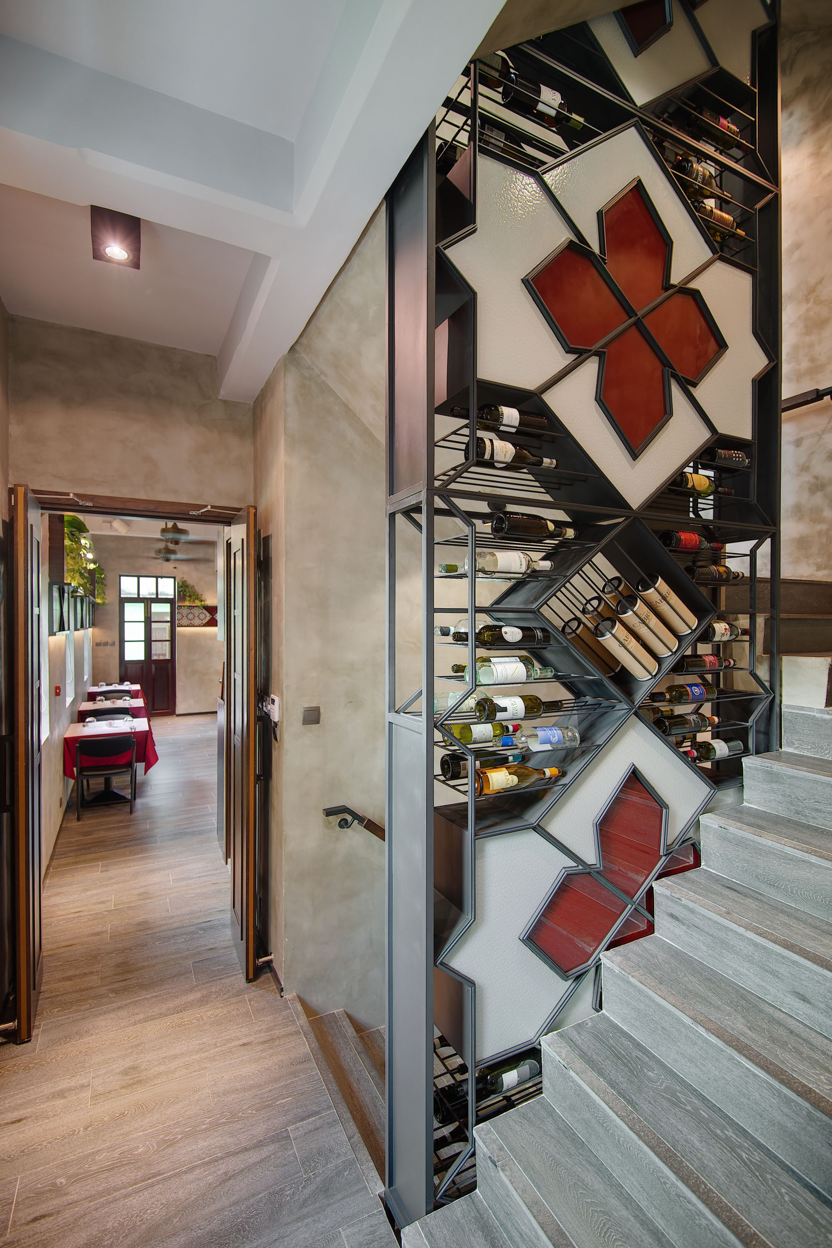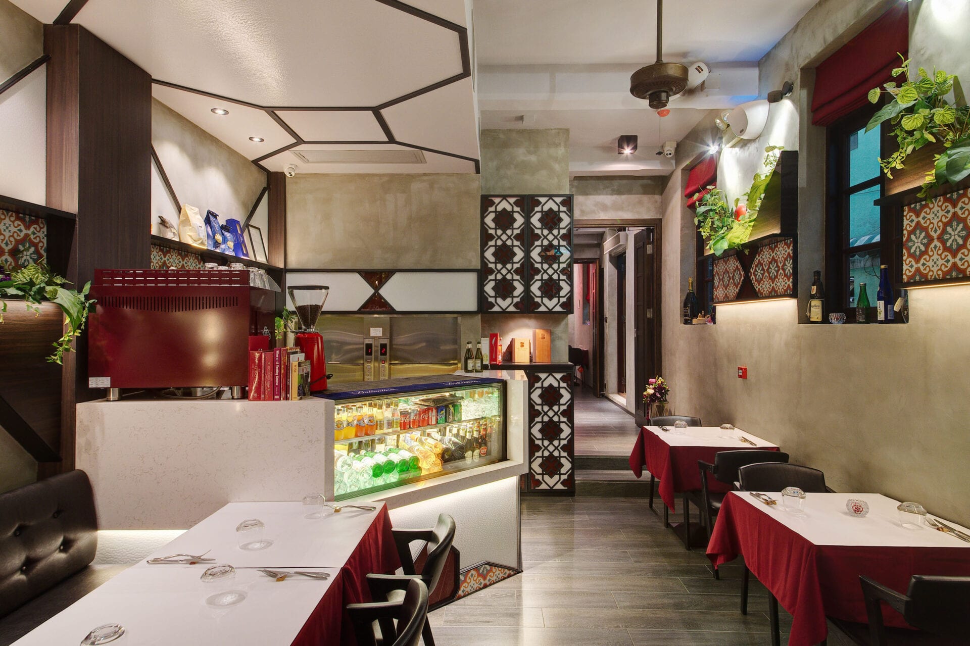 BELLA TAIPA, an Italian restaurant with a notable modernized colonial style in Macao, which was once a Portuguese colony, surely portraits that part of the history in a unique sterling way. The white walls, small wooden windows, white railing, humble balconies and neat facade, all these contribute to the restaurant’s fancy appearance just as a compact and elegant white jewelry box that catches people’s attention right away. The well-used and elaborately designed rooftop gives the restaurant a more versatile space where people feel free to enjoy their moments outdoor while appreciating the tranquil atmosphere of and historic Old Taipa Village. The designer has preserved the classic image of the building with touches of modernism and minimalism without conflicting with the natural classical visual that comes with the original building. The elegant color of white and the playfulness of transparent glass materials are vividly applied to balance the overall building and desirable effect which emphasizes the building throughout day and night. While entering to the restaurant, a sense of awakening embraces you with a truly diverse and exotic ambience at every corner similar to the fine and exquisite jewelry you would see in a very sophisticated and craftsmanship jewelry box bathed in a South Asia style. The framed patterns from the windows reminds the observer of a kaleidoscope, carved with thousand shades of diamond lattice patterns. The rich colored and outstanding bricks are embellished with a foggy gold wireframe and green leaves as foil, displaying a romantic yet relaxing leisure-like style from other parts of a the world. The indoor is also filled with various warm colors and the surface of the walls is bared with a beige color which shows a lot of character without being smooth as if particles of the walls were lively welcoming the customers to another dimension while their feet touch the ground with a subtle warm wood color. The decoration of the walls and rooftop is purposely carved with an octagonal plaid and checkered pattern. The color of most of the furniture such as tables and chairs carries a dark walnut chroma. This restaurant clearly exhibits the essence of diversity and a historical side of the city bearing traits from the Portuguese culture, as well as the exotic eastern flavor from the Chinese background polished with a South Asia touch.