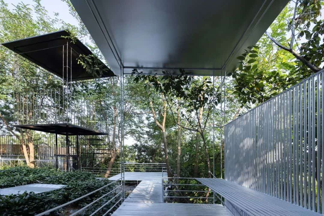 Thought garden takes "lightness" as a construction posture, completing the lines with steel. Pavilions and installations are connected through corridors and footpaths from different heights to realize the walking of different heights of forests, tea fields, and treetops, creating a sense of lofty interest and emptiness. In the “Theater Outside Things", the view in the forest is implicit and natural, while the open tea room stage offers an open-minded feeling; the "Xiaoyao Pavilion" conveys elegance and lightness; the “Transcendent Pavilion" is a combination of vigorous and broad-minded. People experience the closest contact with nature while walking in between the garden.