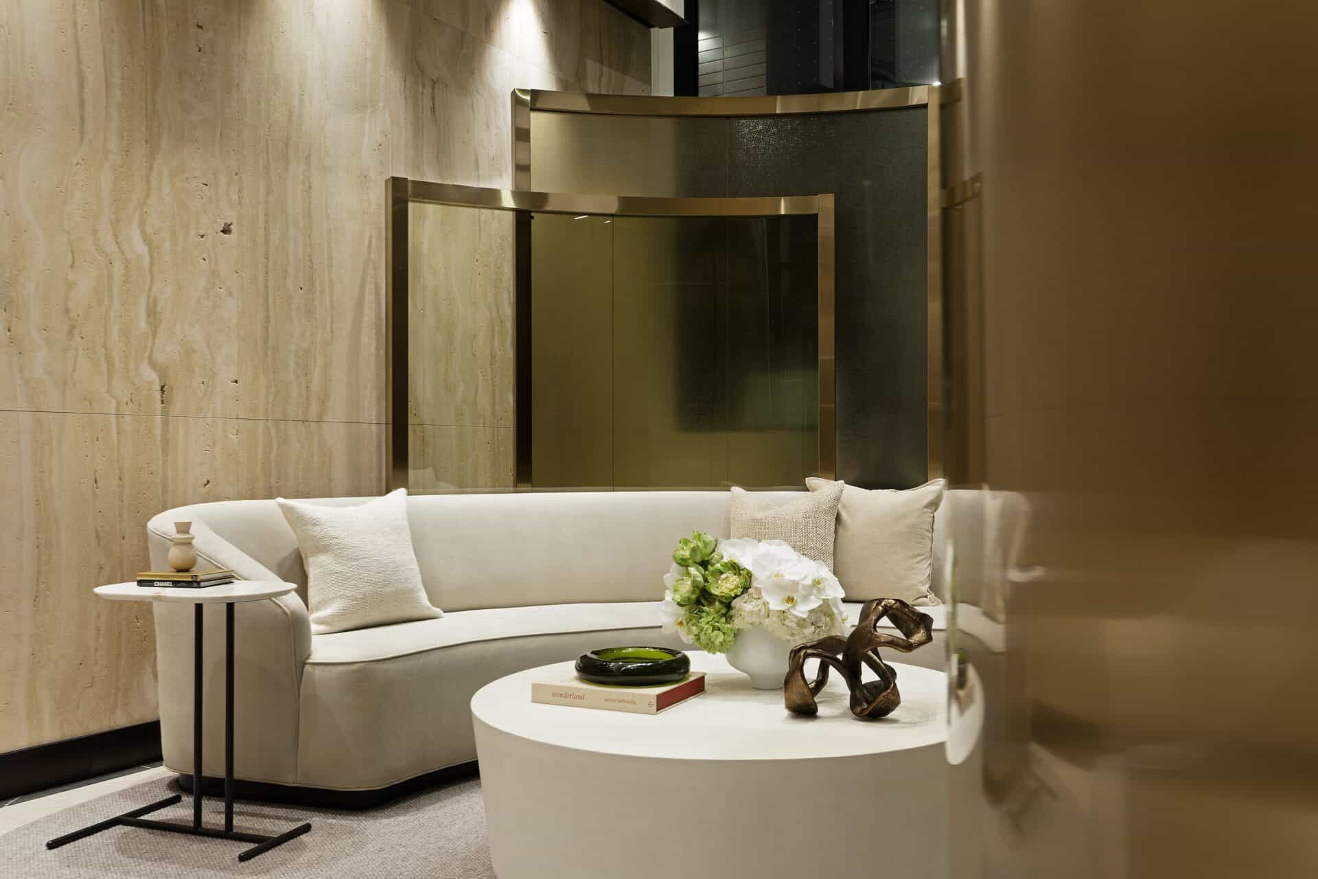 To set The Well D apart from the adjacent towers, an innovative design was essential to address the architectural site constraints. The lobby lounge was presented as a long, narrow space, and the design team saw an opportunity to create a captivating focal point with a sculptural droplet-inspired installation suspended above rippled glass discs. For a seamless transition into the living spaces, the organic lines from the lobby were carried through the archways of the elevator corridor and a muted palette with bronze accents established a distinct visual identity for the tower.