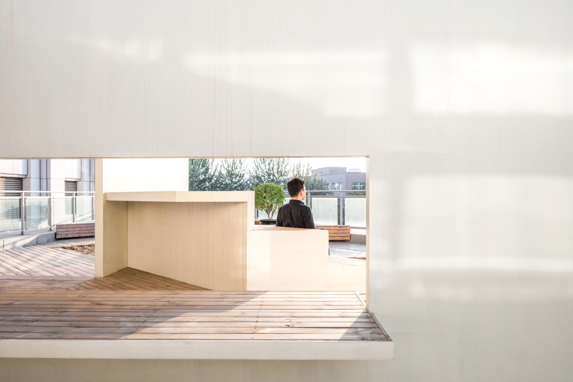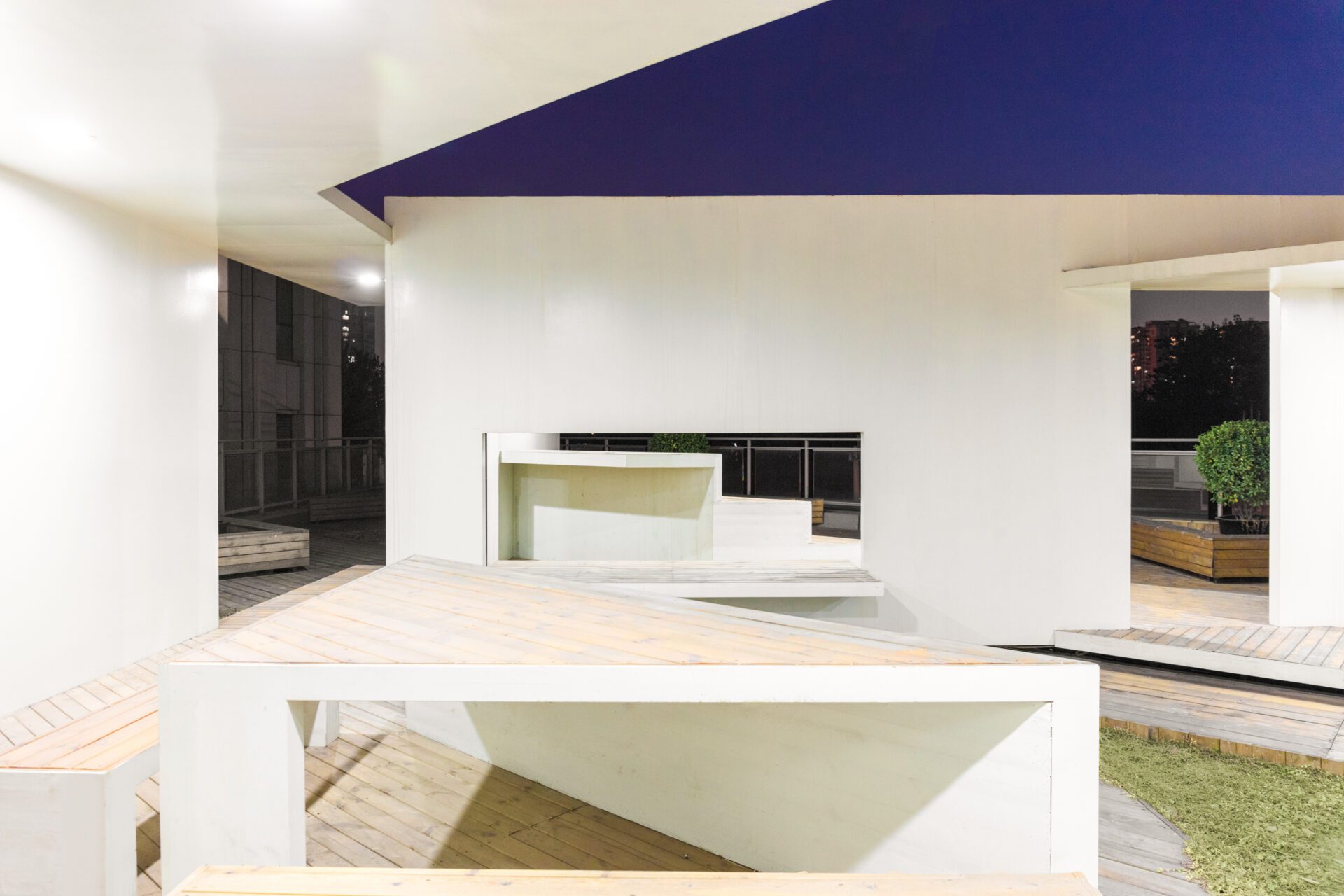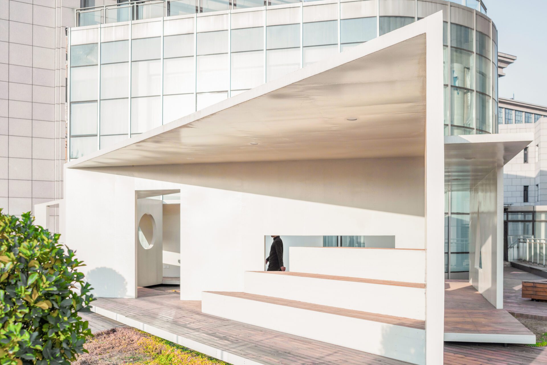 The site was originally a roofing platform on the entrance canopy of the building, which could be used but was rarely visited until the college decided to renovate in 2018 to provide a place for students and faculty to relax and rest.The main challenge of this project is how to meet the requirements of providing leisure and greenery space at a 300 square meter platform. We persuaded the client not to build classical pavilions and proposed an abstract garden approach that could be visited, liveable and enjoyable.The platform has an acute triangular shape and is 8 meters above the ground. In order to provide a better walking experience, we firstly flatten the floor with the anti-corrosion wood. Based on its triangular shape of the site, we scale out three similar triangular pavilions similar to its layout and enclose an inner courtyard. A continuous and complete roaming path is then created.The pavilion is constructed with white steel plate outside a steel structure frame. The design abstractly expresses the intention of the traditional classical garden under the restriction of cost and load.As a small-scale leisure project, the Jichang Garden in Wuxi provides a roaming path starting with a narrow entrance -- the stone stream built by yellowstone, then transitions to the open water. The contrast makes the water looks large even though the overall space is small. We hope that the experience of the Three Pavilions Garden is also rich and interesting, which is first restrained and then enhanced. From Exquisite Pavilion to Cloud-rising Pavilion, the scale from small to large, the space from closed to open, the line of sight from being restricted to suddenly clear.The Three Pavilions Garden project gave us an opportunity to express our understanding of the leisure places, and we hope that the spatial experience of transformation between traditional and modern can meet the expectation of the college's teachers and students.