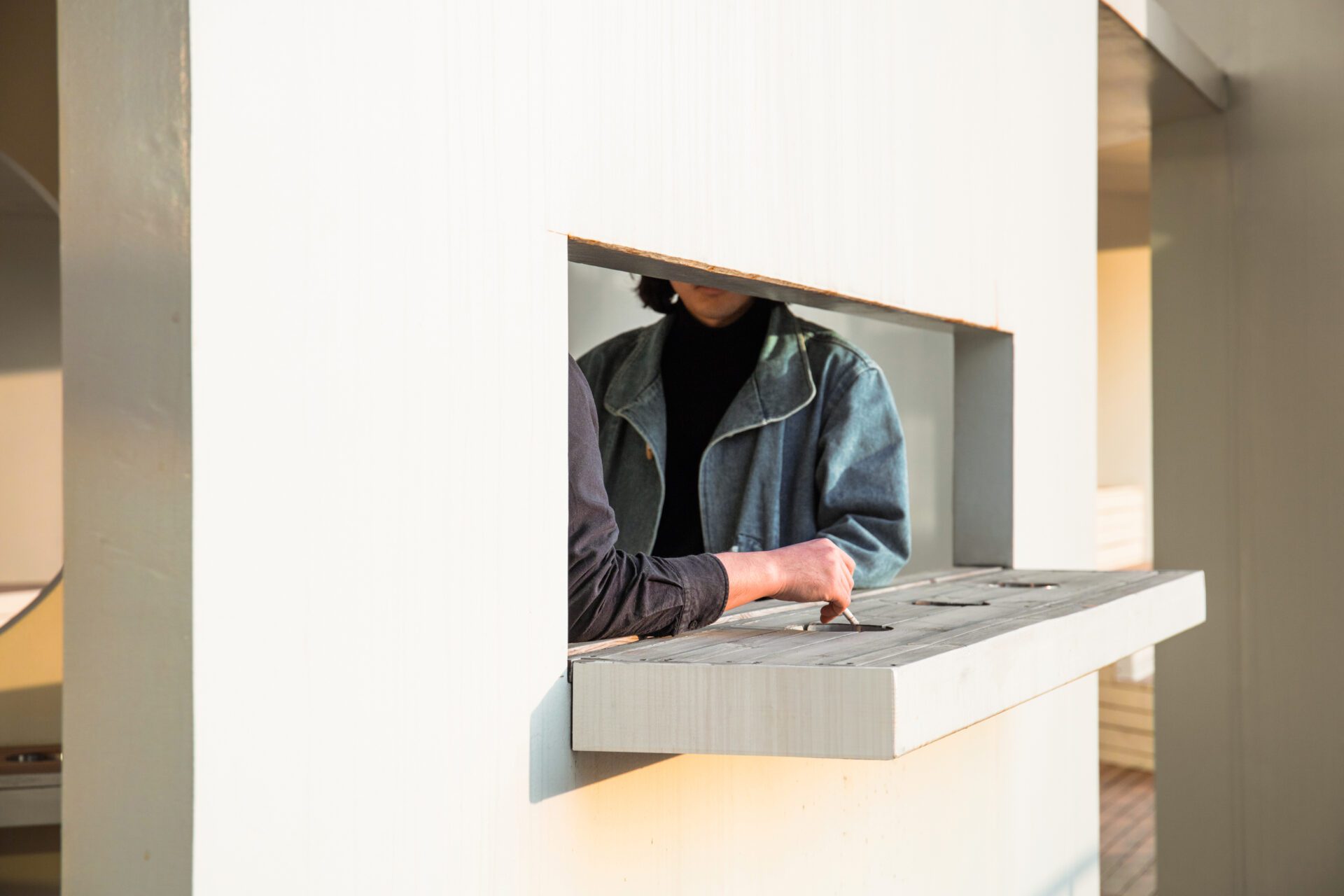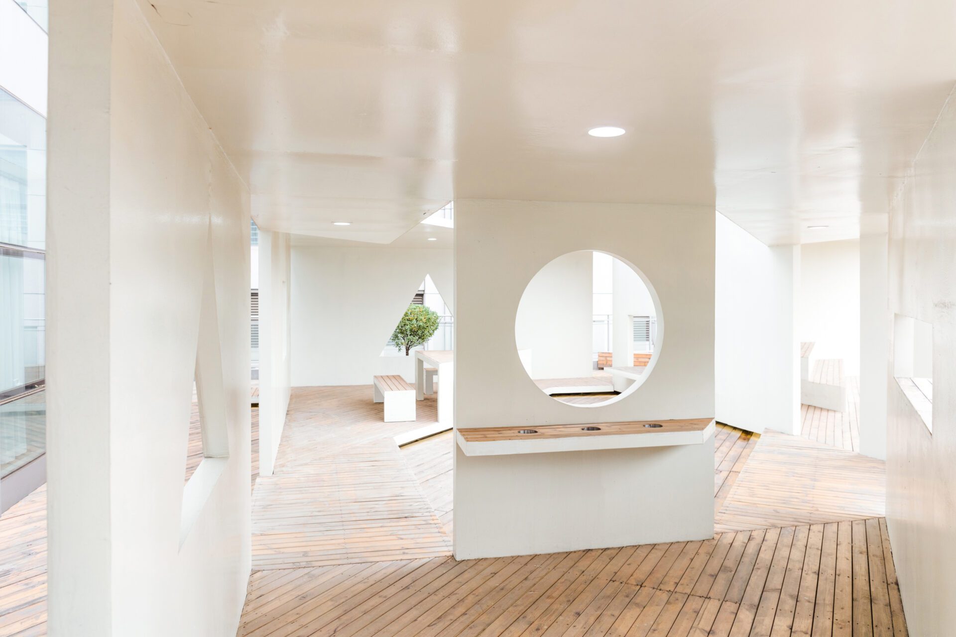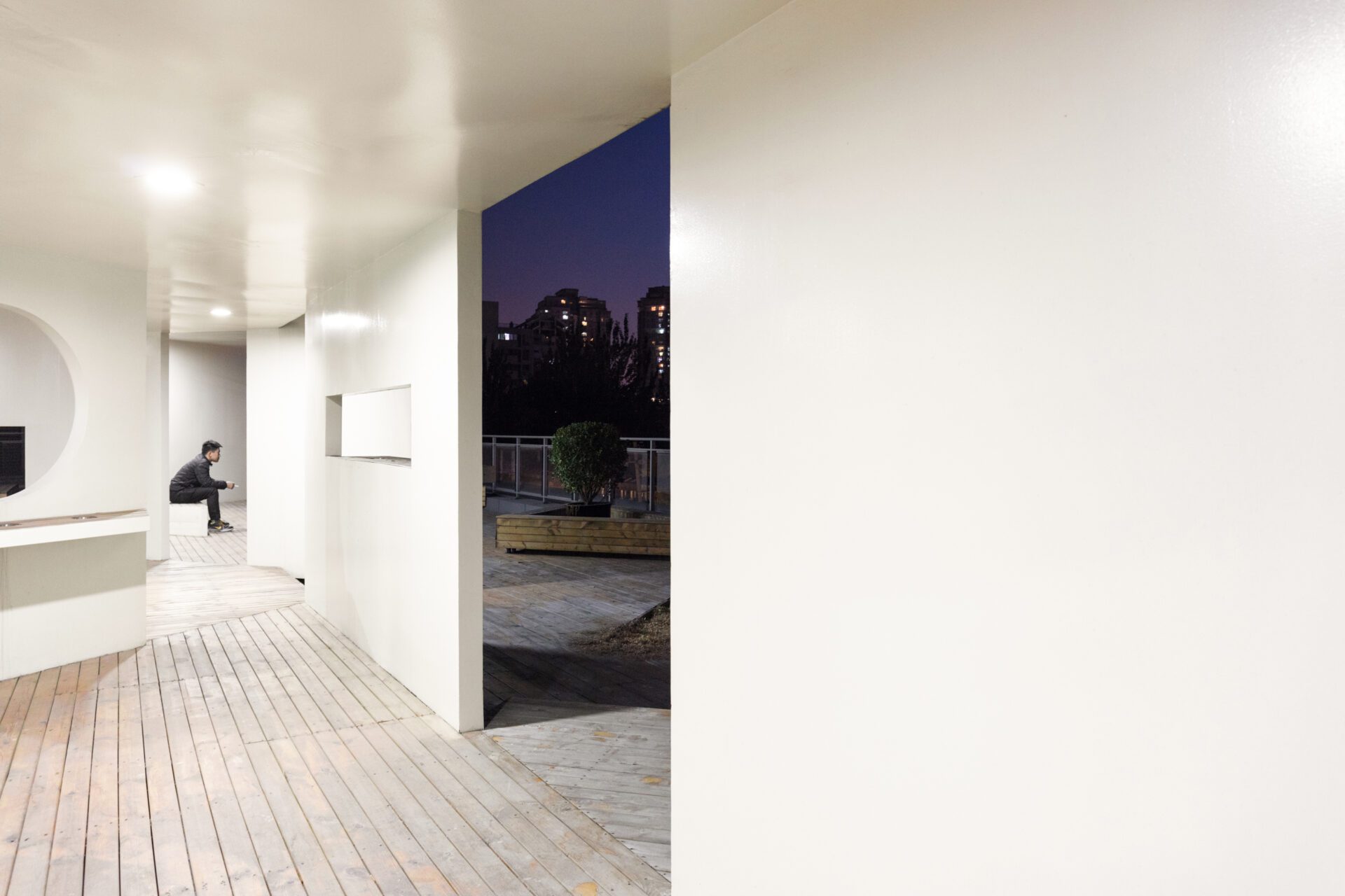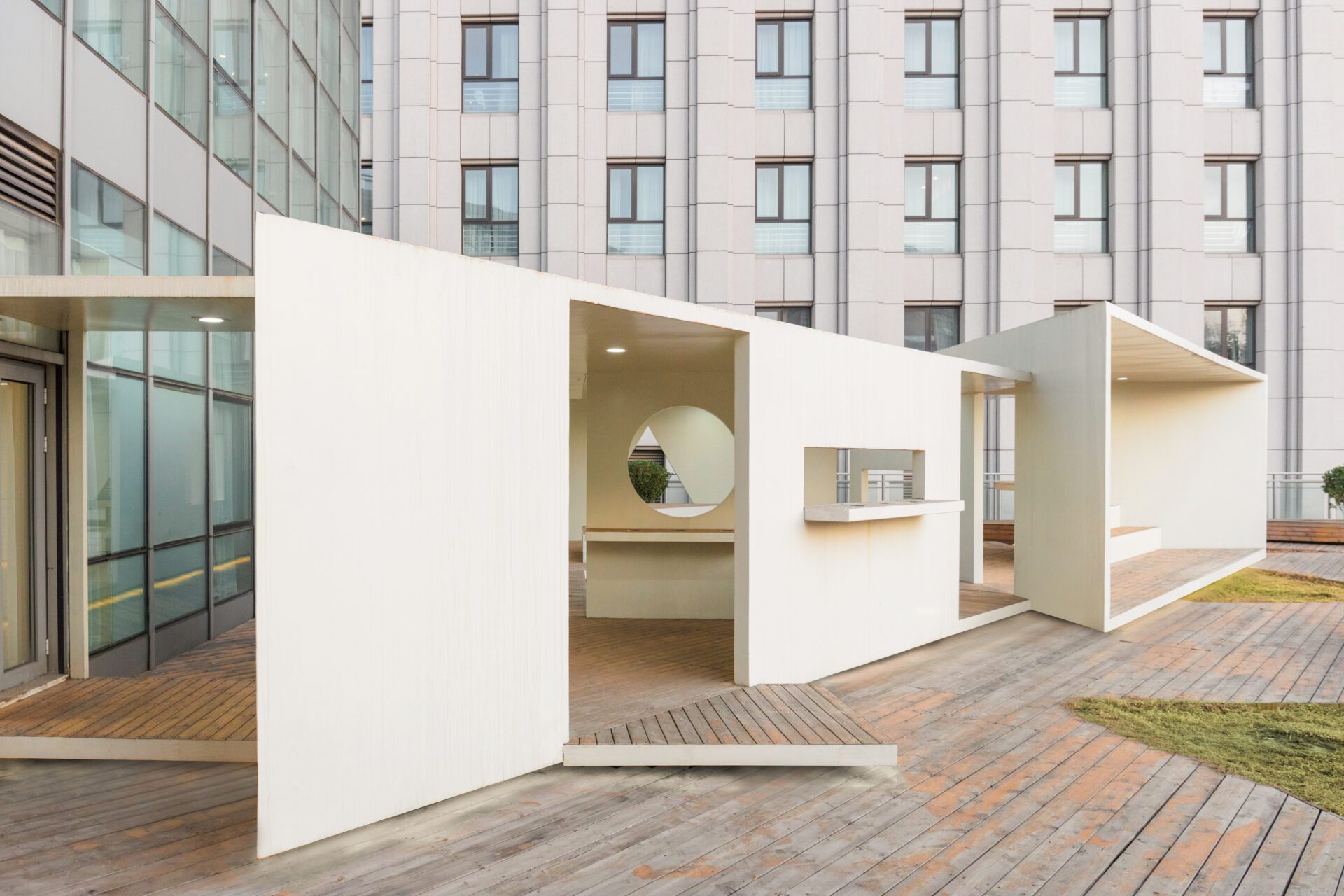 The site was originally a roofing platform on the entrance canopy of the building, which could be used but was rarely visited until the college decided to renovate in 2018 to provide a place for students and faculty to relax and rest.The main challenge of this project is how to meet the requirements of providing leisure and greenery space at a 300 square meter platform. We persuaded the client not to build classical pavilions and proposed an abstract garden approach that could be visited, liveable and enjoyable.The platform has an acute triangular shape and is 8 meters above the ground. In order to provide a better walking experience, we firstly flatten the floor with the anti-corrosion wood. Based on its triangular shape of the site, we scale out three similar triangular pavilions similar to its layout and enclose an inner courtyard. A continuous and complete roaming path is then created.The pavilion is constructed with white steel plate outside a steel structure frame. The design abstractly expresses the intention of the traditional classical garden under the restriction of cost and load.As a small-scale leisure project, the Jichang Garden in Wuxi provides a roaming path starting with a narrow entrance -- the stone stream built by yellowstone, then transitions to the open water. The contrast makes the water looks large even though the overall space is small. We hope that the experience of the Three Pavilions Garden is also rich and interesting, which is first restrained and then enhanced. From Exquisite Pavilion to Cloud-rising Pavilion, the scale from small to large, the space from closed to open, the line of sight from being restricted to suddenly clear.The Three Pavilions Garden project gave us an opportunity to express our understanding of the leisure places, and we hope that the spatial experience of transformation between traditional and modern can meet the expectation of the college's teachers and students.