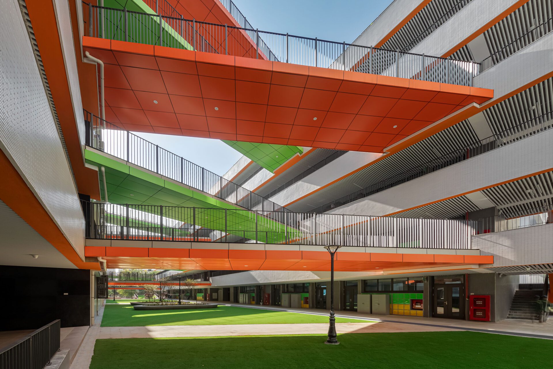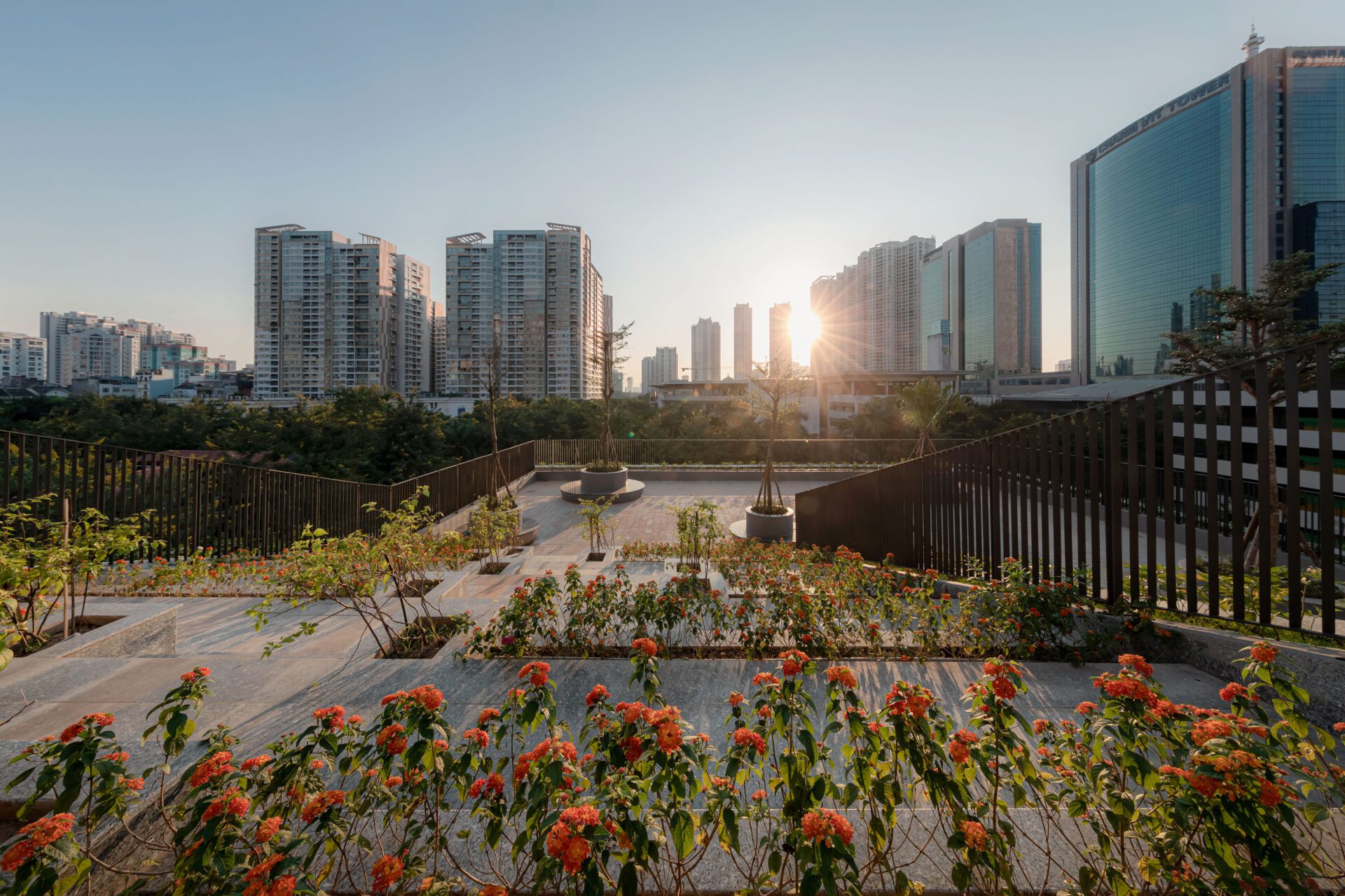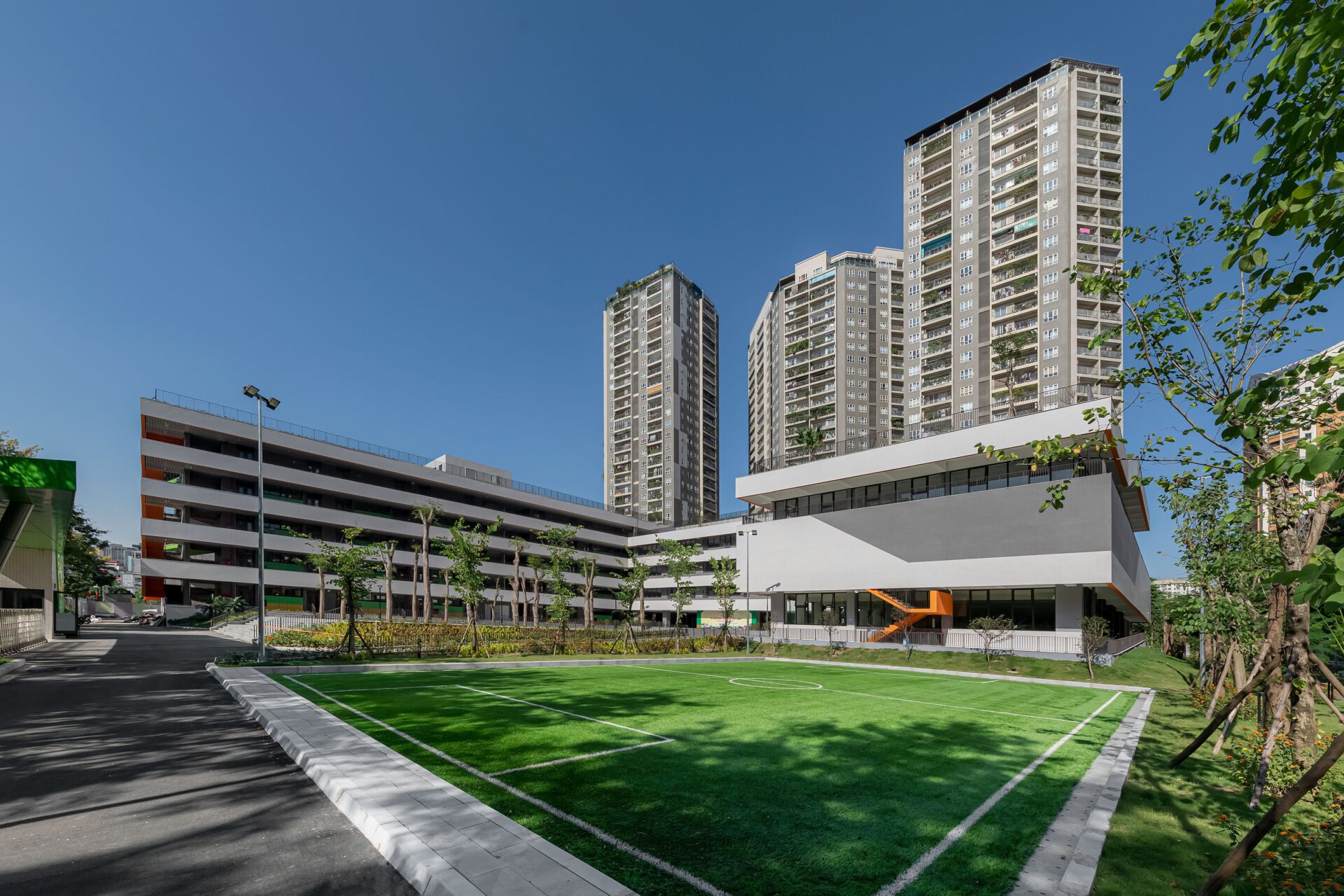 Started construction in September 2020 and located in an urban area with high construction density and dense population, the project has one basement, five floors, 44 classrooms, a multi-purpose building, and a national-standard swimming pool. Looking from the view of high apartment buildings, the school looks like an impressive ecological park. The design plan with a low construction density, and green trees planted in many layers from the school yard to its rooftop, have made the building stand out and simultaneously become one of the vital green highlights of the area.