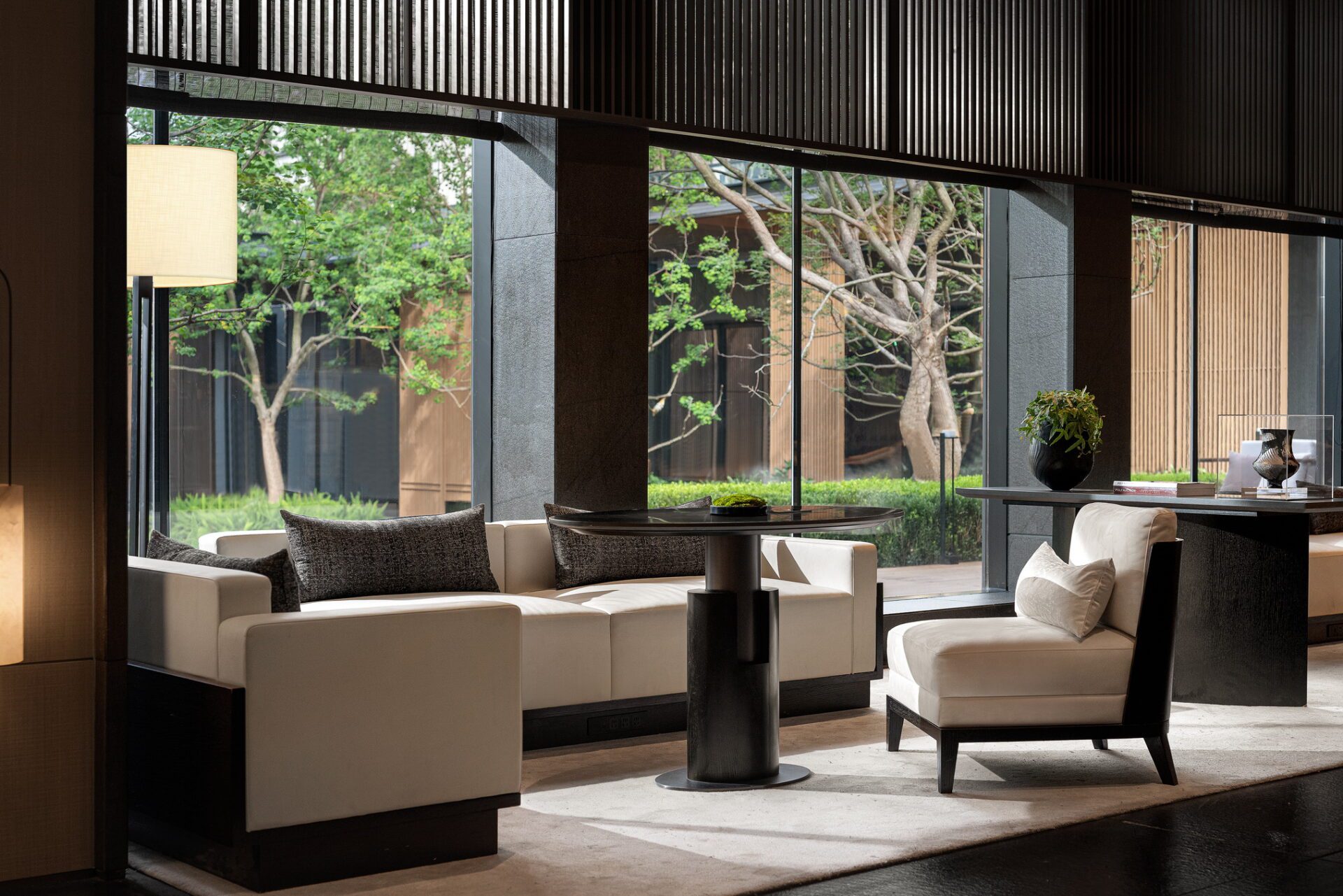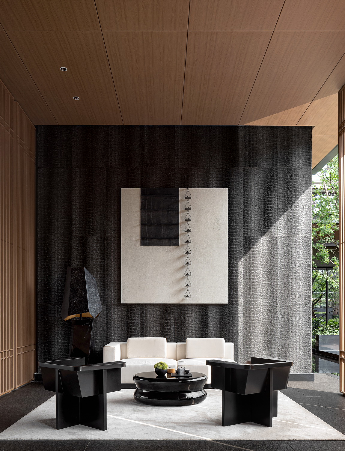 The project is located on Mu Ma Mountain in the west corner of Chengdu. The design integrates local traditional architecture with natural elements such as mountain and water. The color of black and white, the concise and neat lines, the material of bamboo (Chengdu is famous for planting bamboo), wood and marble, and the close relation with nature, combine modern aesthetics and traditional spirits. With commercial, art gallery, study, fitness, catering and other functional areas, the hotel offers "light luxury city hotel" experience deep in the mountains.
