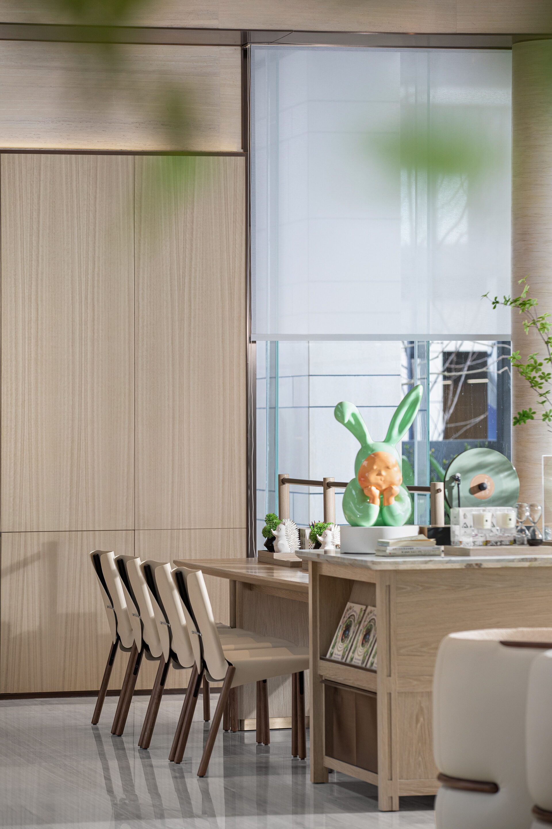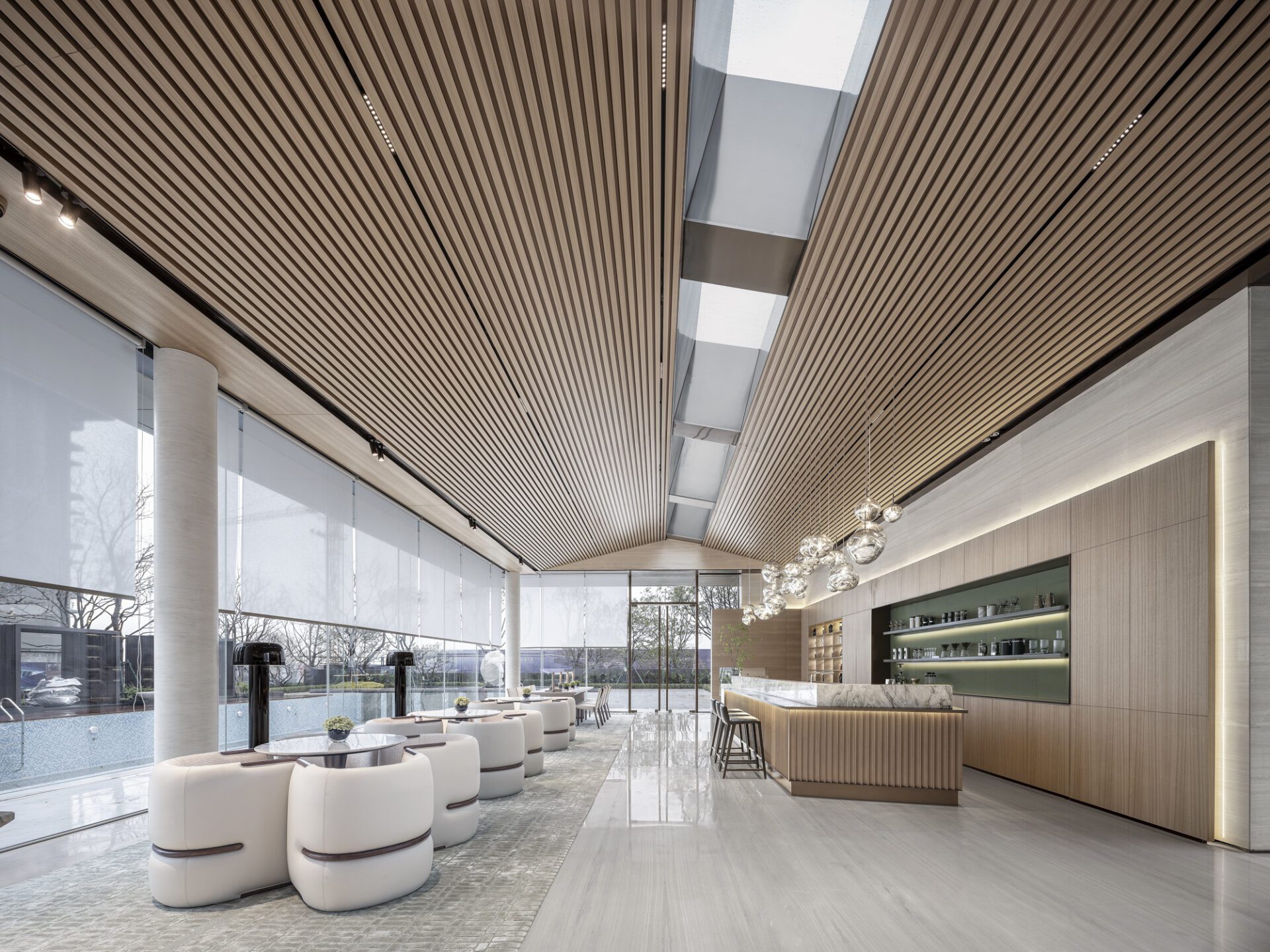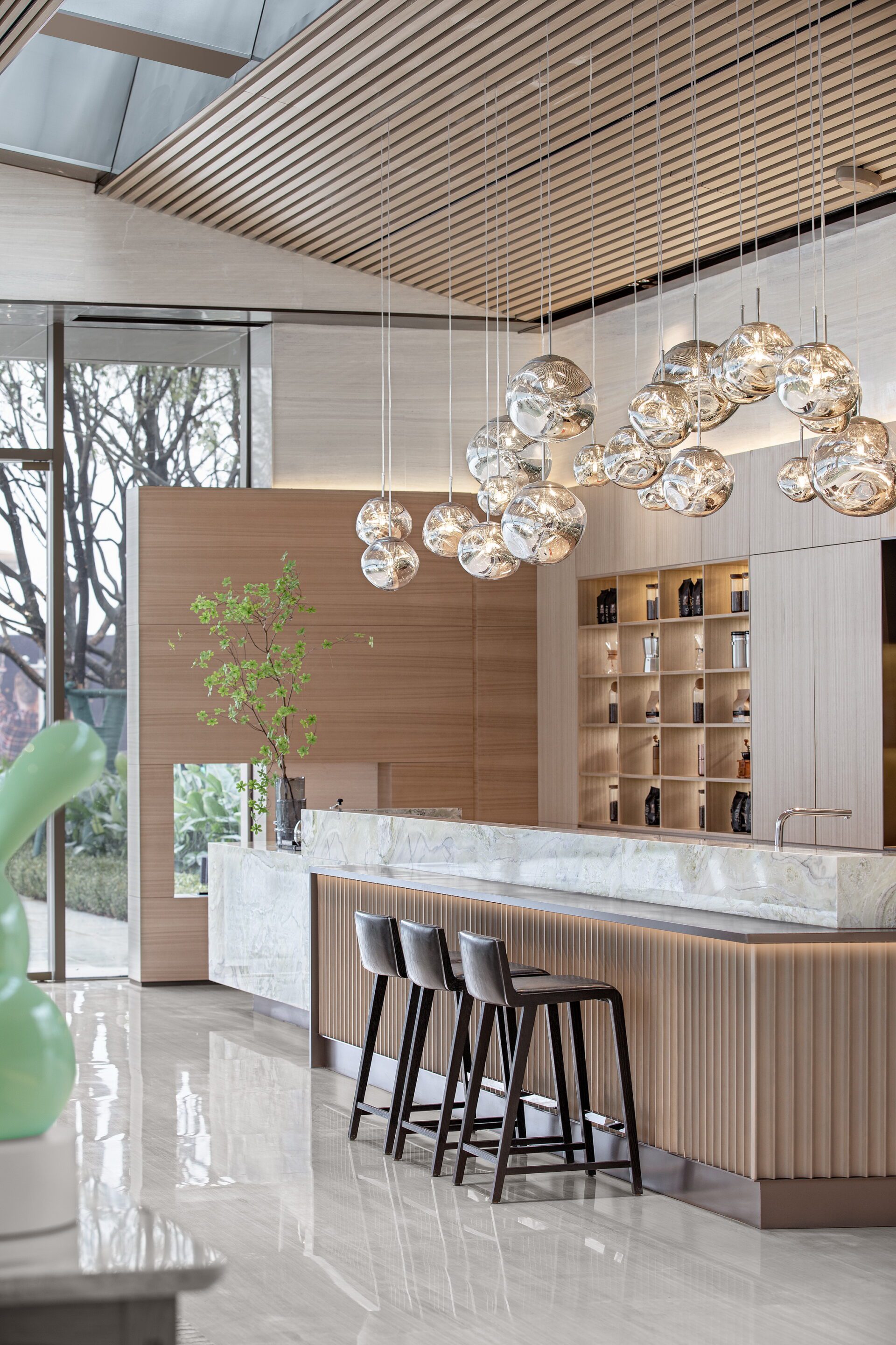 As the public space of the community, this project aims to provide a " aesthetic lifestyle museum" that combines nature and humanity. We combine high-end imported stone with natural wood, take white and log color as the keynote, abandon all complicated decoration, retain the original texture and texture of the material. The ceiling and the decorative surface below the bar are decorated with vertical wooden lines. They respond to each other, injecting some visual changes into the whole space. Both façades use large glass windows, allowing the indoor and outdoor scenery to penetrate each other, condensing the most beautiful landscape art into the space, and enhancing the interaction between man and nature.