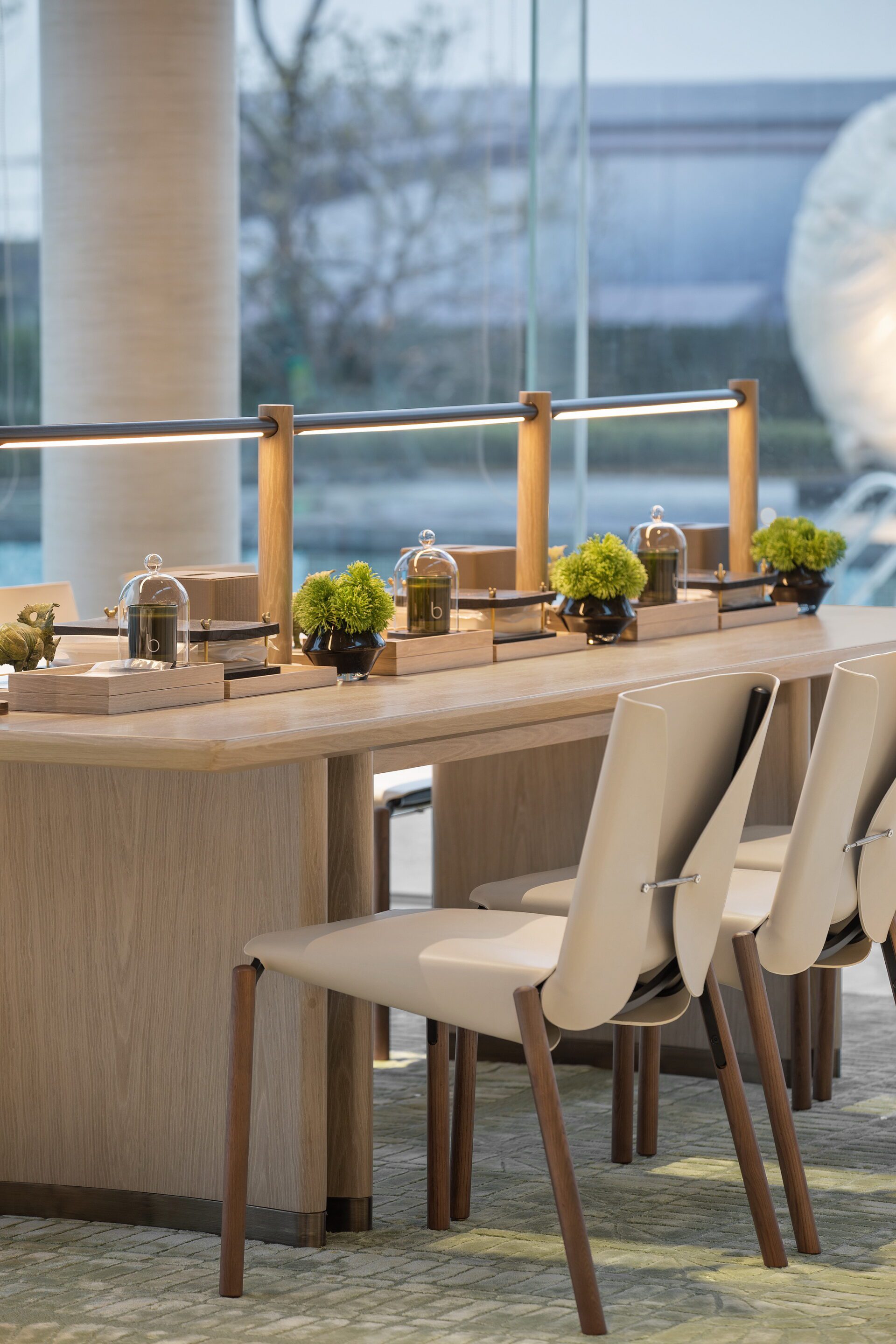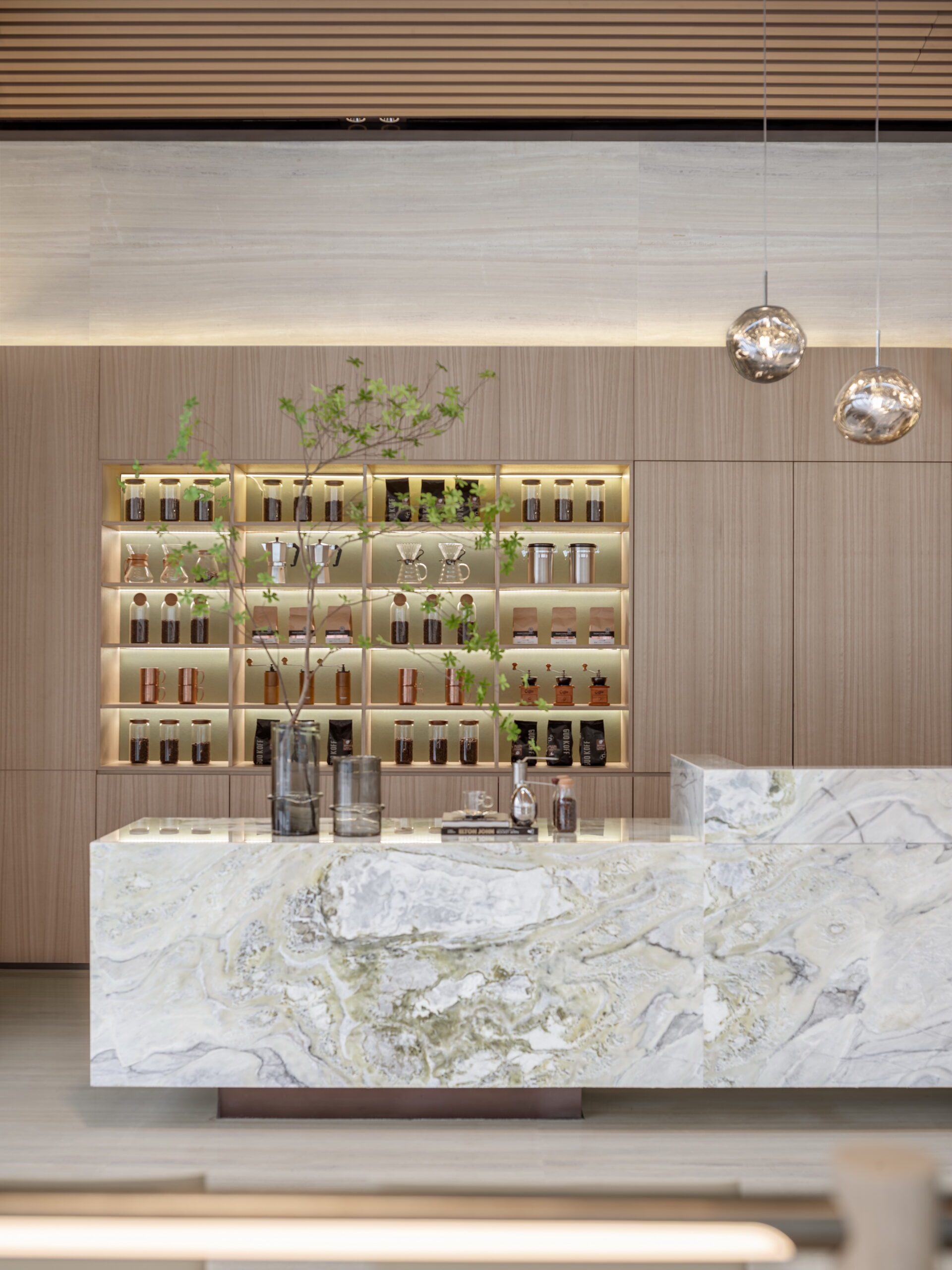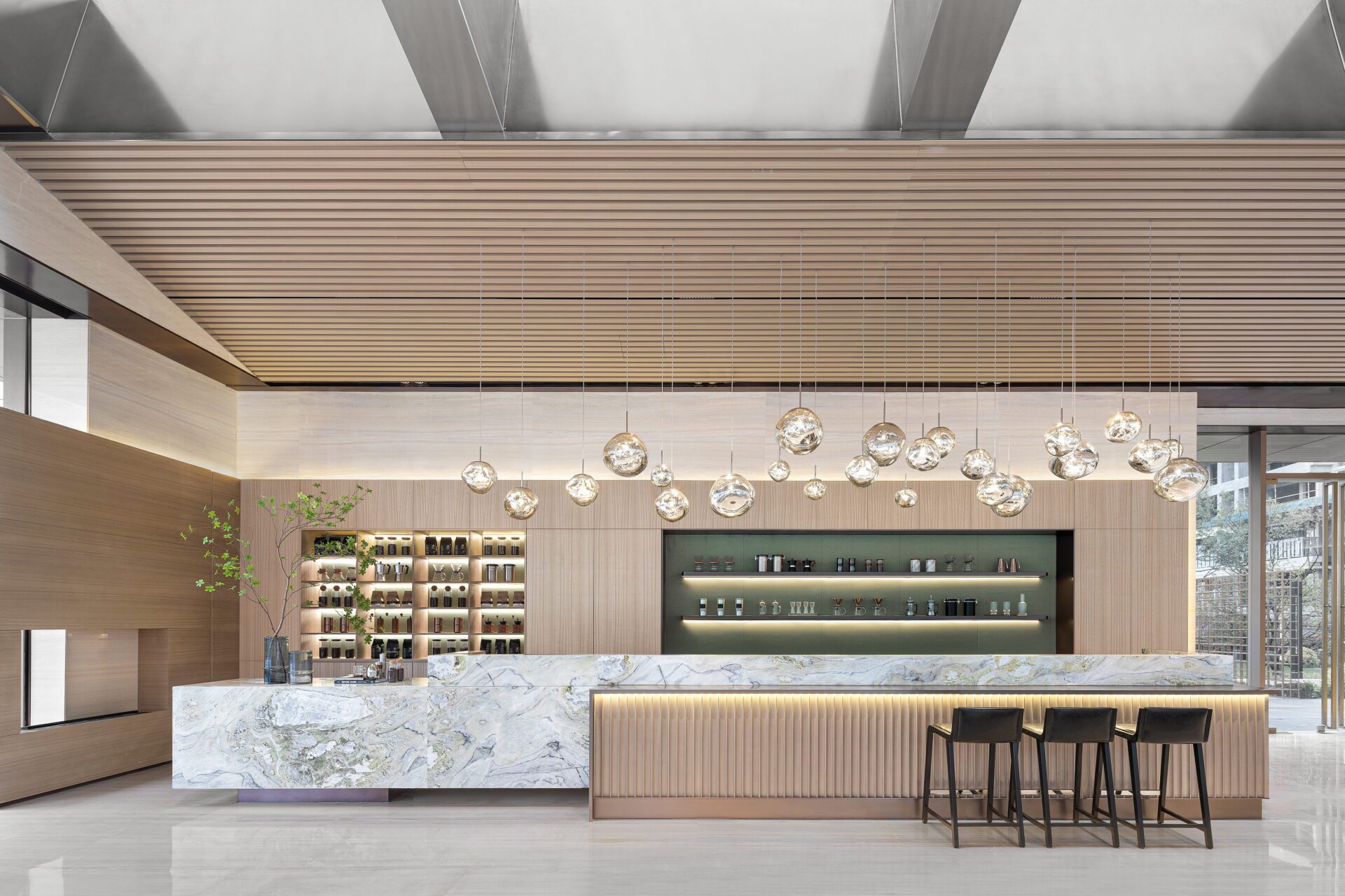As the public space of the community, this project aims to provide a " aesthetic lifestyle museum" that combines nature and humanity. We combine high-end imported stone with natural wood, take white and log color as the keynote, abandon all complicated decoration, retain the original texture and texture of the material. The ceiling and the decorative surface below the bar are decorated with vertical wooden lines. They respond to each other, injecting some visual changes into the whole space. Both façades use large glass windows, allowing the indoor and outdoor scenery to penetrate each other, condensing the most beautiful landscape art into the space, and enhancing the interaction between man and nature.