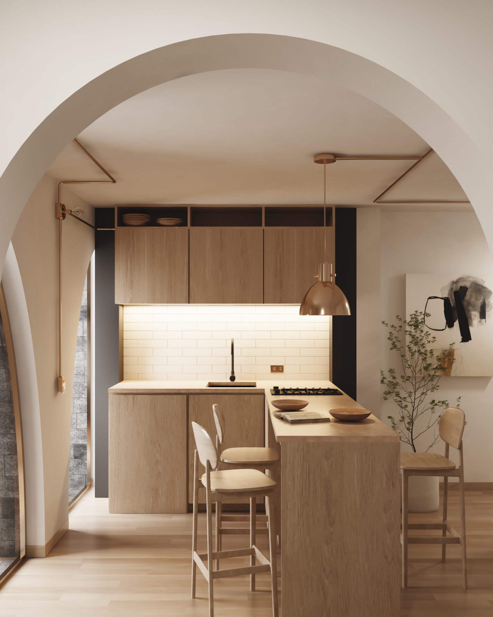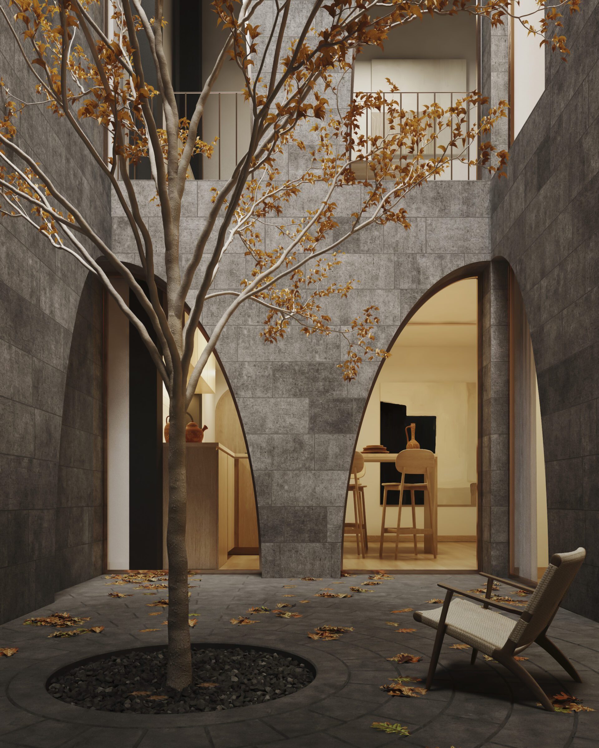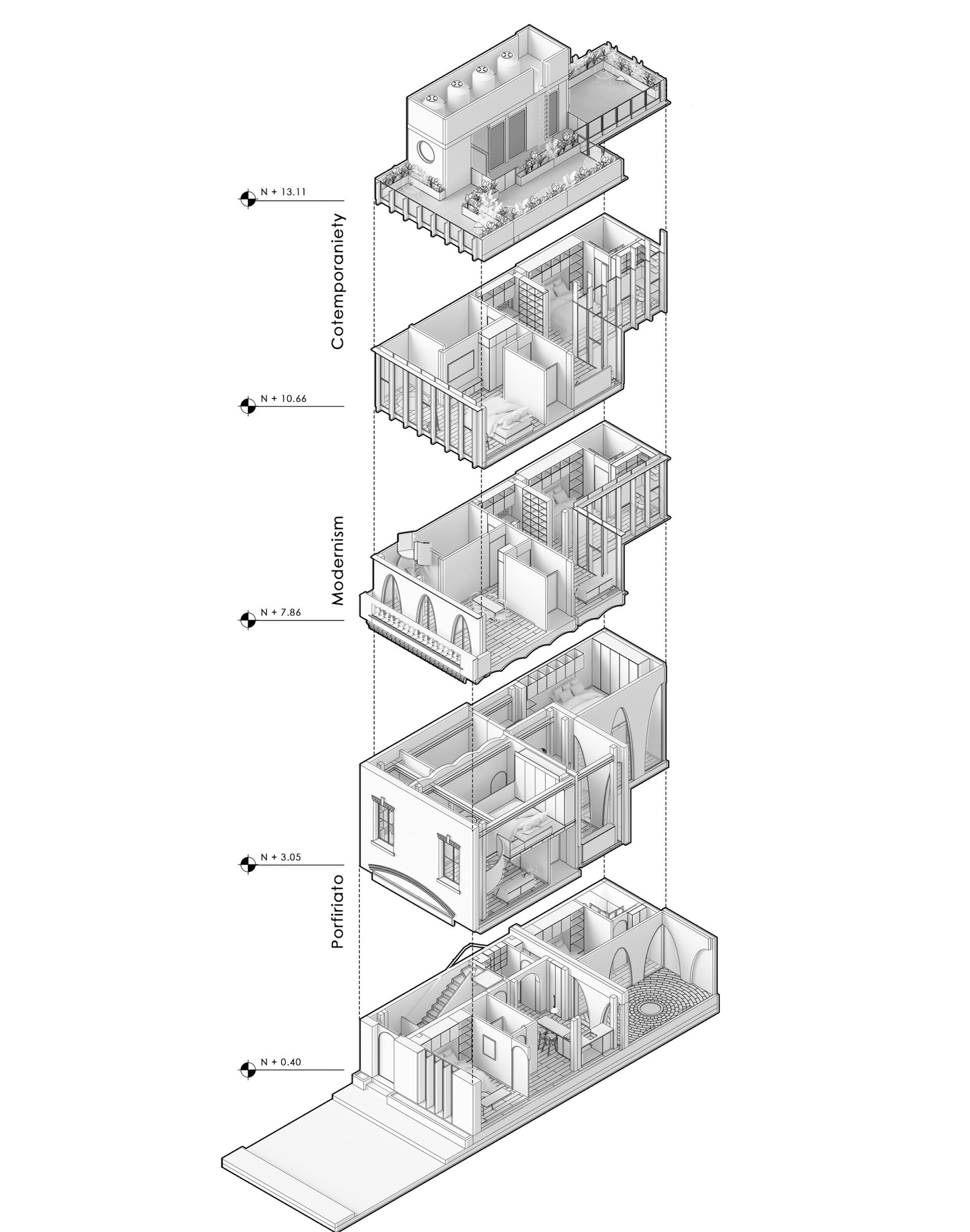 The project proposes to renovate an old house built in 1905. It aims to integrate the building’s architectural evolution, incorporating both the old and the modern, and is inspired by a poetic fragment of Octavio Paz, who is himself believed to have been born in the house: “An edifice made of time: what was, what will be, what is.” The interior emerges out of an organic minimalism that manifests itself through bright and pure spaces. These introspective spaces also provide new interpretations of ‘family’; embodied by future generations of young people who will come to variously experience the building as an art studio, office and bedroom, through isolation and a connection between light and silence. The Patio pays tribute to the universal legacy of modernity through its catenary arches, while the interior design proposes to re-inhabit a ruin through new ways of living and a poetic atmosphere of isolation. After the events of this year and the last, how is housing currently perceived?