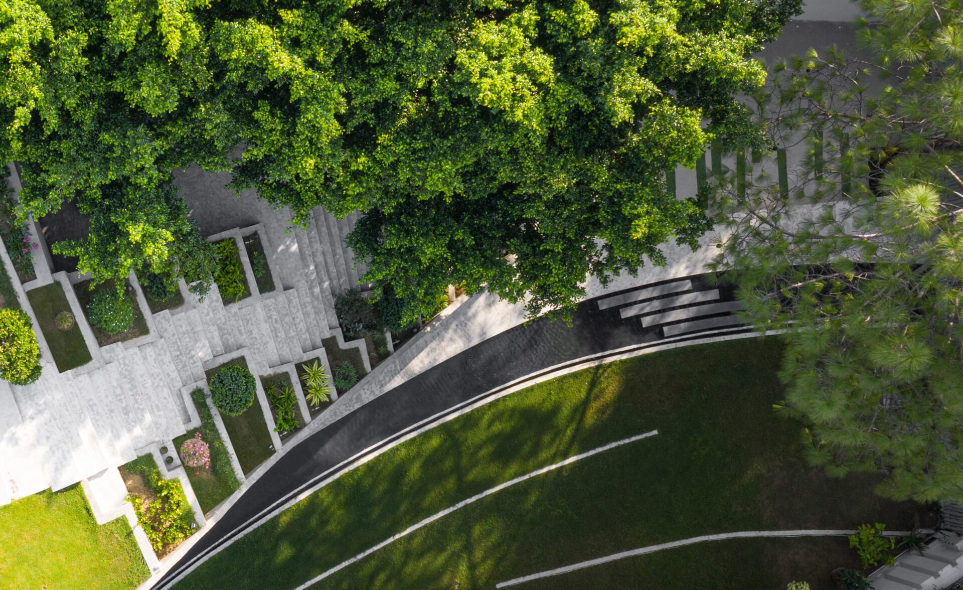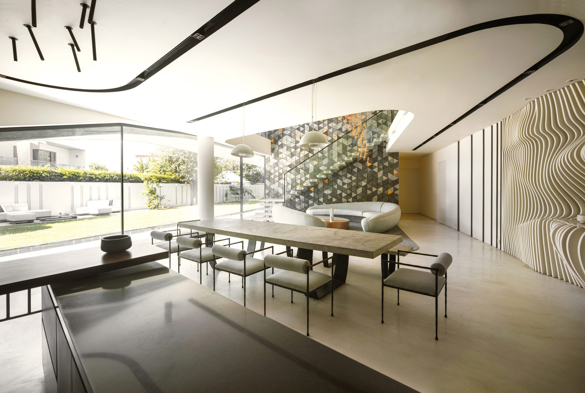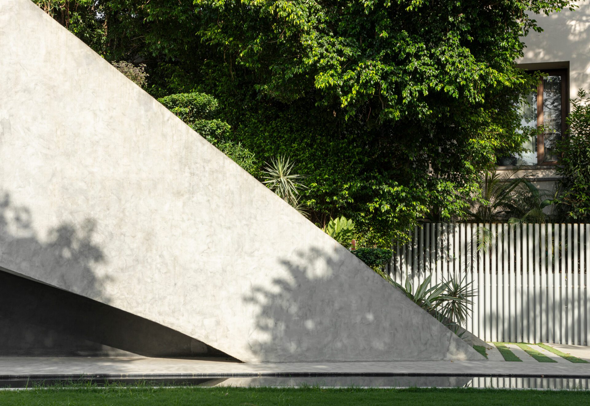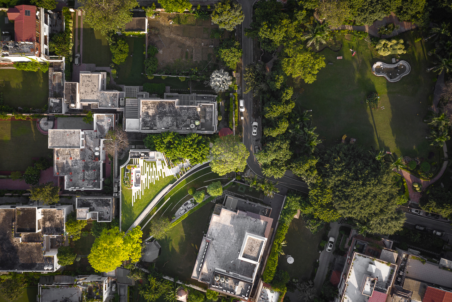 The built form emerges from the landscape and blends the ground floor with the roof of the building, creating an outdoor connective spine for the villa. The odd shape of the plot along with the views to the neighbourhood park were used as design drivers. The built form is strategically placed on one edge of the site, resulting in a generous landscaped garden on west side of the plot which opens up to the double height family living & dining, thereby extending as an outdoor living room. The three large existing trees on site have been retained, creating zones of shadow in the landscape and also help in reducing the sun exposure of the villa.