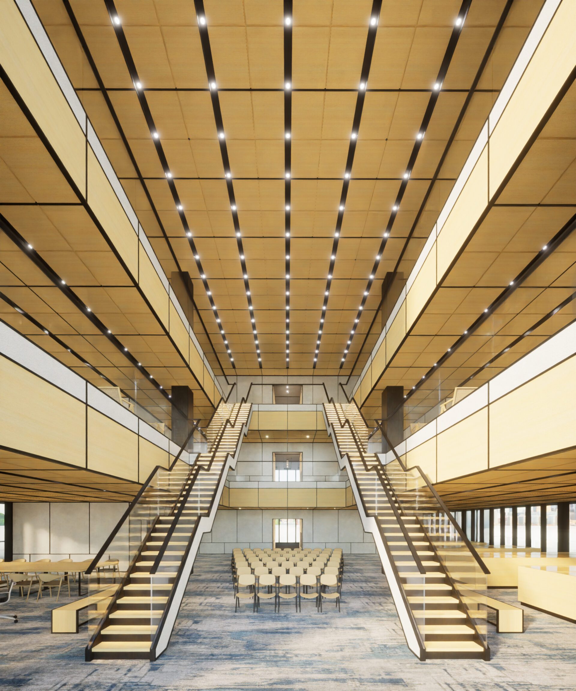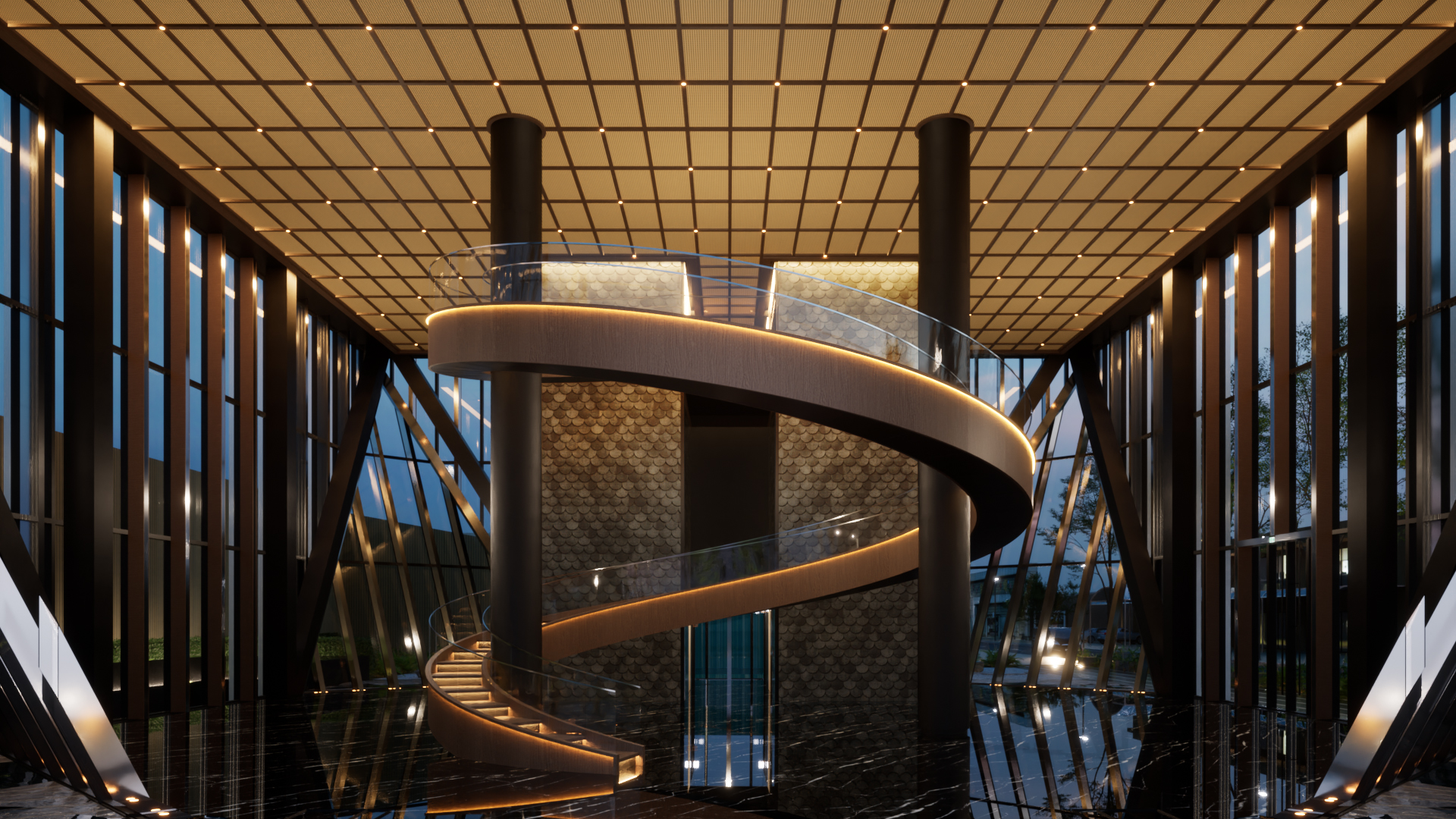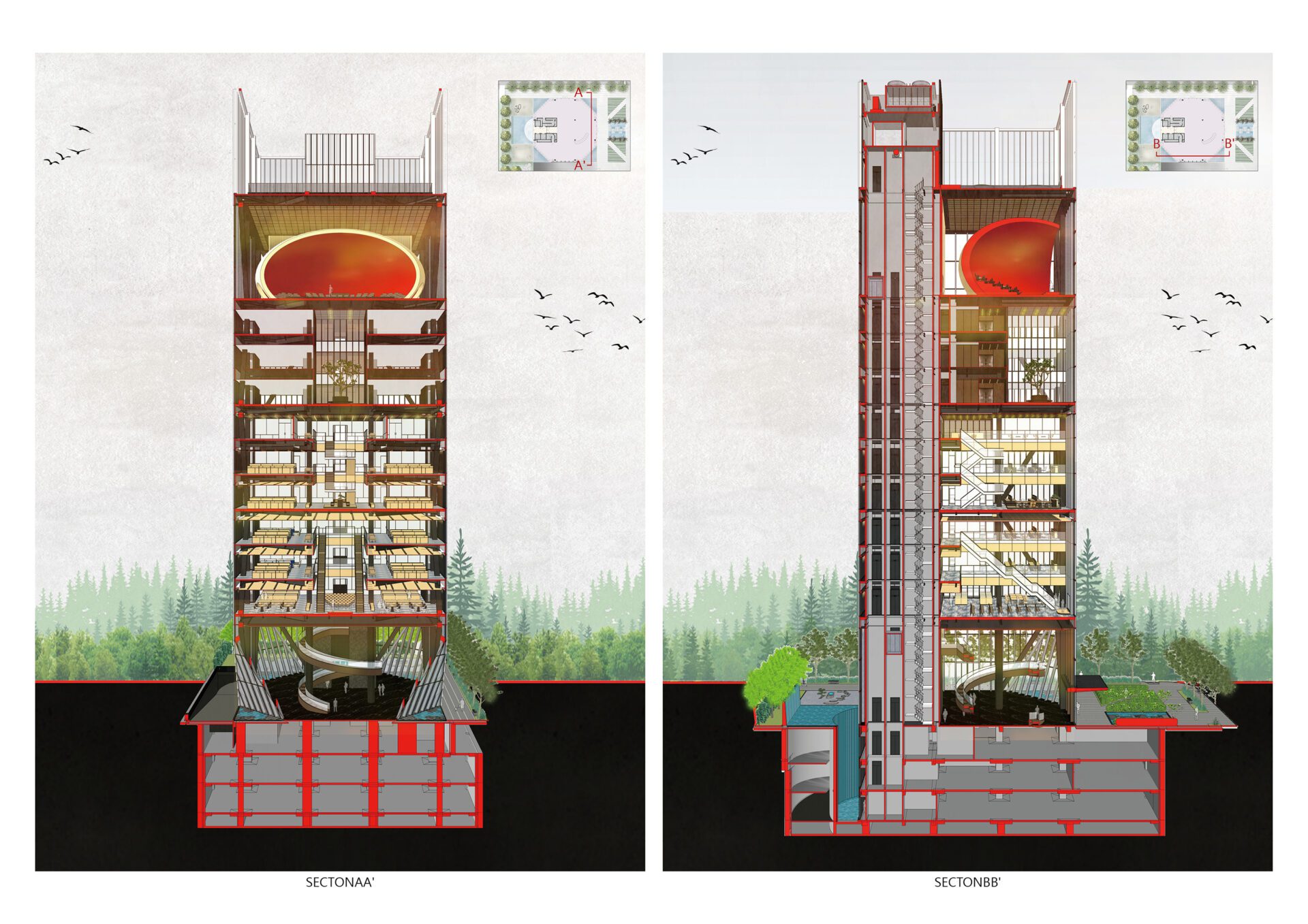 To perform the concept of “a house inside a garden,” five sets of houses were created and stacked on top of each other in this headquarter building. Each of these houses features a three-story-tall “garden” in the middle of its massing. These “gardens” not only improve the spatial quality of work environment but also provide direct visual connection to the floors across, below and above.