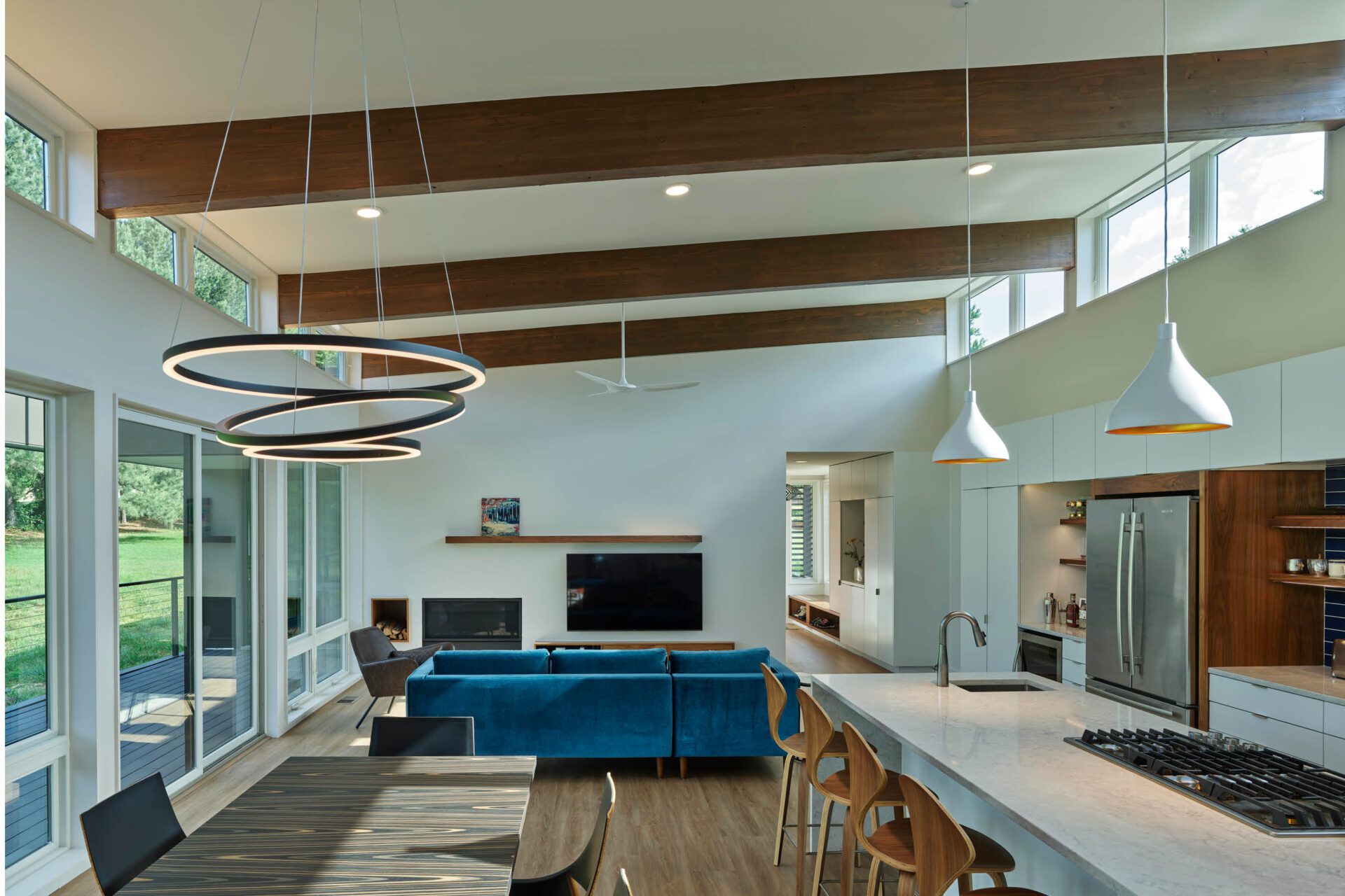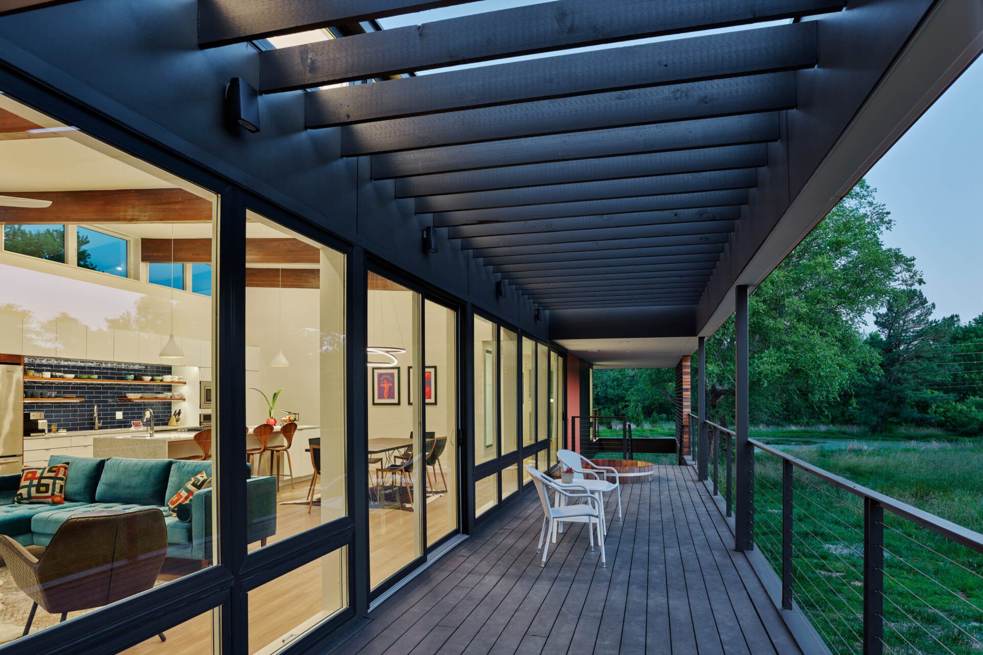 The Willis Residence is a single-family house sited outside the eastern city limits of Fayetteville, Arkansas in an area dominated by late 20th century suburban homes. The house projects a horizontal wood volume across a gently sloping terrain while assimilating simple form and natural materials into a predominately suburban context. Willis Residence sits perpendicular to the gentle slope between two converging swales and overlooks a small pond on the south end of the property. The house is aligned with the neighbor to the north, but pivots slightly to frame the view and expand the yard to the west.