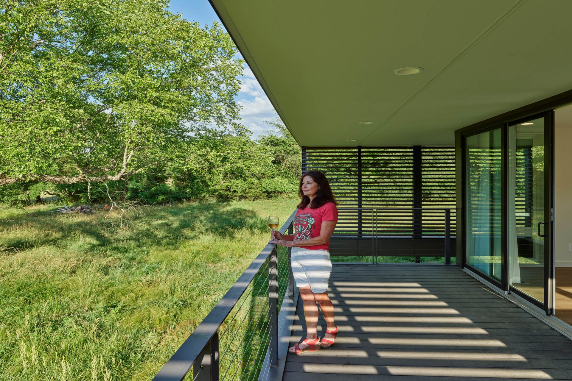 The home presents a reserved face to the street composed of clerestory windows and select screening elements that dissolve the austere elevation near the edges. The primary volume of the house is clad in a clear finished cypress with dark voids carved out for the entry, balconies, and overhangs. Bands of clerestory windows articulate the underlying structure and extend above the roofline to let natural light into the central living area.