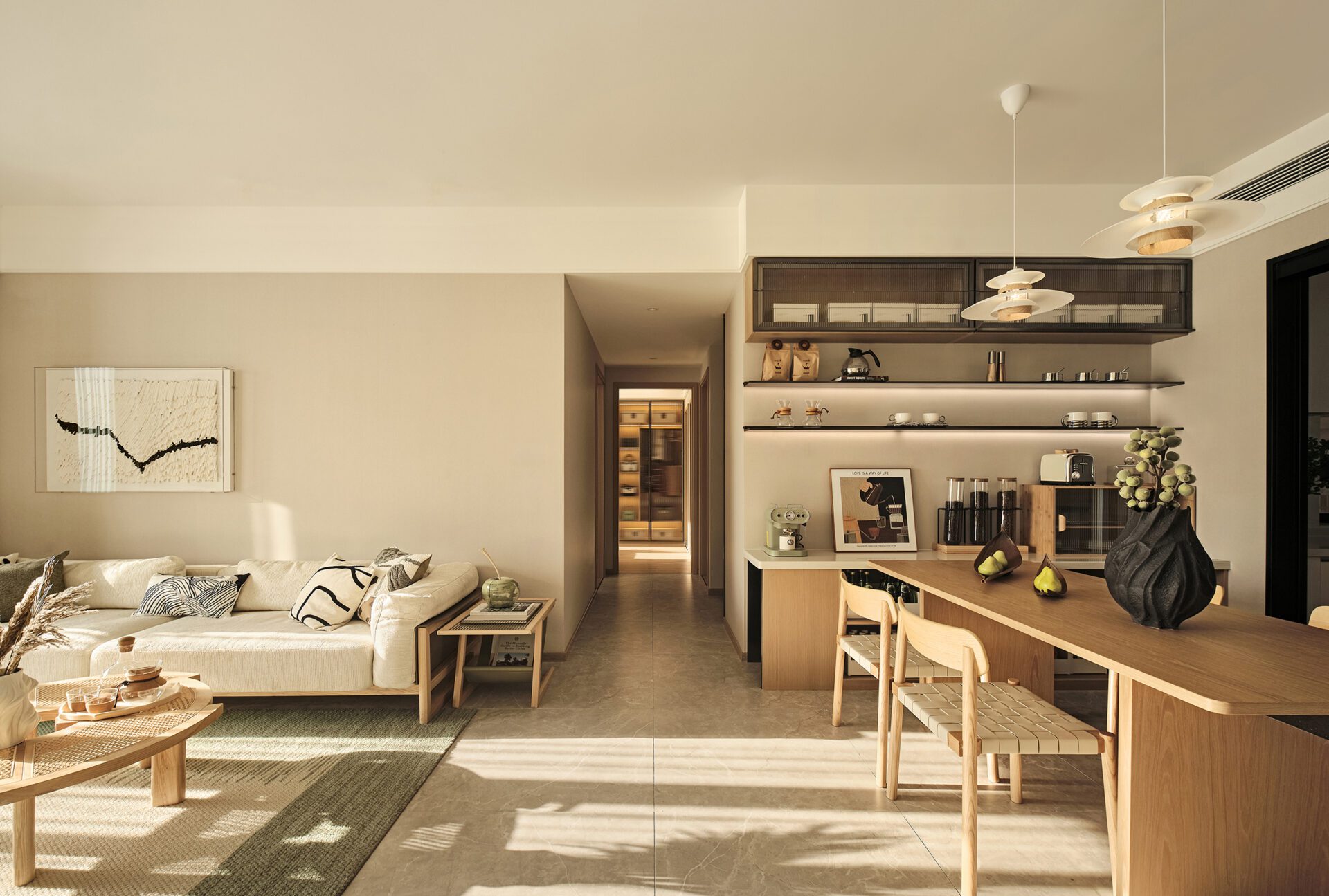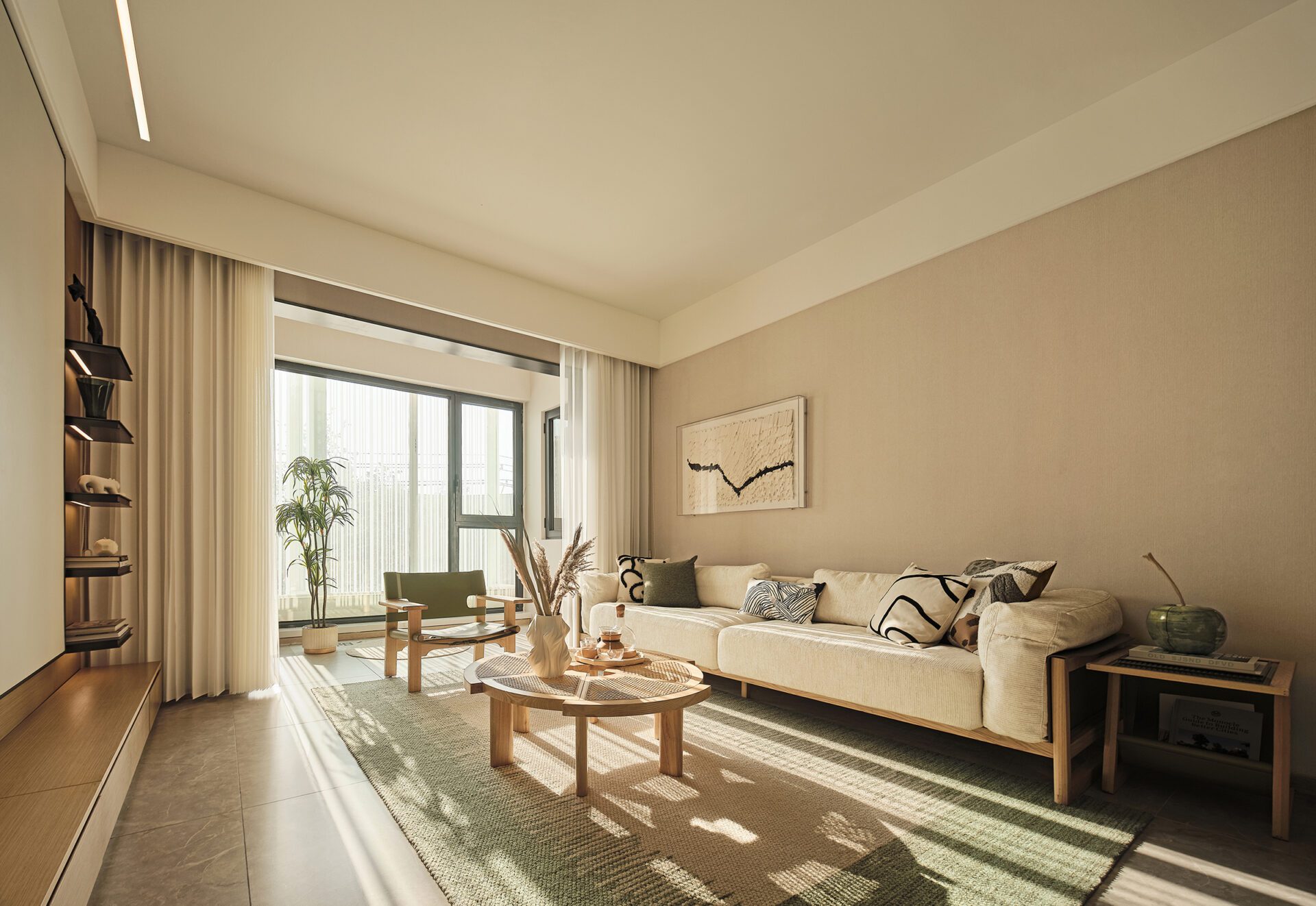 The log's primary hue and uncluttered, clean appearance of the living area represent a return to nature. There's a fluffy and cozy beige sofa, its gentle touch feel comfortable, adding a delicate creative conception to the minimalist environment. Well, it's a good choice to take pleasure in endlessly cozy time at home.