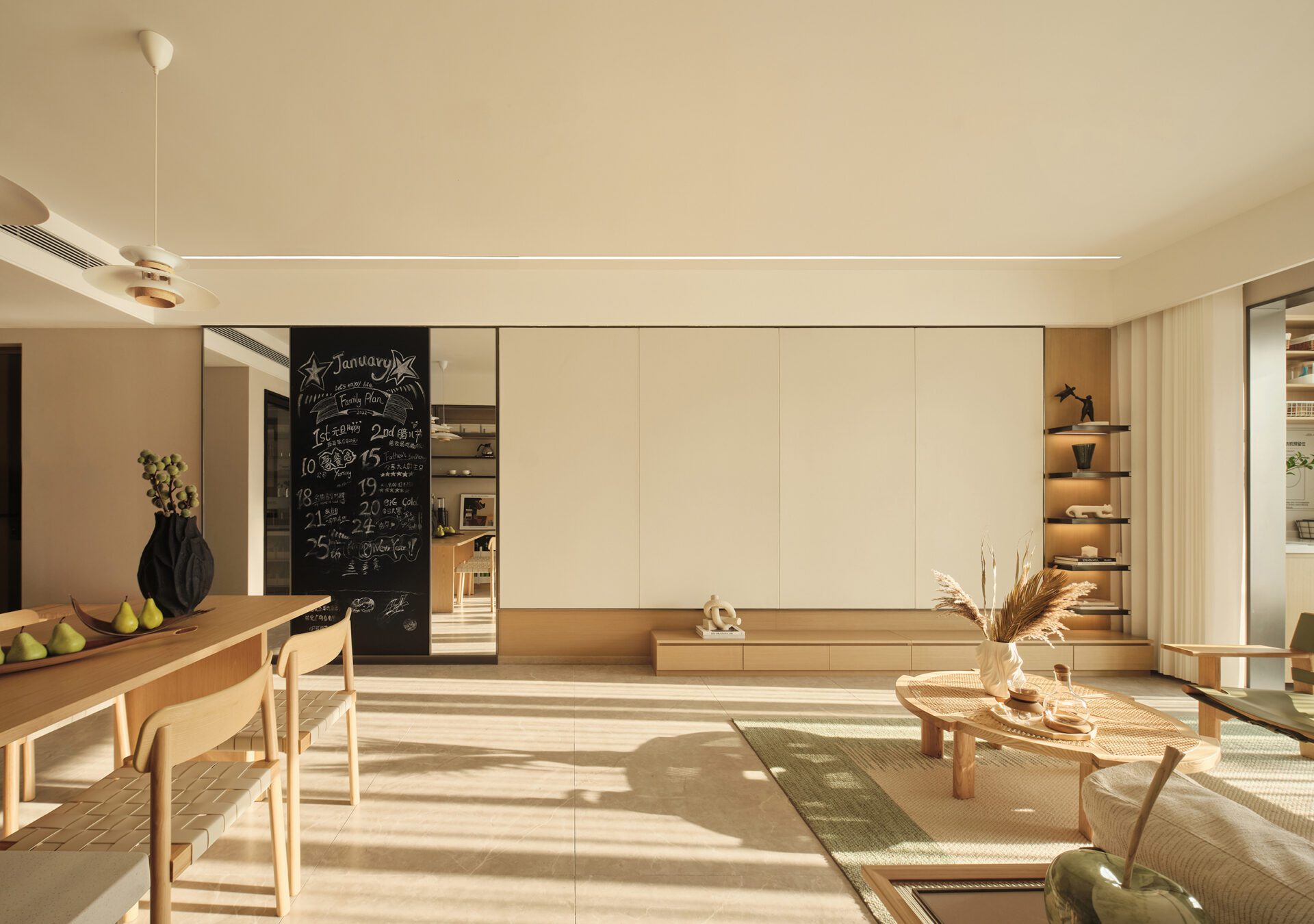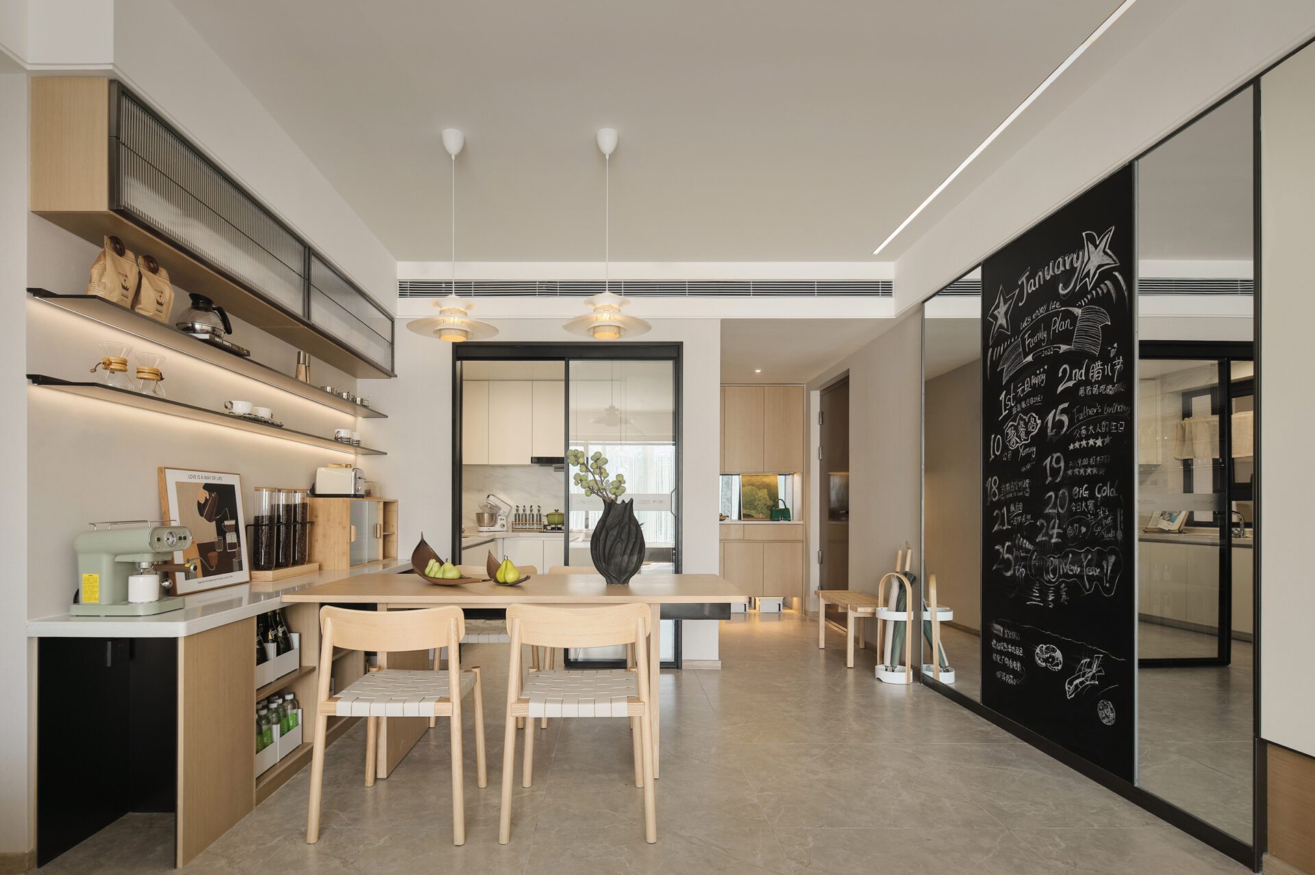 The cozy dining area, the intriguing blackboard wall, the wooden dining chairs, and the wooden utensils reflect the calmness of the room, creating a quiet and elegant atmosphere of the restaurant, which serves as both a dining establishment and a private bar where parents and children can gather together. It not only increases the perception of space overall but also gives the area a dynamic feel and opens up new opportunities for living. A leisurely light meal area is created by the equivalent side cabinet at the dining table, combined with the open shelf, the counter, and the cabinet body storage.