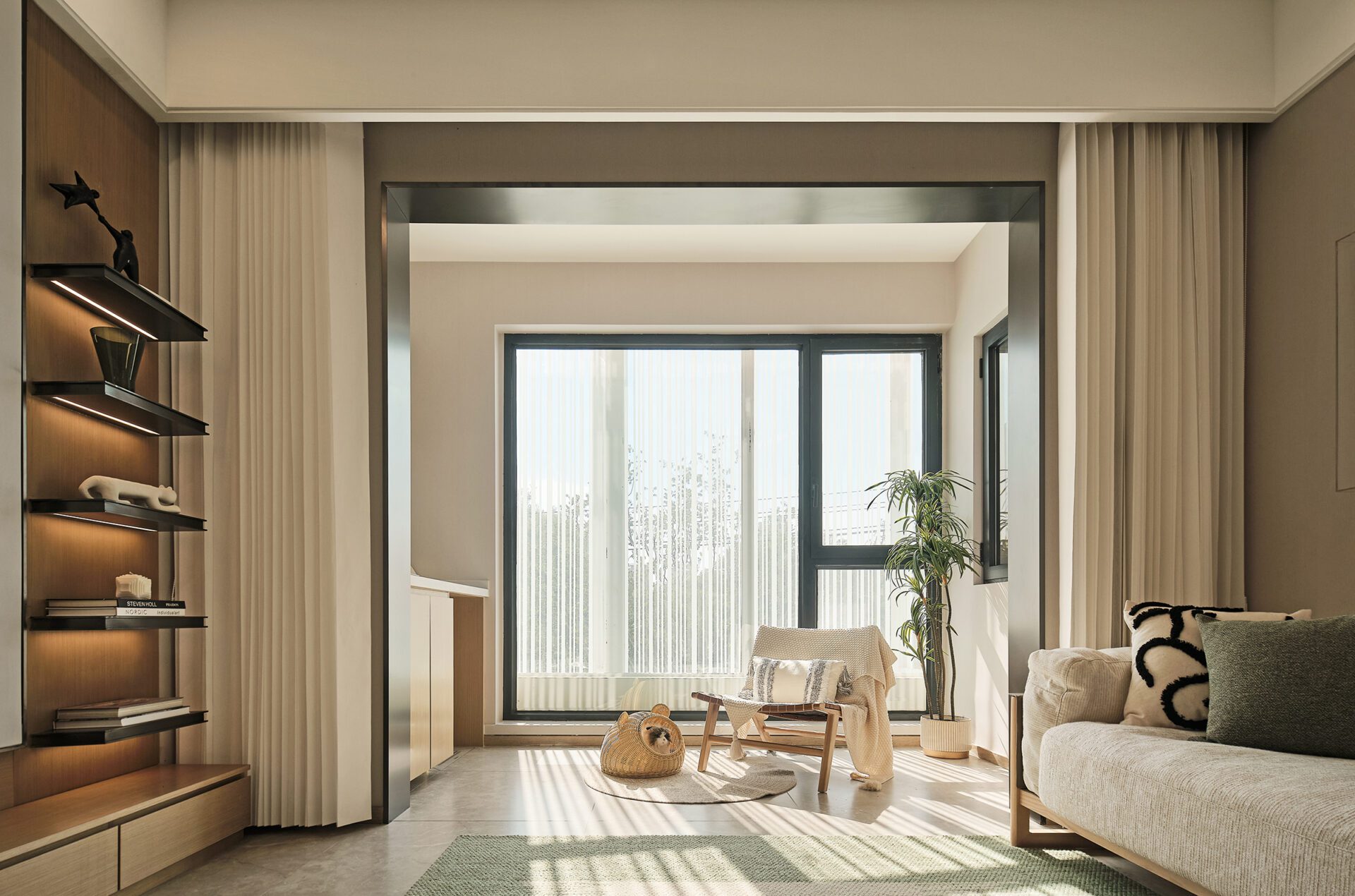 A compact kitchen facing the living room allows for cooking while interacting with family members instead of the conventional closed kitchen. The designer employs glass doors to ensure the transparent sight view between kitchen and the living room.
