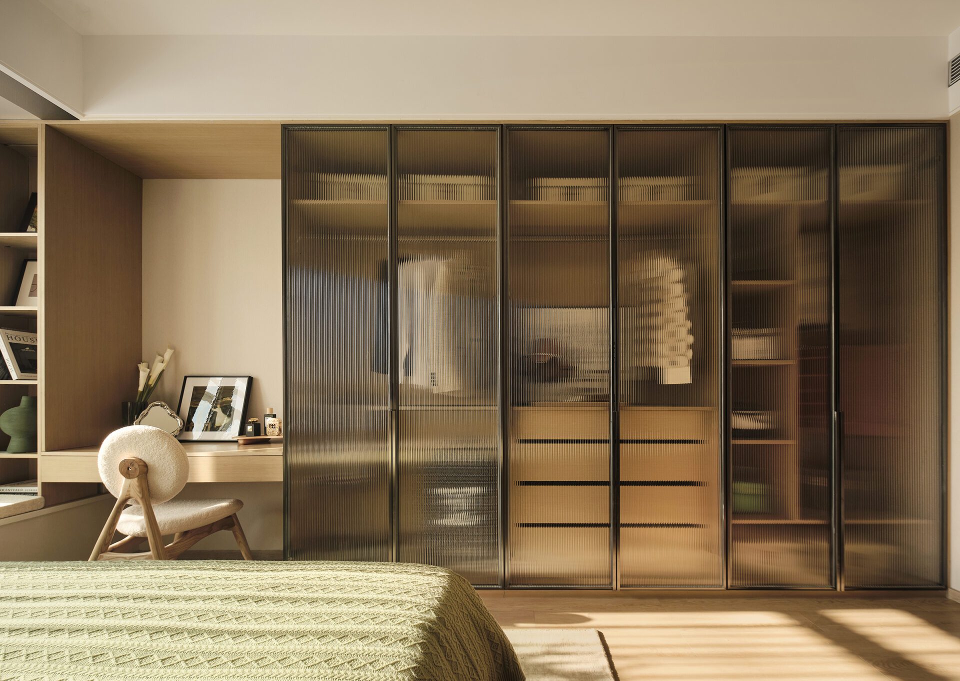The usual bed in the bedroom was replaced with a gigantic wardrobe that is more than 4 meters long and goes all the way up. Seven storage places are designated: a bay window storage area, a long clothing area, a short clothes area, a bag storage area, a drawer storage area, and a makeup desk area. By doing so, the cosmetics storage area looks bigger and is less susceptible to wetness, and employ translucent illumination into the space.