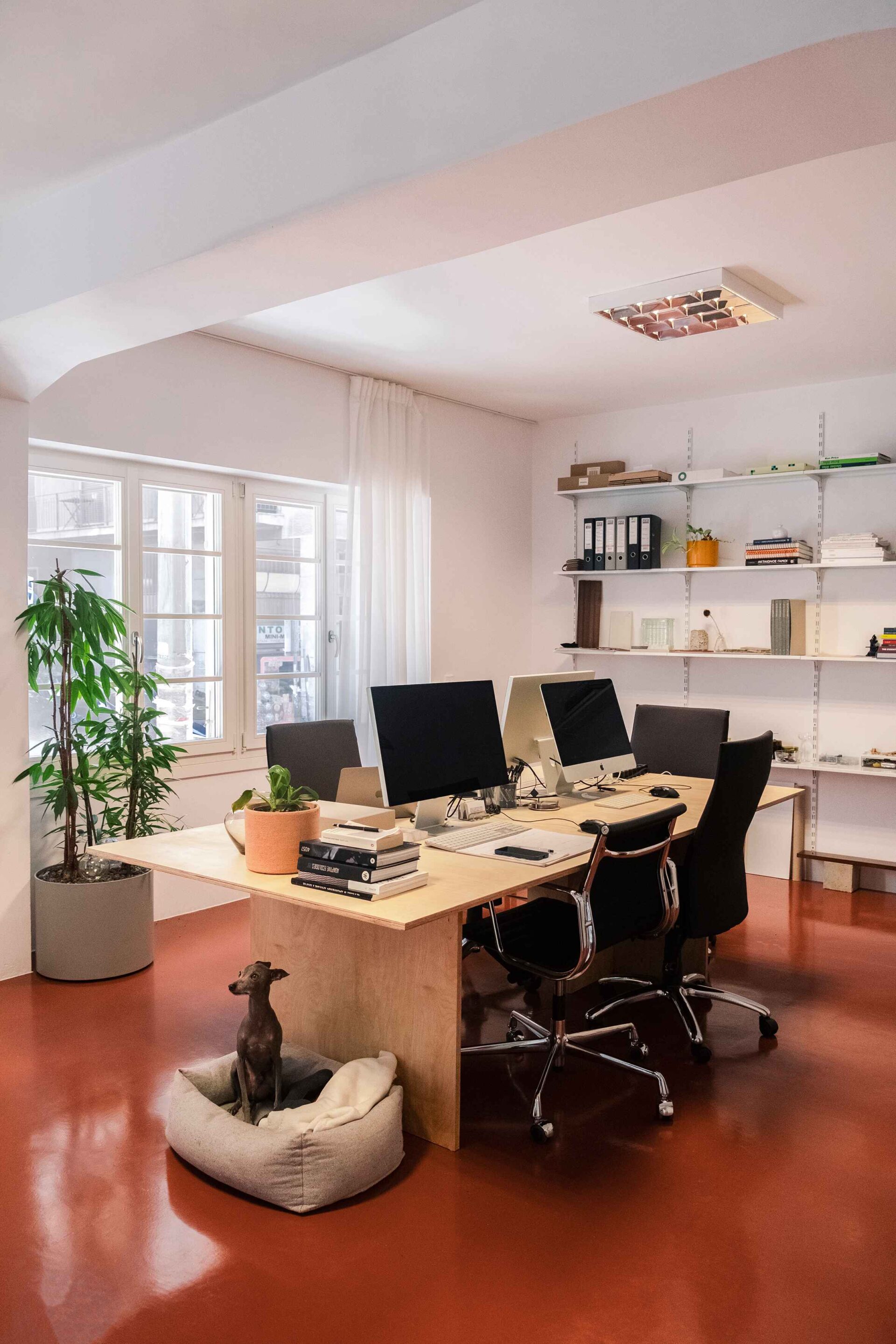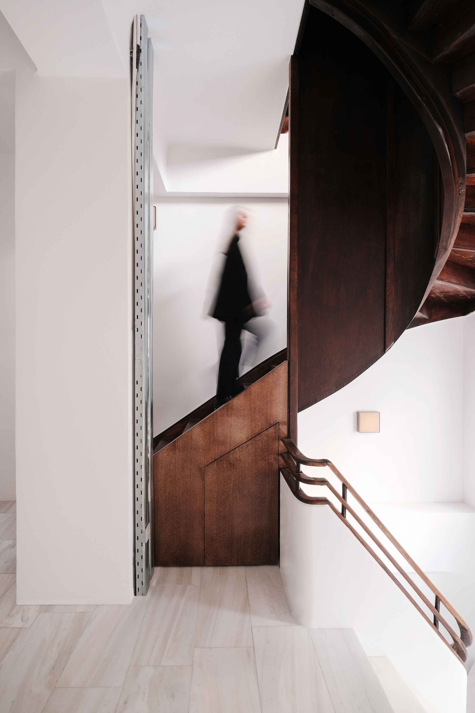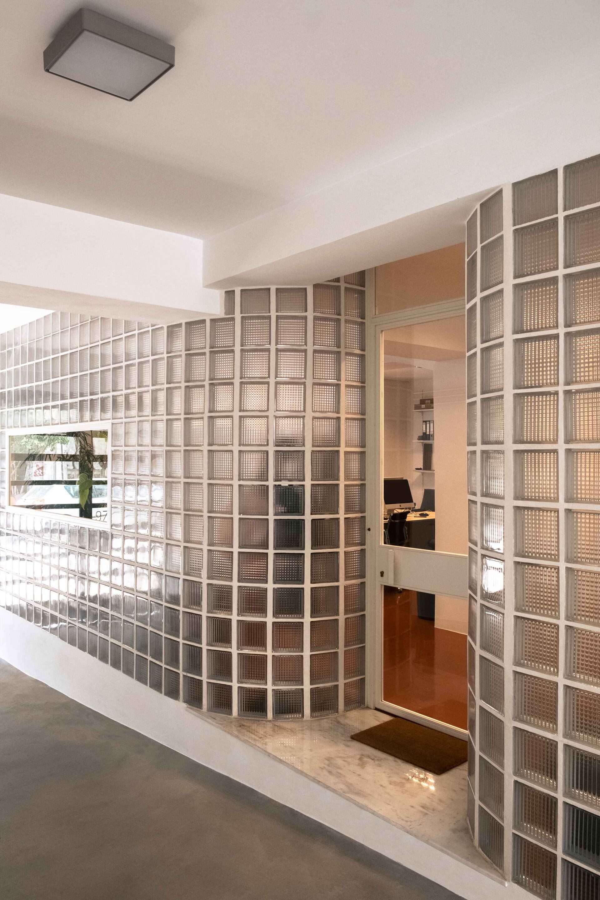 The restoration of the building was completed at the end of 2023. We decided to keep a multitude of details of the surviving building, while converting the interior into flexible spaces that can be customised for different use, in compliance to contemporary housing needs and in direct contrast to the strict floor plans of the original design. To that end, the wooden staircase - originally destined as private to one apartment - was renovated to serve as a common space staircase. The interior passageway leading to the two houses forms an alley, in a way expanding the city into the building. This was conserved, but the initial wall was substituted with glass tiles forming an office in synergy with the city. The terrazzo floor was preserved, emphasised by its adjacency to the epoxy floor that now frames it. The new penthouse was created in a way that functions as an index, or an x-ray, of the construction to where all the columns extend, resulting in a complex design that signifies the irregularities and liberties of the strict principles that A. Siagas followed in his work.