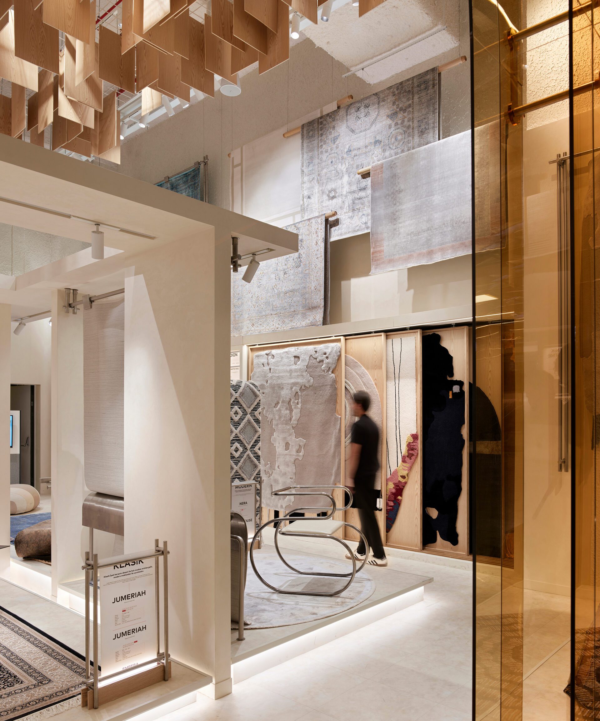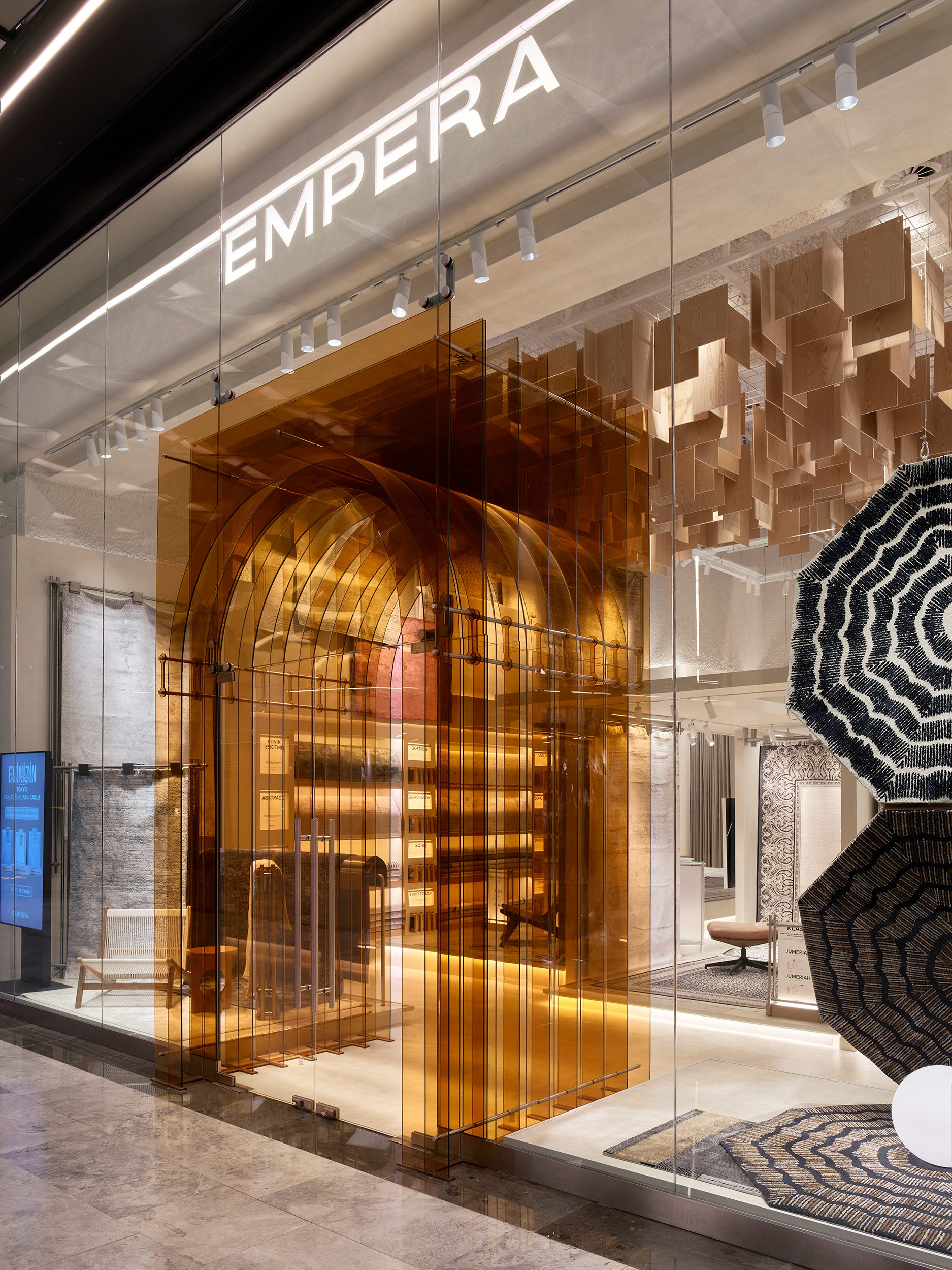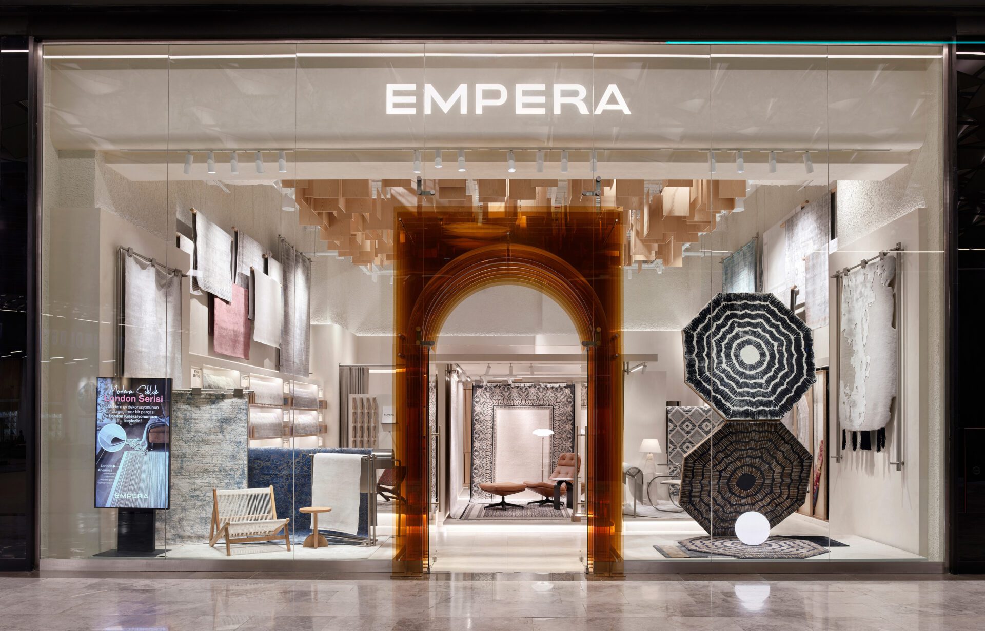 Moreover, from an architectural perspective, the touchpoints of the Empera store were created in parallel with the service design. The general language of the store featured natural wood, textured white tones, chrome details, and plexiglass surfaces, designed not to overshadow the carpet designs. Different types of carpets displayed in the store were unified in a single language, creating an effective lighting scenario that both focused on the carpets and distinguished the materials and textured surfaces used in the store, in collaboration with On - Off Lighting Design and Consultant firm. One of the most significant elements of the store design is the large, memorable plexiglass door, used as a striking signature inspired by the brand's color. From the façade, the uniquely staged and curated display areas, guided by the service design, allow visibility of every part of the store, helping to foster curiosity.