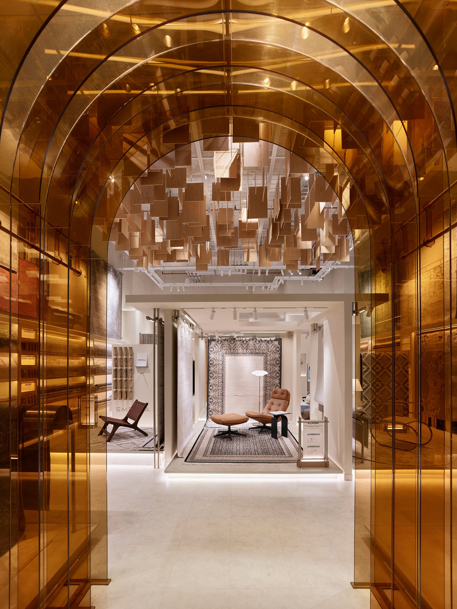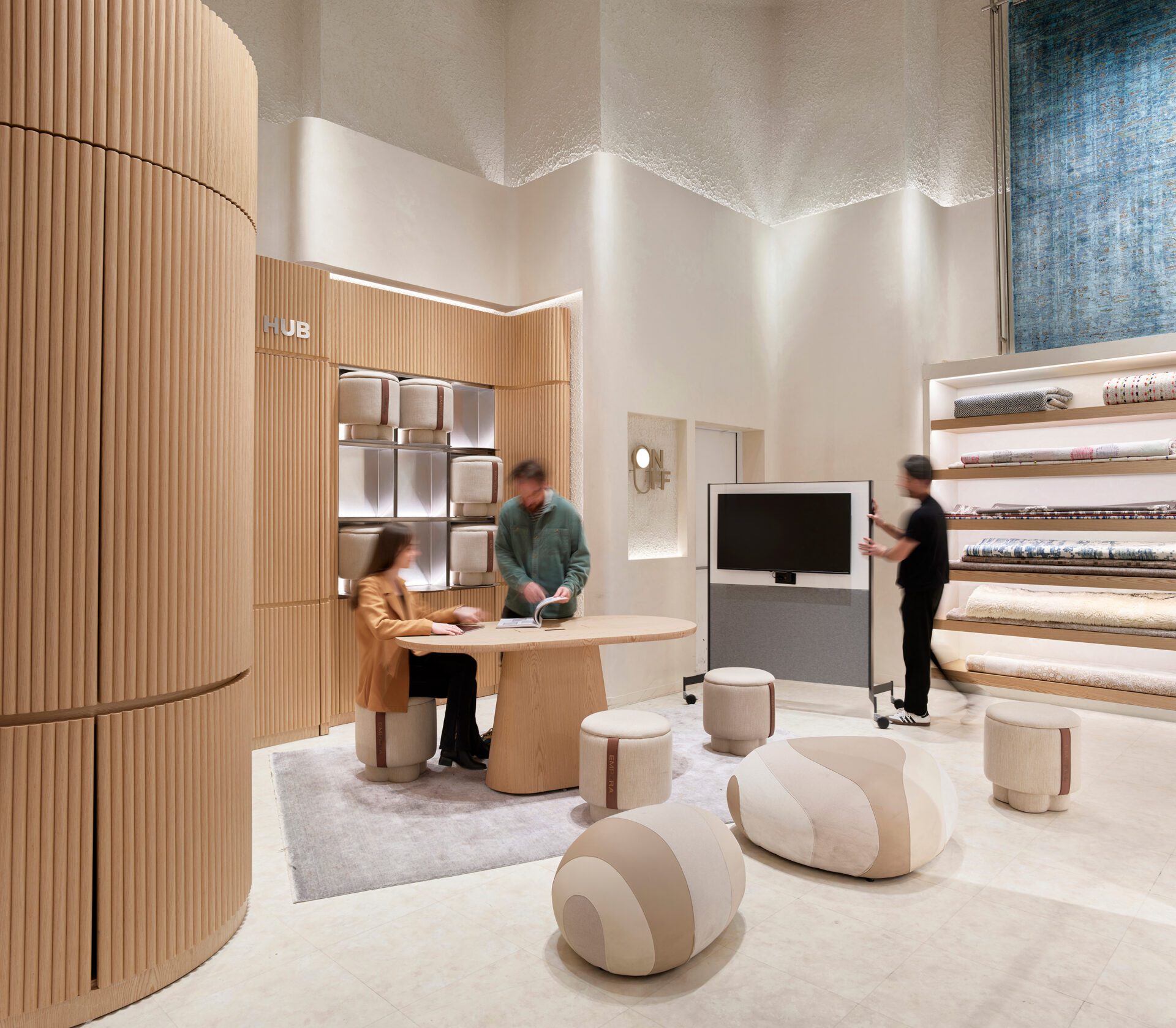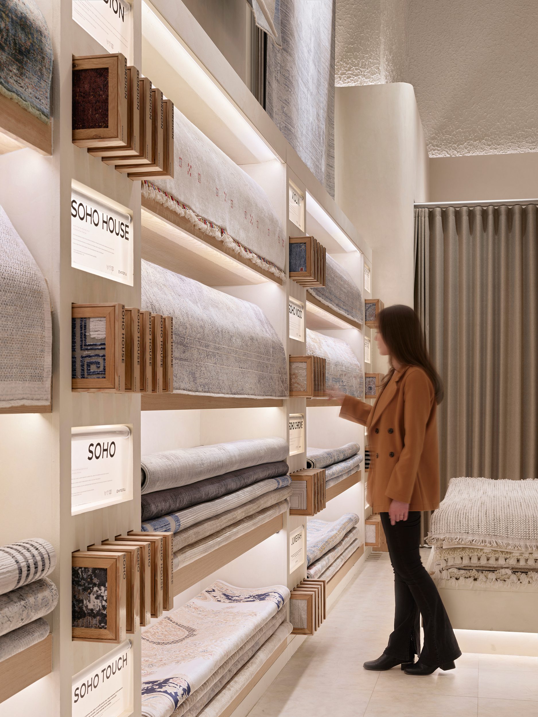Moreover, from an architectural perspective, the touchpoints of the Empera store were created in parallel with the service design. The general language of the store featured natural wood, textured white tones, chrome details, and plexiglass surfaces, designed not to overshadow the carpet designs. Different types of carpets displayed in the store were unified in a single language, creating an effective lighting scenario that both focused on the carpets and distinguished the materials and textured surfaces used in the store, in collaboration with On - Off Lighting Design and Consultant firm. One of the most significant elements of the store design is the large, memorable plexiglass door, used as a striking signature inspired by the brand's color. From the façade, the uniquely staged and curated display areas, guided by the service design, allow visibility of every part of the store, helping to foster curiosity.