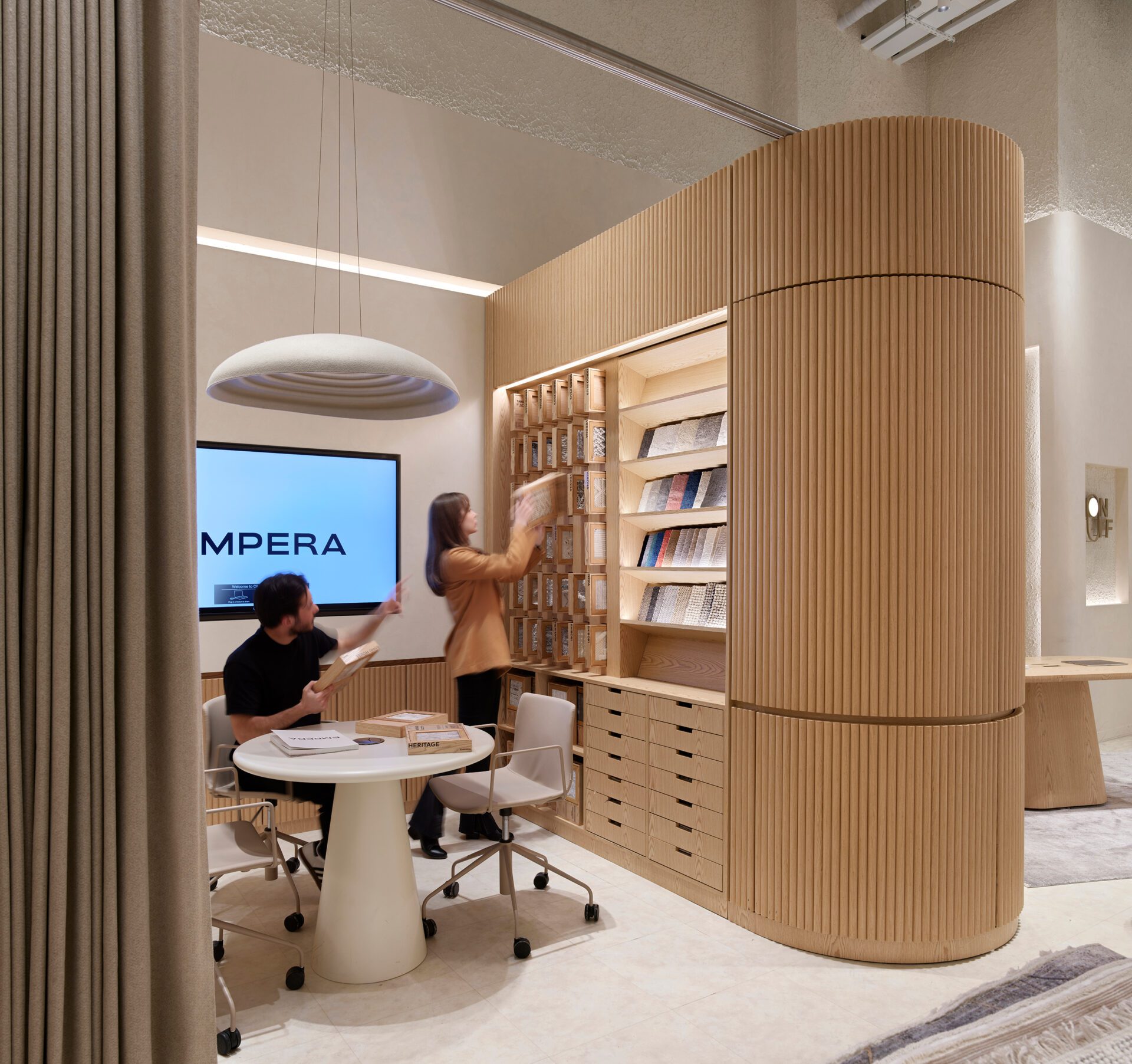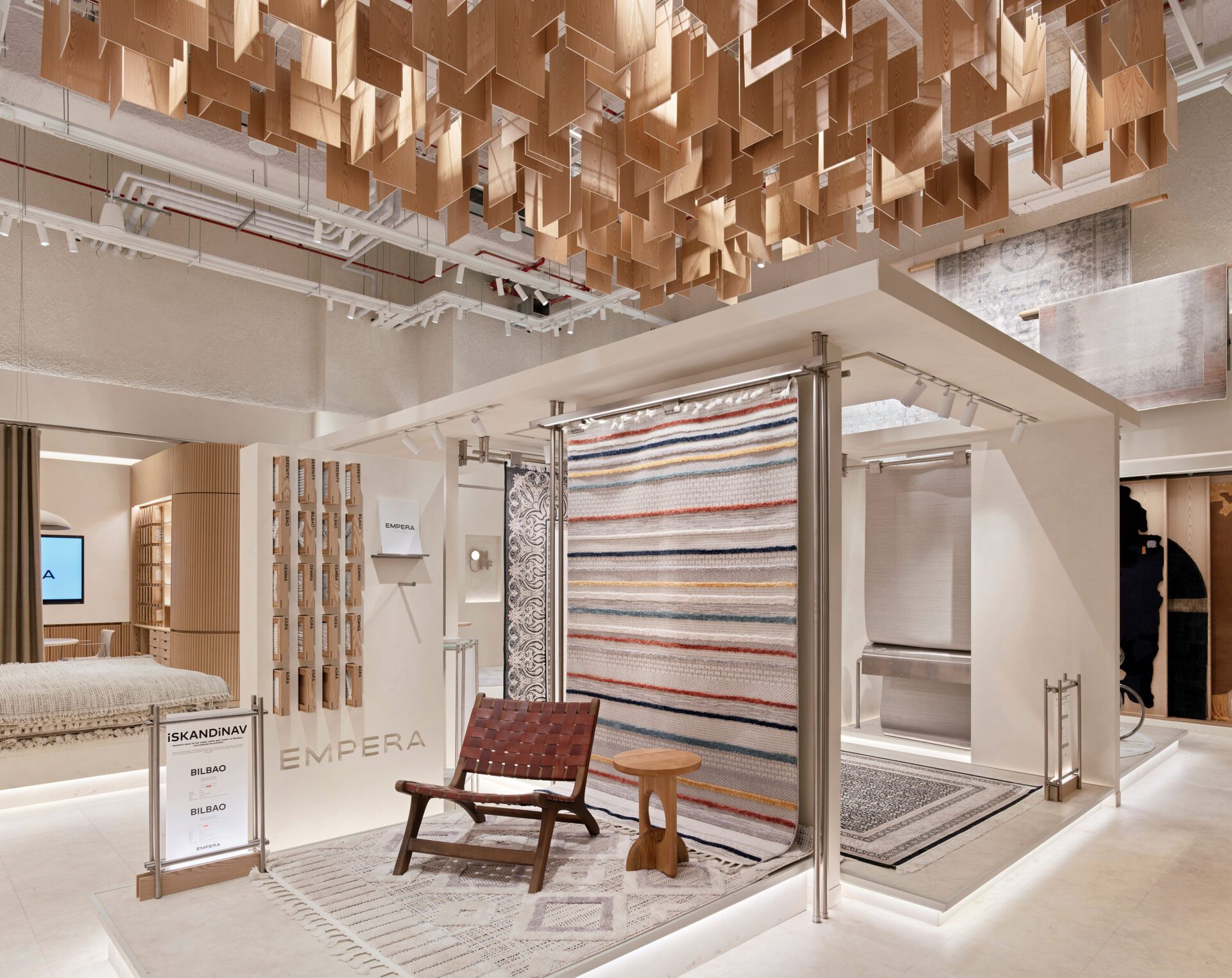 What we recognized early on is that the predominance of online shopping, even in the furniture sector, has made physical products seem ordinary in the eyes of the customer. Starting from this insight, we decided to focus on establishing a strong bond between the product and the user from the very beginning of their experience. It is vital for customers to engage with Empera’s products by touching and feeling them, by taking the time to appreciate their quality, by thinking about these products in their personal spaces. Empera carpets, sample materials, as well as digital solutions were thoughtfully integrated in a hybrid manner to strengthen this connection.