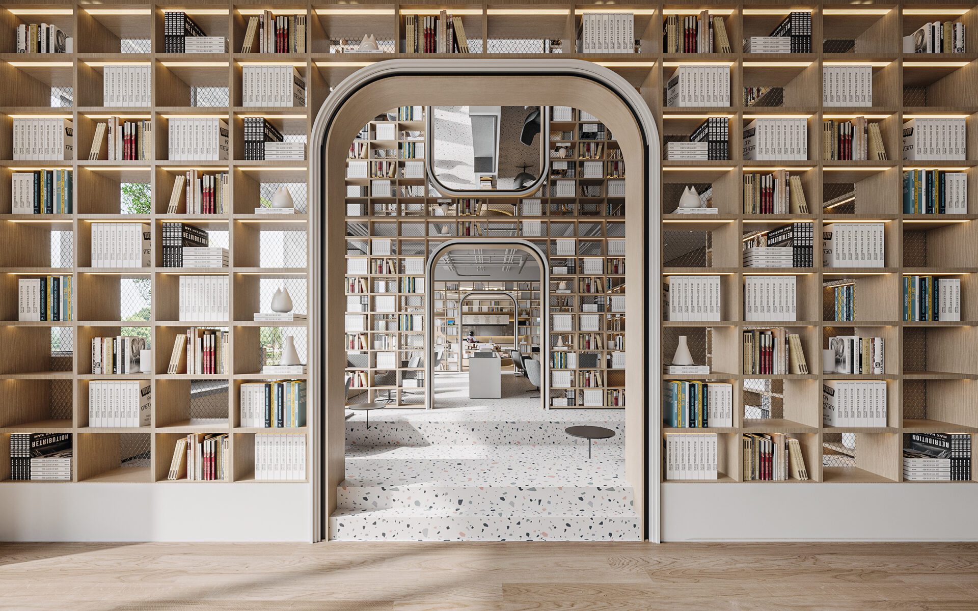 The arrangement of bookshelves creates a number of separate, small spaces that serve numerous purposes, including enhancing the function of collecting books and, more importantly, dividing the large space into smaller, scale-appropriate spaces where readers can indulge themselves in quiet reading time.