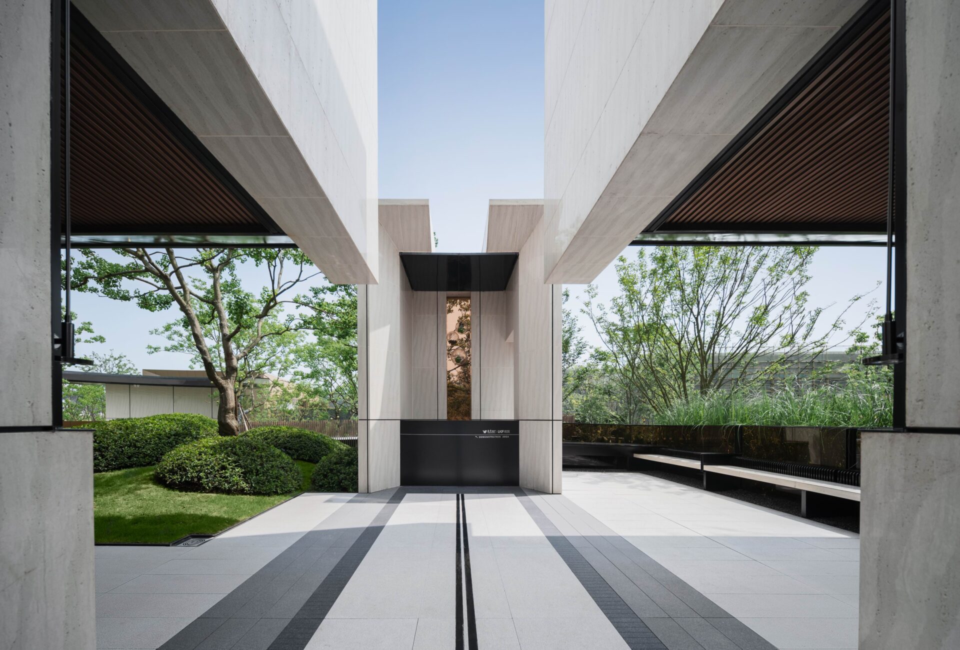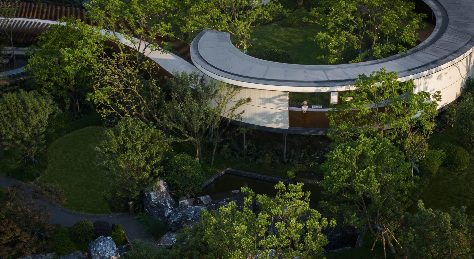 (Lodge in forest) When entering the sales office, you will feel that "the scenery is seen in the window, and the people are walking in the scene". By using the window of the building, the corridor when coming is also placed into the painting. The flowing waterfall is combined with the modern art corridor to fall into the nature to realize the design technique of "scenery everywhere".