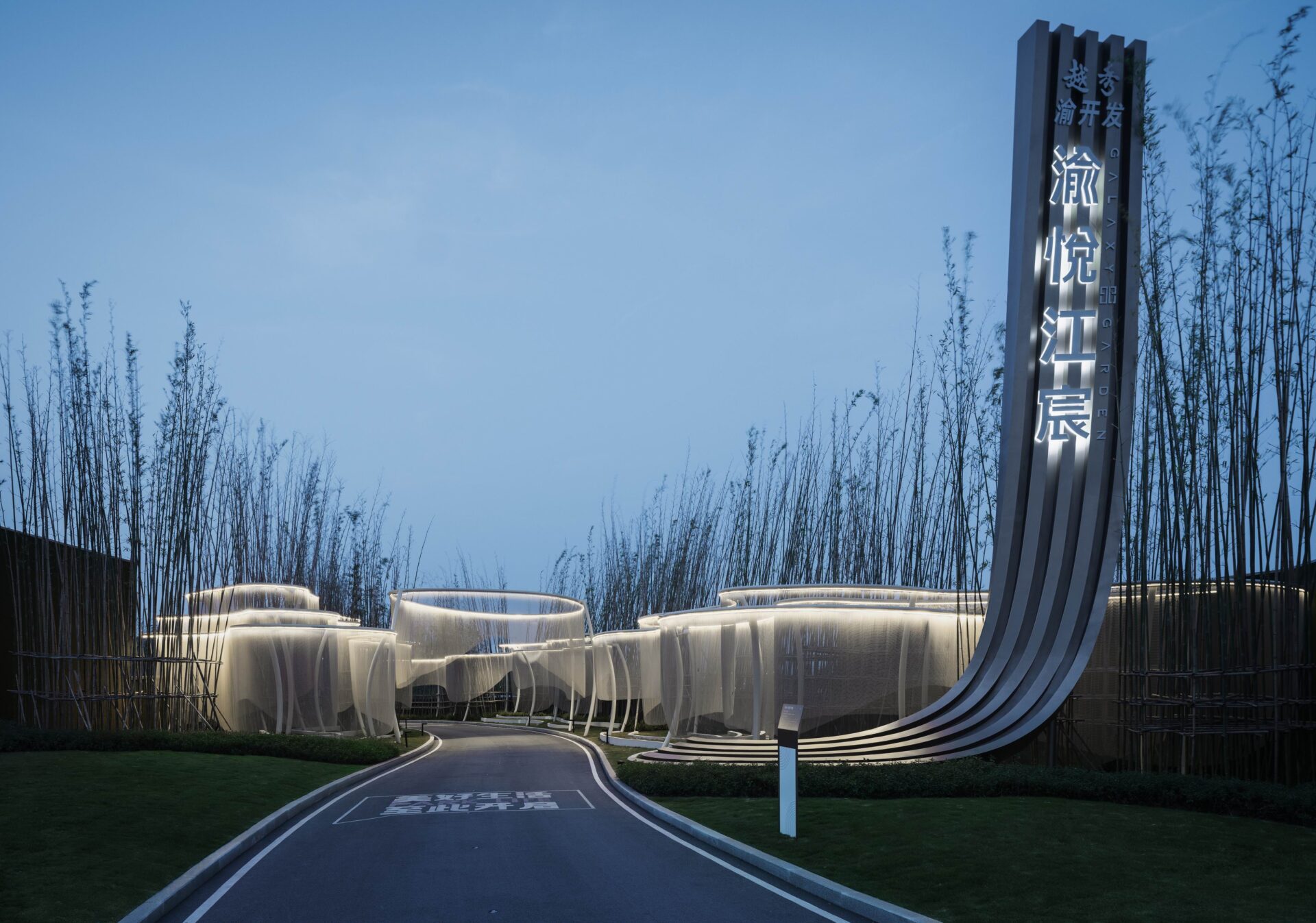 The designer of the entrance area has carefully conceived a wind tunnel art net curtain with a height of 3m ~ 5m. The background is lined with rigid bamboo, which seems to paint layers of gold light on the black background. When the wind slightly floating, it may blow up a curtain of dreams, which ripples in the heart. When the evening lights are lit up at the beginning, the light belts that inlay in forest end also bring persons into another beautiful space.