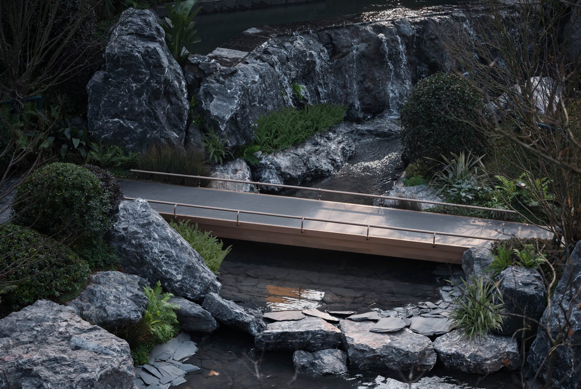 (Drawing room in forest) When crossing the secret forest to the embrace of nature, people may feel that the stone are tables, the leaves are chairs, and the halo under the bridge complements the moon shadow. The dense flower landscape separates the inside and outside spaces, and forms a natural quiet drawing room.
