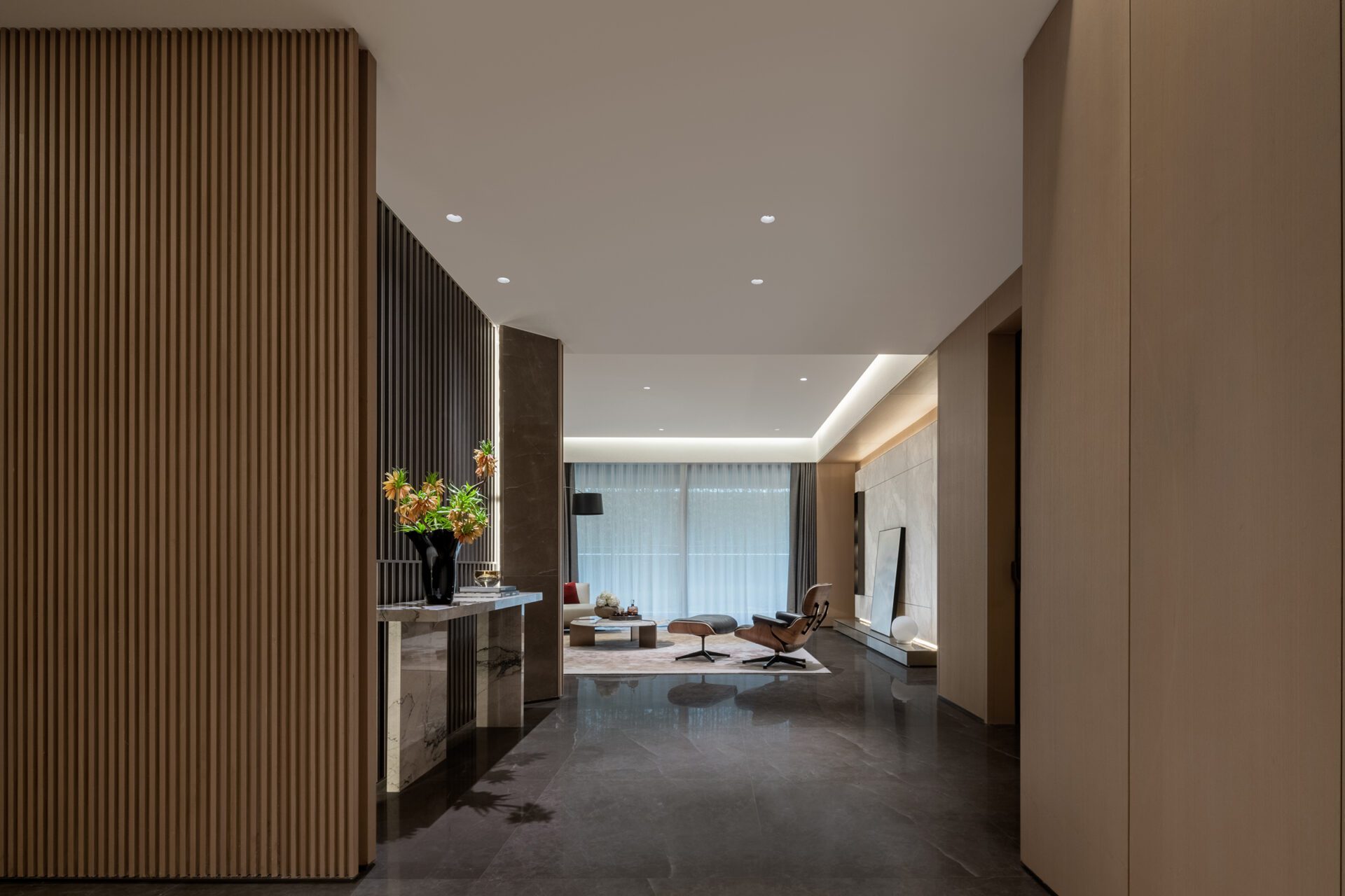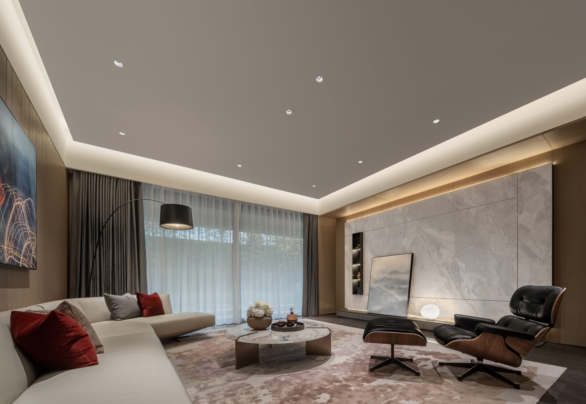 The sense of scale in the space was an important consideration in the design of the living room. The leather sofa’s color plays off the adjacent curtain, and the thin marble coffee table forms a material contrast with the soft textured carpet on which it sits. The gradual transition of colors in the room provides a leisurely atmosphere and feeling of comfort and elegance, inviting residents to pause and feel the gentle rhythm of life.