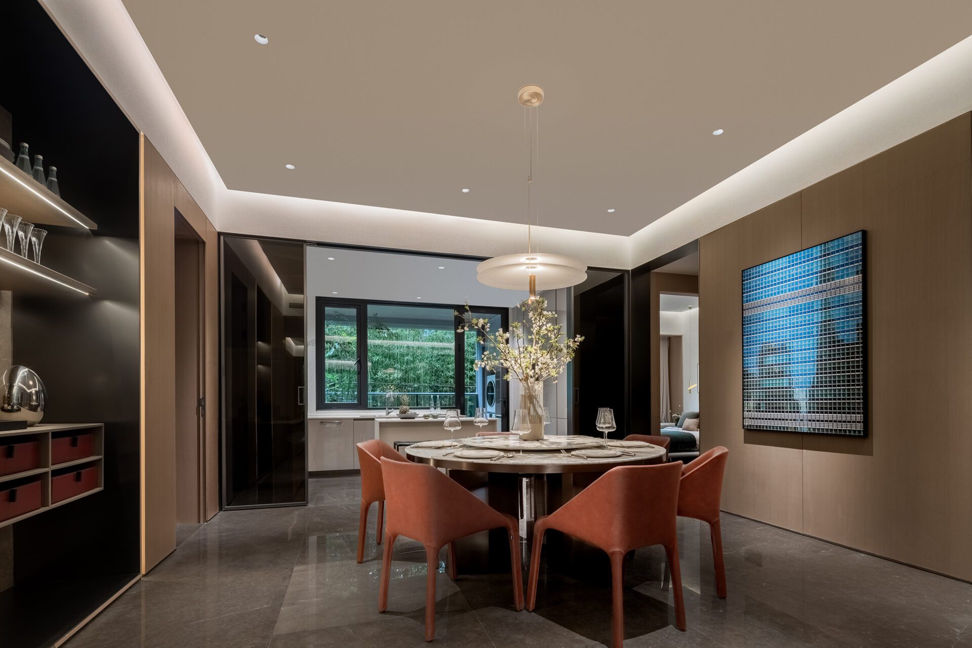 For the design of the dining room, MU Design has continued the use of marble and leather from the living room, albeit with a completely different approach and resulting in a markedly contrasting atmosphere. While the living room evokes relaxation, the dining room creates a sense of energy and activity. The mini bar provides wine and drink, and is directly connected with the living room. It thus serves as a place which has the capacity to combine tea, wine, flowers, poetry, calligraphy and painting – each one a world unto itself.