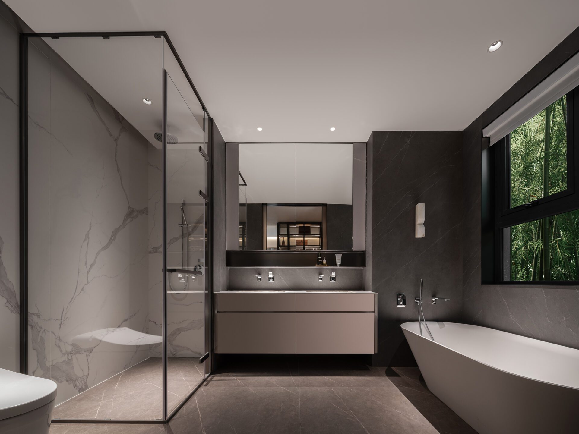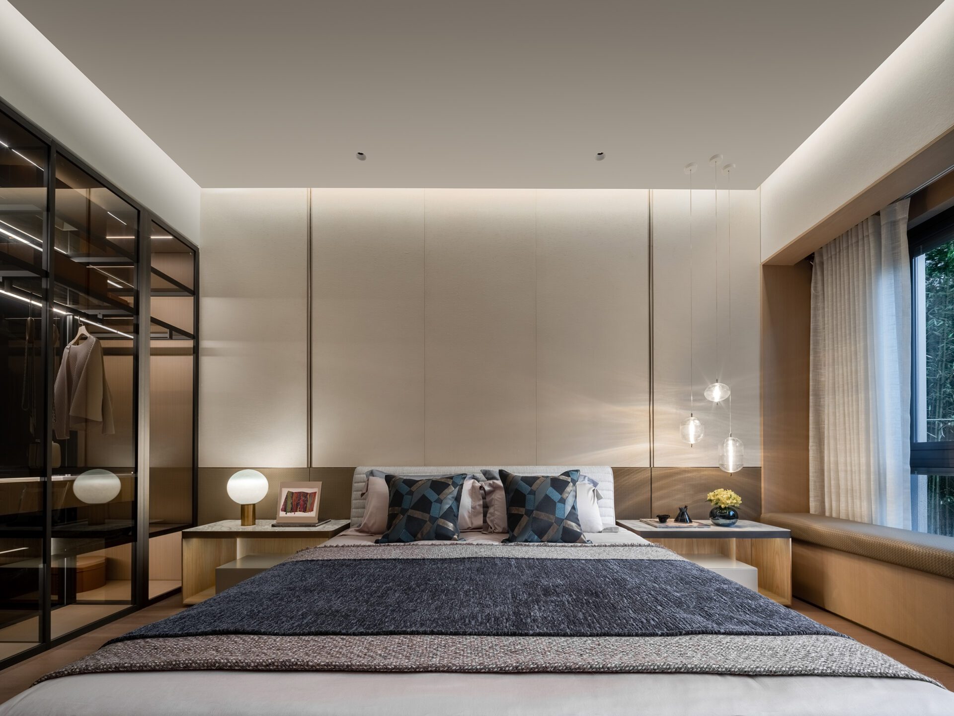The master bedroom is designed as a suite, incorporating a restrained and elegant color palette. The bedside chandelier provides a finishing touch to the space - casual and natural, its soft yellow light reveals subtle details and lends the space a warm and beautiful atmosphere.