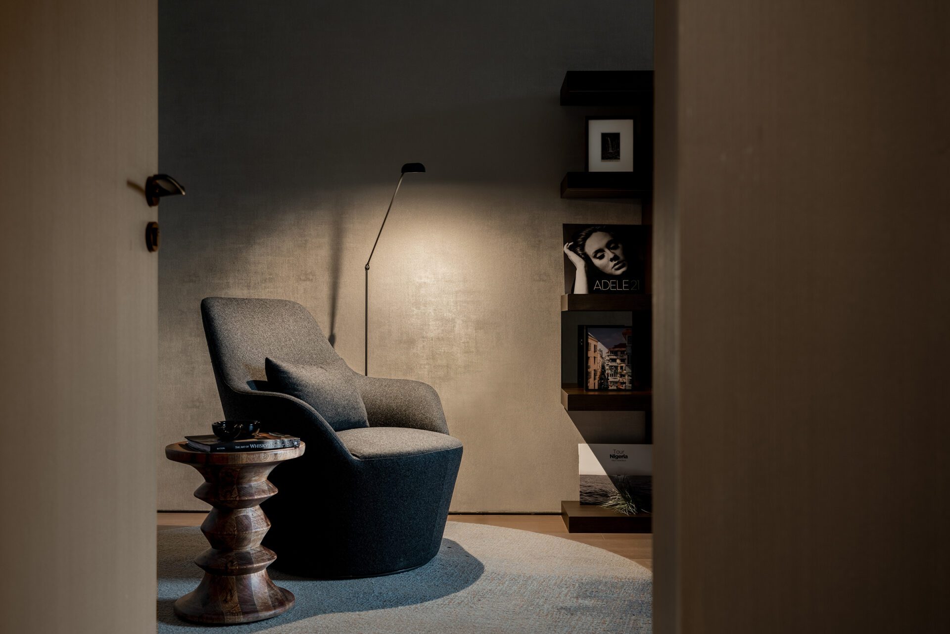 The designer has introduced natural texture into the home by using a unique life-like wood veneer as the main element, supplemented by other natural materials in a continuation of the space’s relationship to nature.