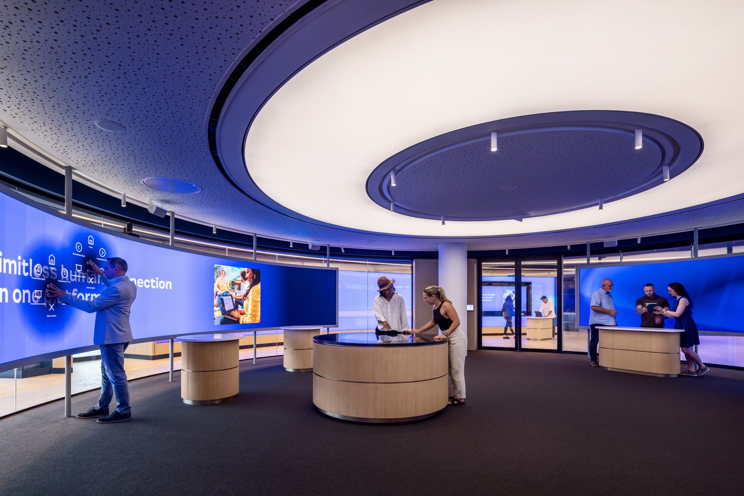 Central to the office is the Experience Centre, designed to captivate and inspire visitors. It features large, curved multi-touch LED walls offering a 360-degree visual experience, showcasing Zoom’s technological advancements through interactive content. The Lens Wall, a central design feature, wraps around the Experience Centre, creating an engaging digital environment. Another key element is the Discovery Showcase, which includes two 33-foot-wide curved LED displays. These displays offer a fully interactive view of Zoom’s products and solutions, aiming to not only demonstrate Zoom’s technology but also to create a memorable, engaging experience that aligns with the company’s vision for the future of communication and collaboration.