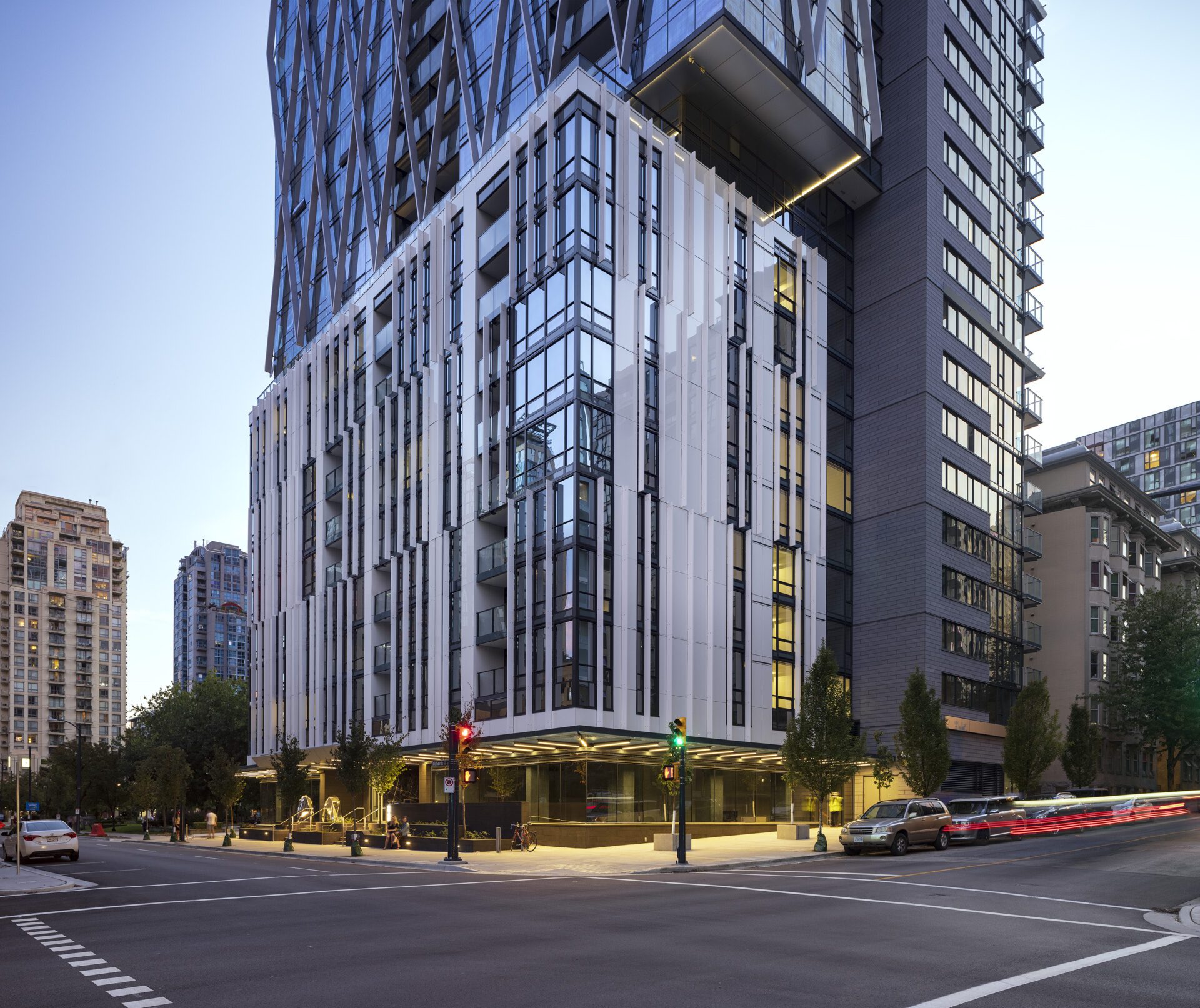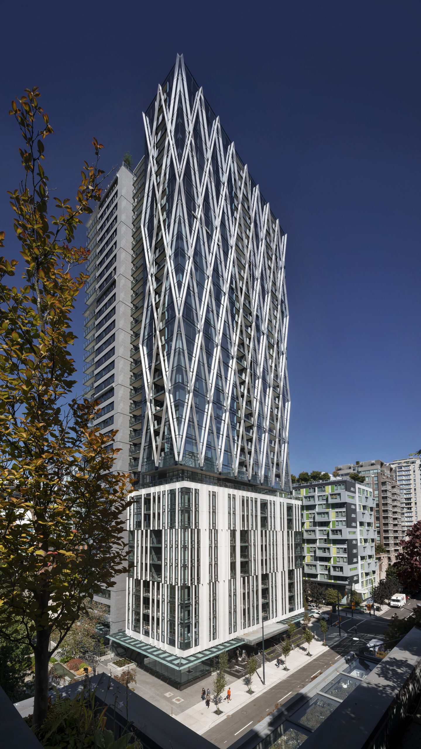 The tower's design addresses multiple contextual variables, including a neighbouring heritage apartment that establishes an urban scale and cadence along one side and numerous buildings of varying heights that reflect the increasing densification of Yaletown. Emery Barnes Park presents a critical third contextual zone, offering proximity to public space.