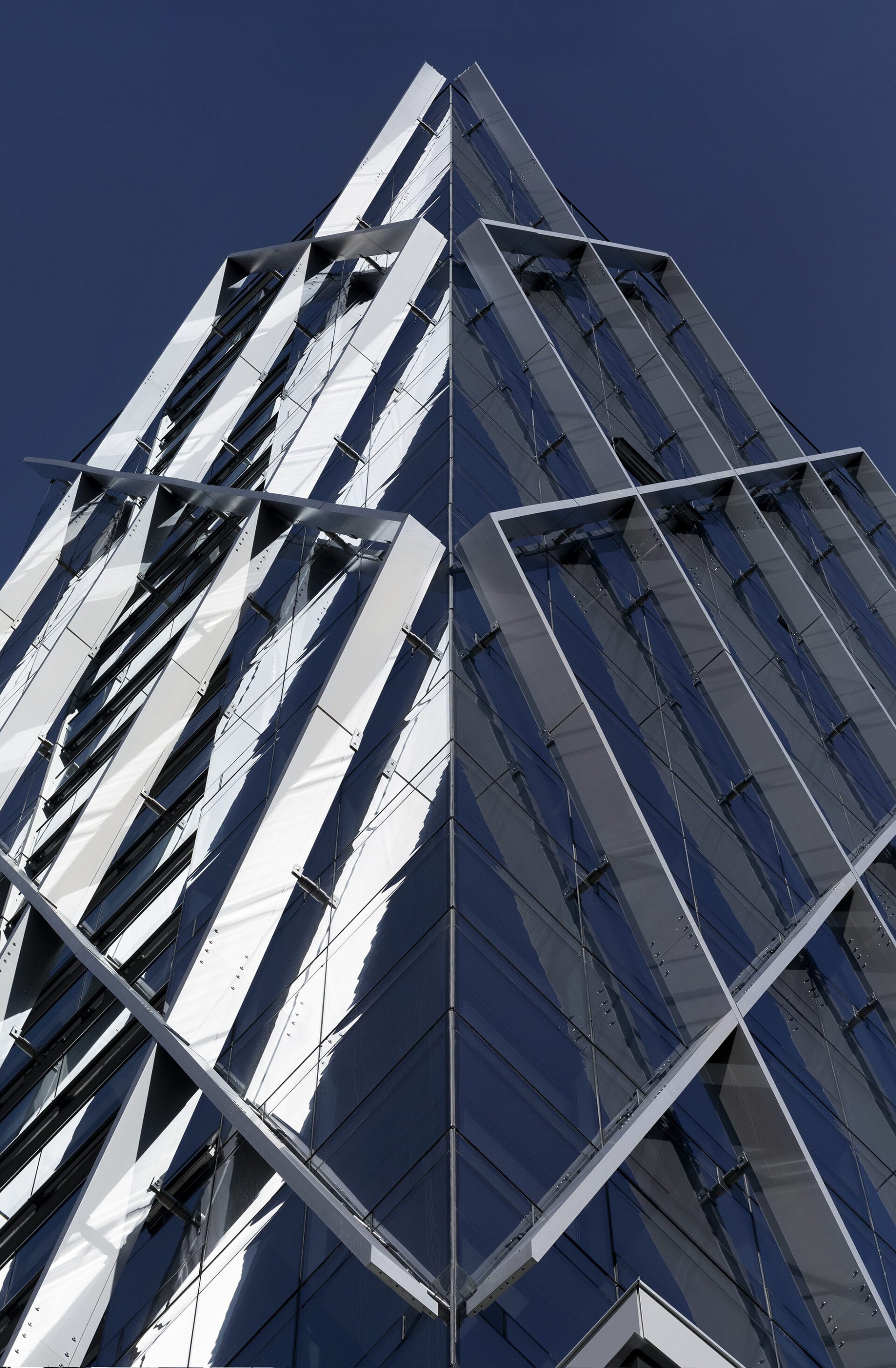 The east half of the tower is fully glazed with inset balconies for minimal vertical interruption. The southeast curtain wall is wrapped with diagonal louvers to mitigate solar gains. The shading devices balance solar shading with light infiltration and views, creating an engaging visual pattern that gives the tower a striking presence in the skyline.