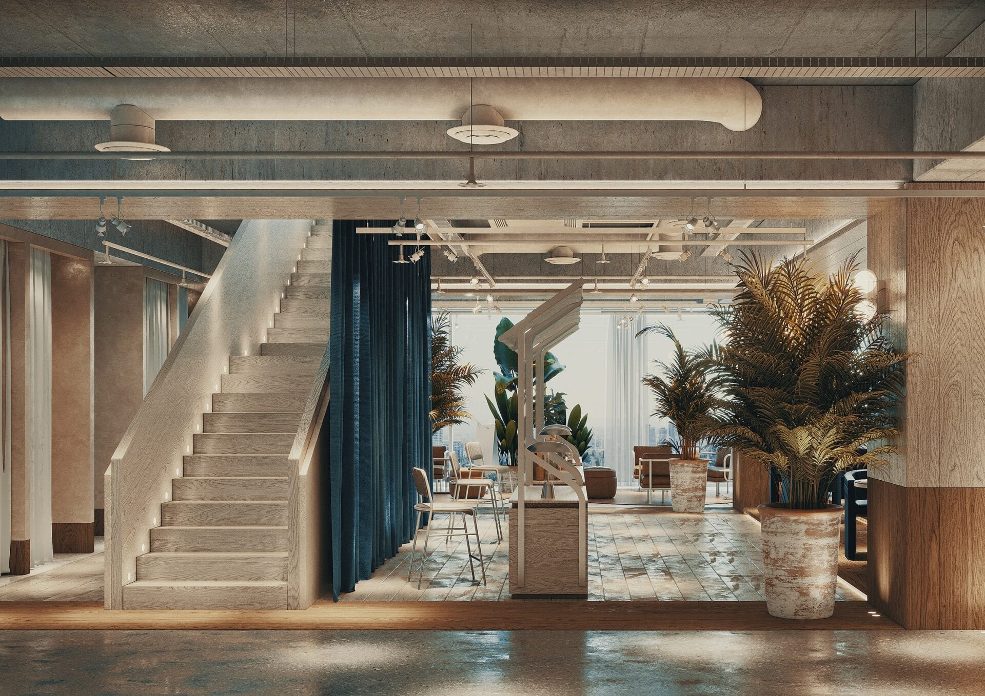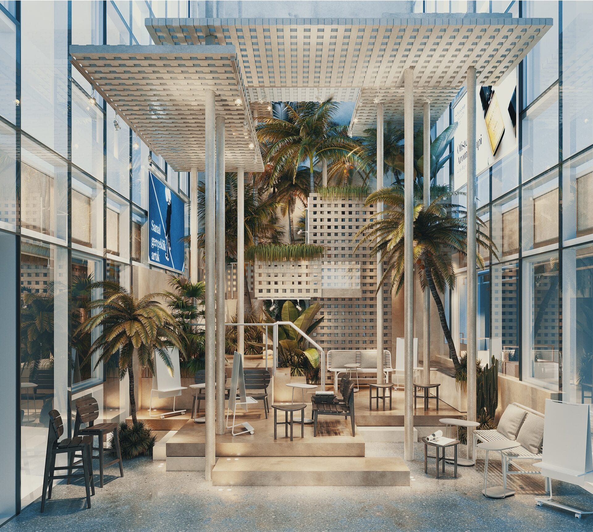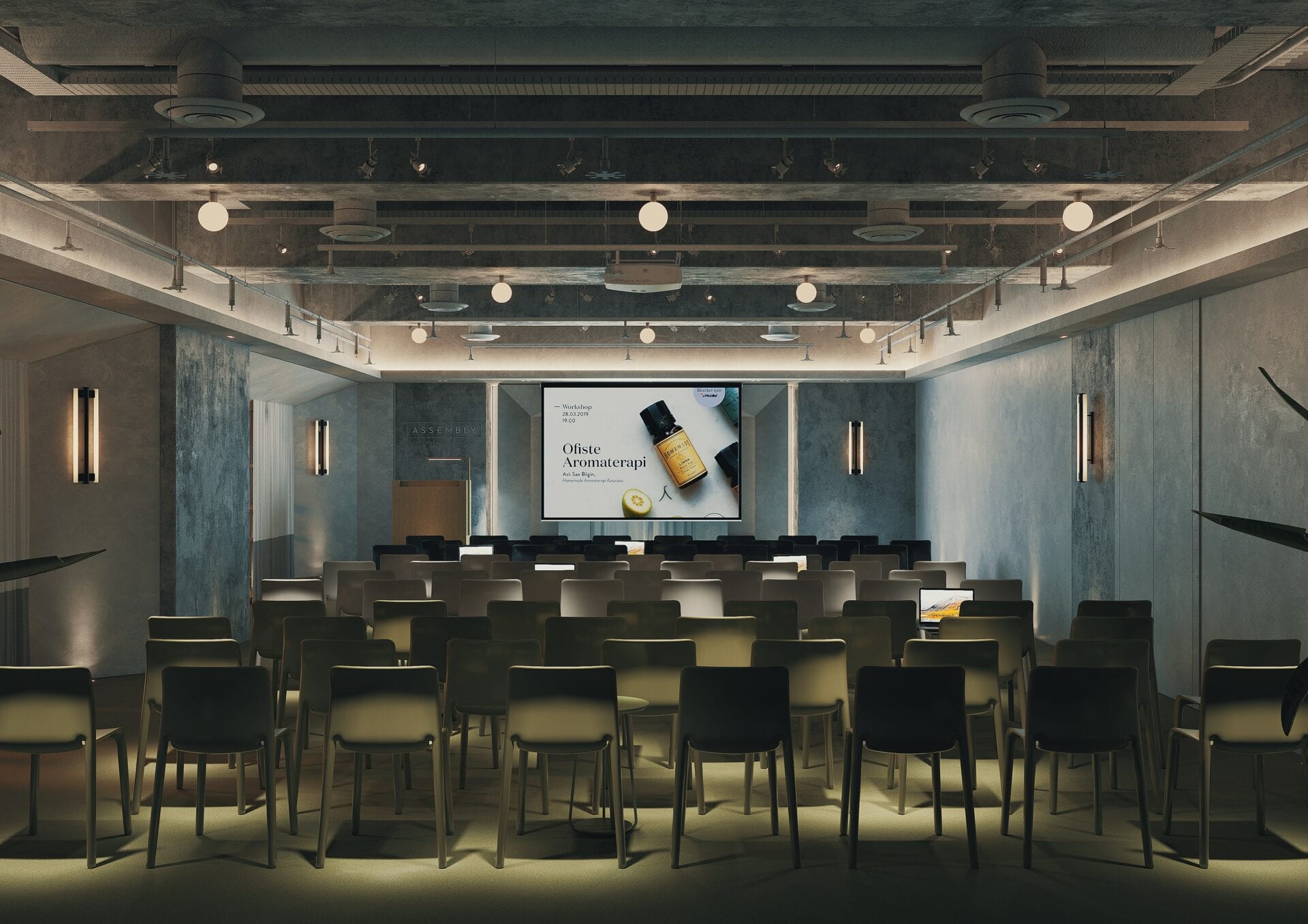 The layout was designed for Assembly Buildings that offers high segment shared office systems and accordingly deals utterly with the mutual working spaces, special suites, activity and social areas, and provides service not only for central offices but also for many high segment accommodation facilities in Istanbul. The area of 14.000 m2 designed by Urbanjobs was planned to form a “building community” incorporating the most extensive facilities in Istanbul. It has become a presence comprising of various venues and areas to be used simultaneously by thousands of renters, with its floor plans following an ideational and practical design process of 1 year, as well as the designed lifestyle. Numerous and multifunctional systems were planned from concierge services to cargo distribution, conference halls to multi-purpose activity areas, vertical gardens combining 4 floors to pilates studios, all day restaurants to mutual office areas, bars to recreation rooms, which resemble a hotel with no accommodation. Nearly 20 facilities which include restaurants, conference halls, floor gardens, gallery spaces, agricultural gardens can be allocated for other user and users simultaneously. Moreover, by combining these facilities at once, mobile venues were also designed that are capable of creating larger activity areas and offering the needs of indoor and outdoor areas all in one. For instance, whereas a part of thousands of people working within the facility attend to conference, the other part can do pilates in the studios, some can have business talks in all day restaurants, meanwhile some can work in the vertical gardens extending though floors, or other group can hold meetings in combined meeting rooms and floor garden allocated to them. In addition, the facility also has podcast studios allowing 3 to 4 people to broadcast simultaneously. This giant and complex community intersects at the various places, times and events of the venue. All working spaces were moved to the window ledges and storage, preparatory kitchen, cargo center, cloakroom spaces and wet areas (bathroom and showers) were moved within the scale, to ensure all users receive light and lower energy consumption. There are gallery spaces in the middle of the building, with the height of 4 floors and 150 m2 floor spaces each. Design crew planned a structure in one of these spaces that links two floors, escalate by elevation rather than ladders and allow users to socialize in each elevation, also built a structure within the other block of 4 floors, resembling a giant vase that can be seen from each 4 floors. This structure creates an oasis for those looking from the aisles in the top floors, meanwhile the ground level of the structure was planned a recreational space.
