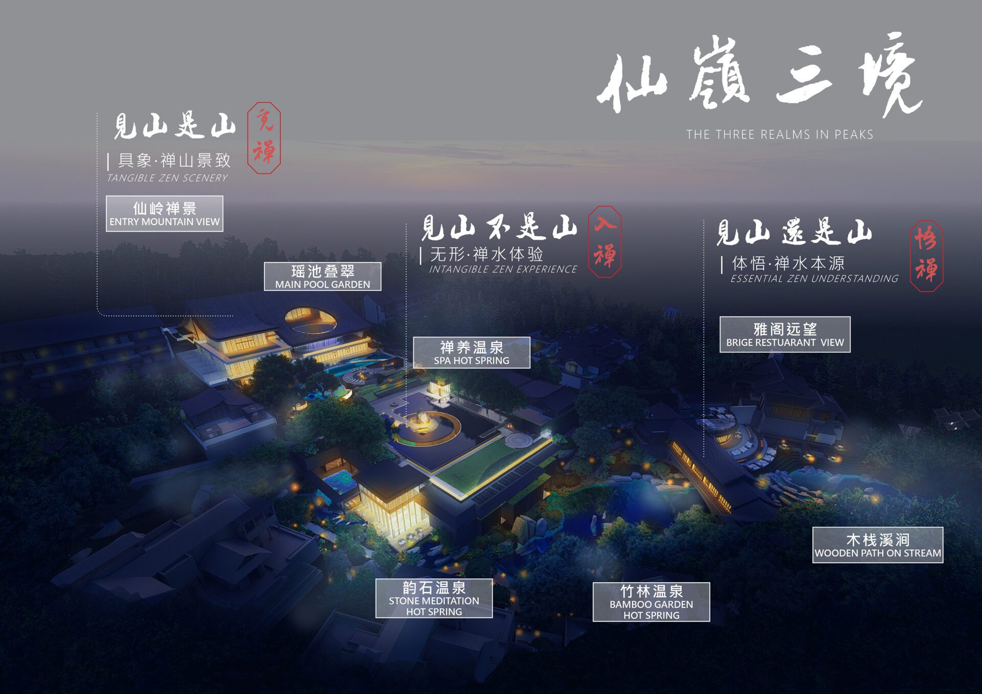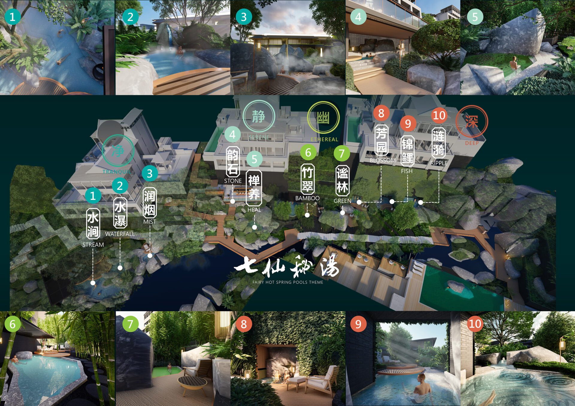 The Baoting Shuangda Hot Spring Resort is envisioned a wellness retreat that blends with the lower slopes of the Qixianling Mountain. The subtropical climate has given the site a unique rainforest setting along with a stream and hot springs. It also enjoys views of the seven peaks of Qixianling, an iconic geological feature and the highest point in the region. The landscape concept carefully considers natural assets and the resort’s oriental architecture to honor the harmonious peaks and to tap into the healing properties of the forest.