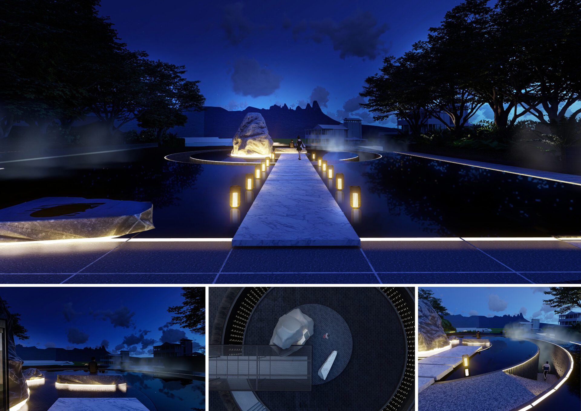 The visitor journey begins at a misty roundabout at the clubhouse drop-off. Various outdoor areas are oriented towards the seven peaks, which are framed by apertures and water features. A passage through a reflection pool leads to the hot springs spa in the lower building. The water from here cascades to a restaurant with al fresco dining pods and an outdoor stage.