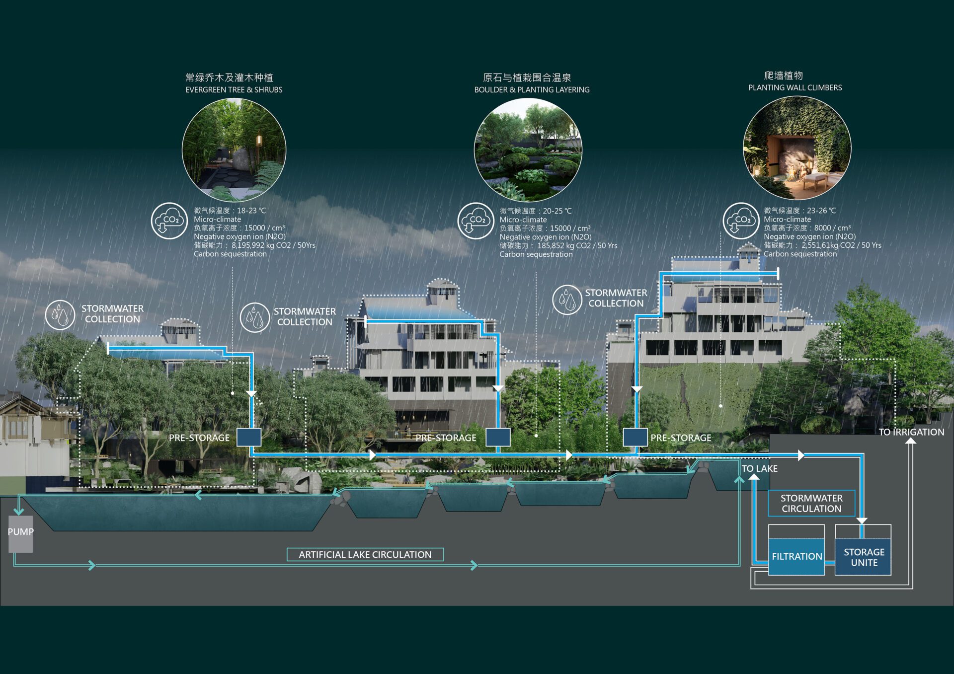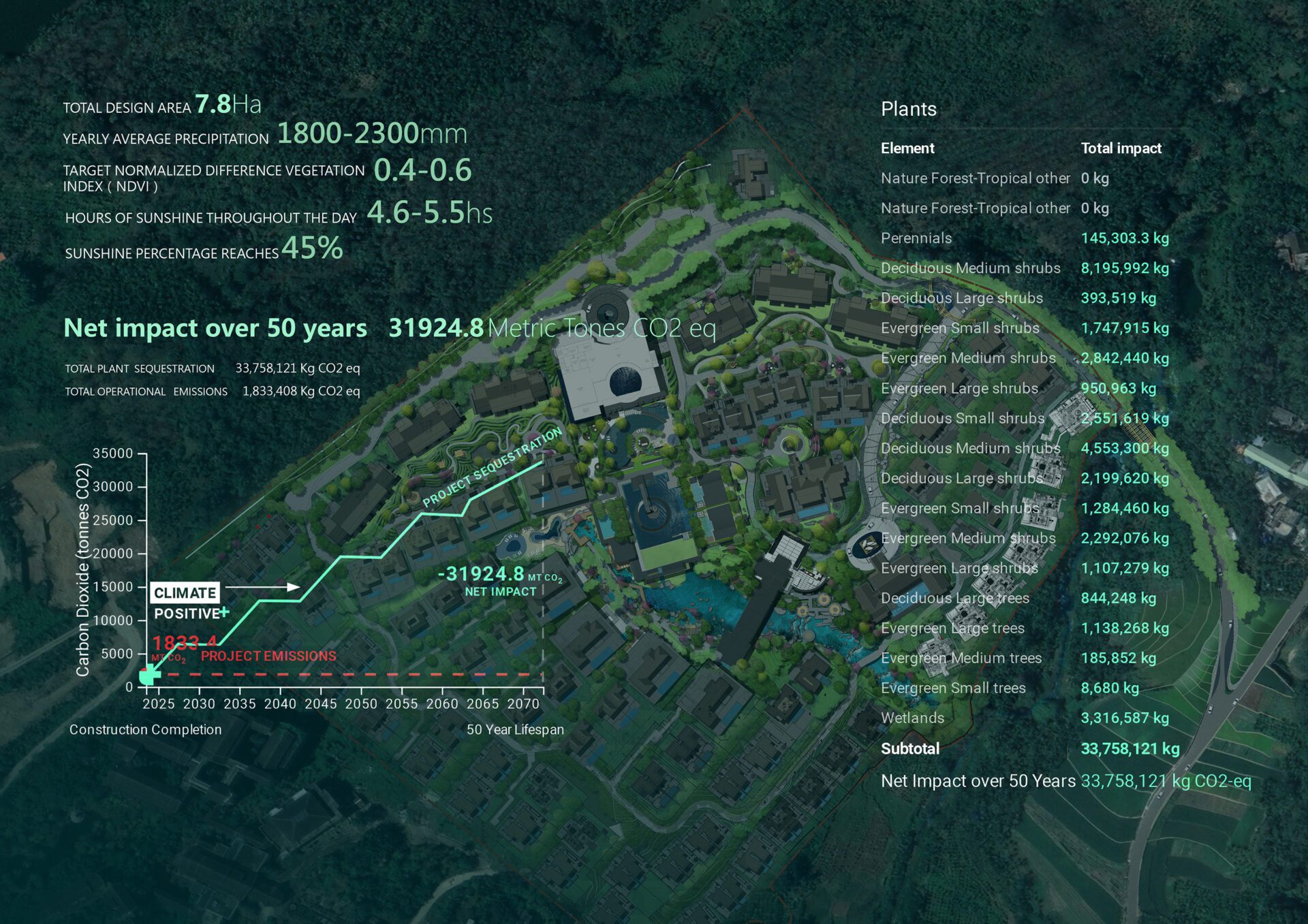 Environmental studies were conducted to optimize the design. Solar exposure informed the programming of spaces, while normalized difference vegetation indices assisted in strategizing for enhanced green coverage and soil health. This enabled a selection of plant types that would best thrive in the local conditions, create comfortable microclimates, and can potentially sequester about 34,000,00 kg CO2-eq over fifty years. The lake feature doubles as a stormwater management system.