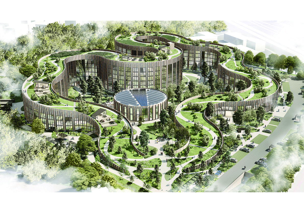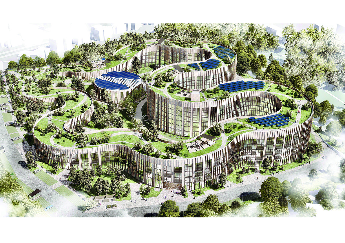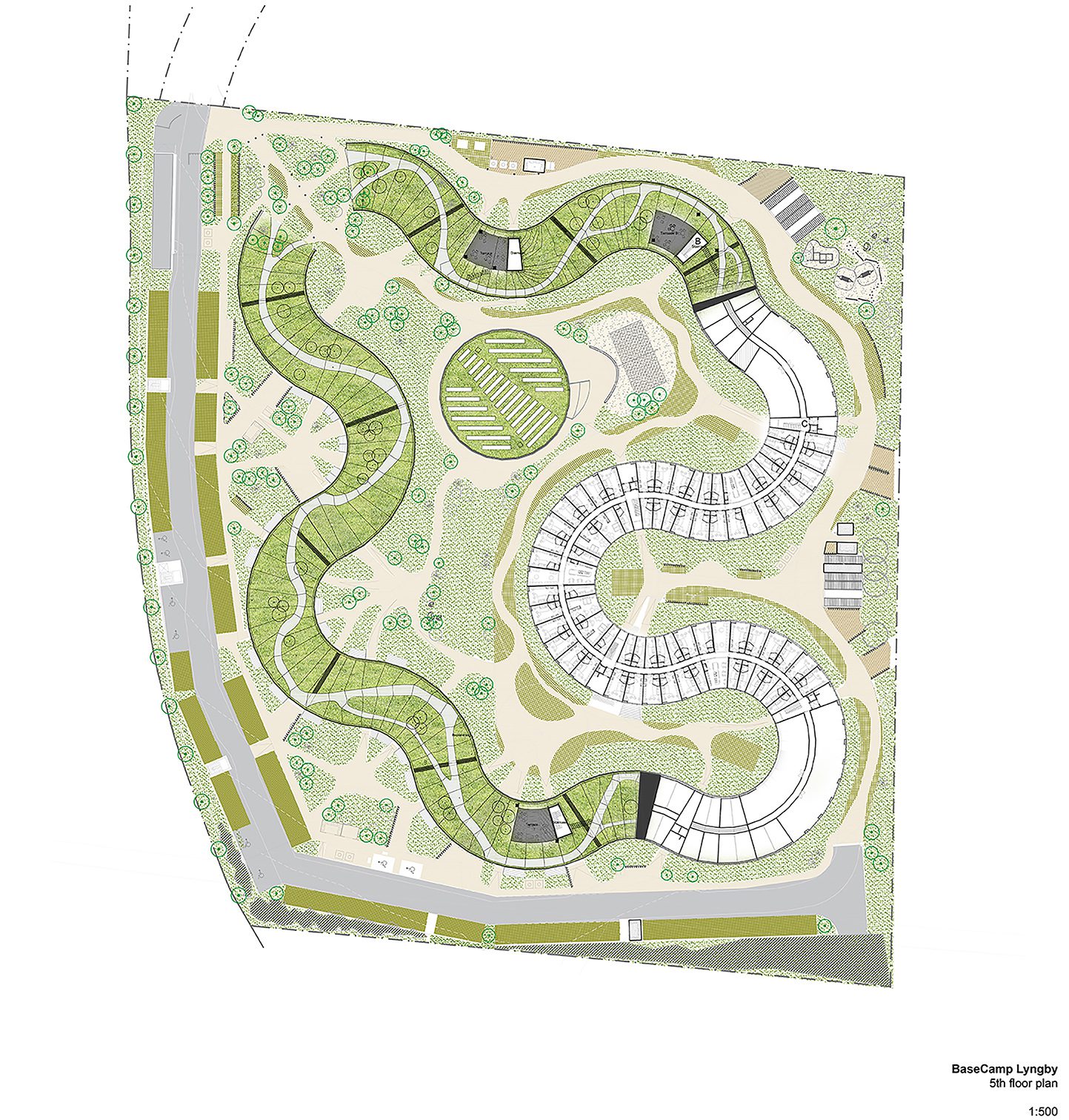 BaseCamp Lyngby is a socially interacting super structure and will function as a sustainable shared living community for 900 students, PhDs and senior citizens. BaseCamp Lyngby’s organic structure is inspired by the surrounding green area and a desire to bring people closer to nature and motivate them to interact with it and with one another. It is a social organism designed to be a catalyst for bringing people of all ages together for social interaction, as well as quiet immersion. The architectural concept is about creating spaces that flow together unobstructed and provide intriguing experiences throughout the entire composition, from both the various inside court yards, as well as the outside landscape. Unexpected and surprising elements and views are fluently added to invite poetry and spirituality into the architecture. The structure is made of a single trapezoid shaped module. The module is repeated, rotated and stacked in different heights in order to create the round organic shaped structure. This is what kept the construction sustainable and within the budget limits.