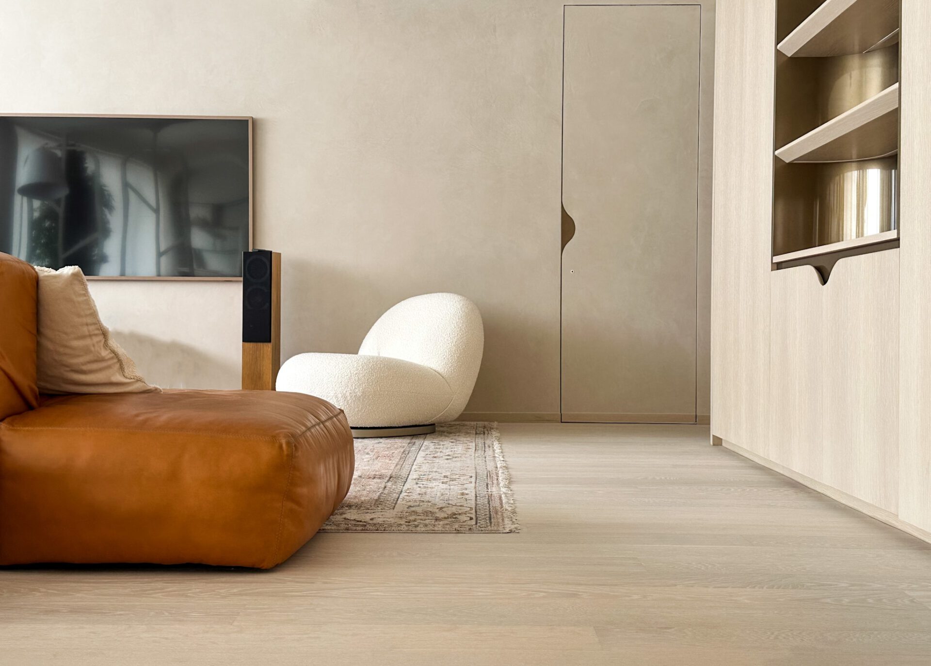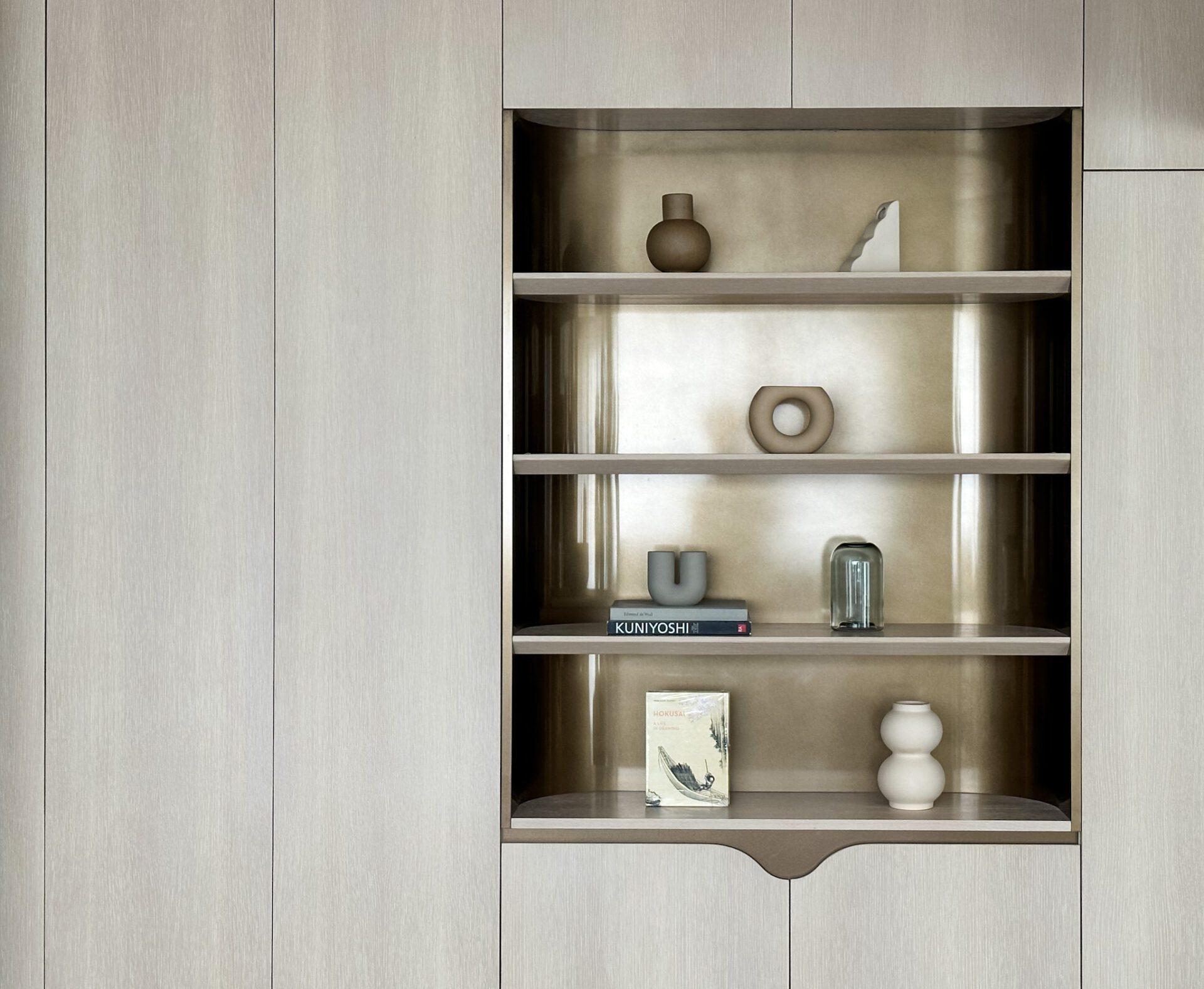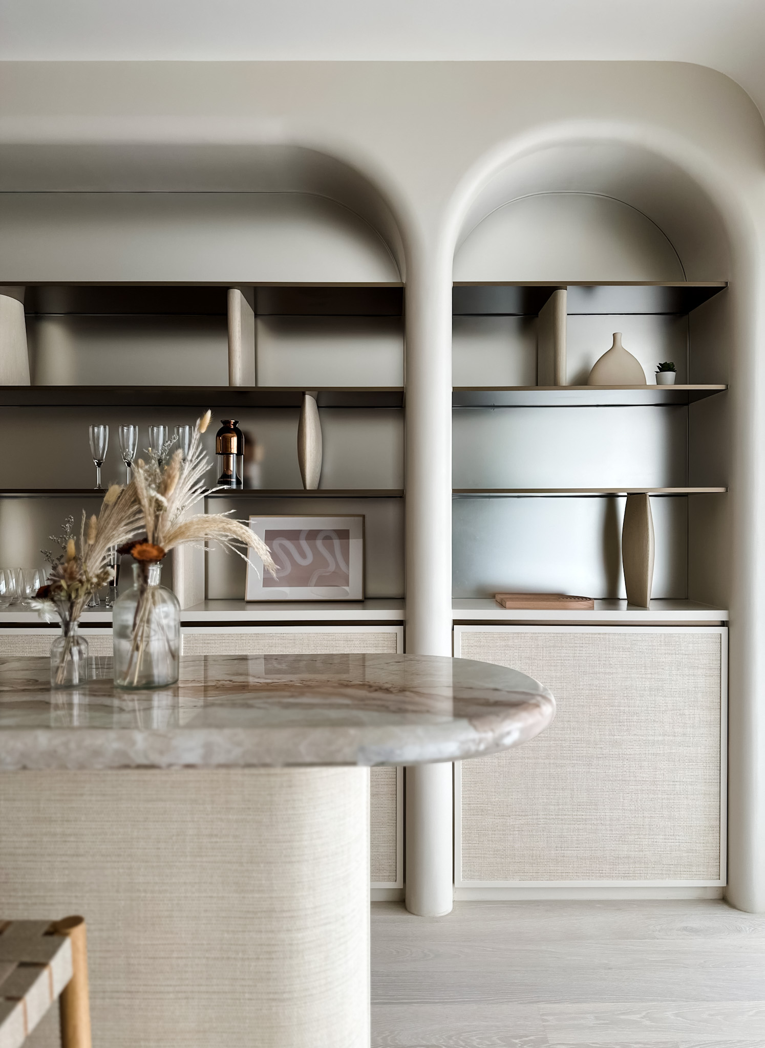 We carefully introduced subtle, curved geometries to explore a sense of softness. We rounded edges to mitigate the contrast between light and shadow. For example, in the open dining and lounge space, we constructed a dry pantry as a backdrop with a set of rounded arches that contain display shelves. To keep each shelf thin, we used bespoke sculptural bookstands in irregular shapes that provide structural support while acting as a decorative element.