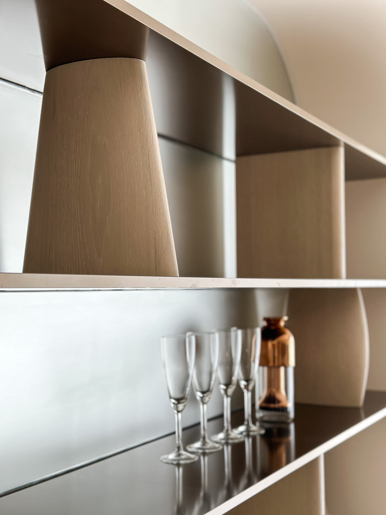 The back wall surface of the shelf has a reflective finish to add a pristine and airy atmosphere to the lounge. This optically relieves the space and adds a feeling of generosity to the open area.