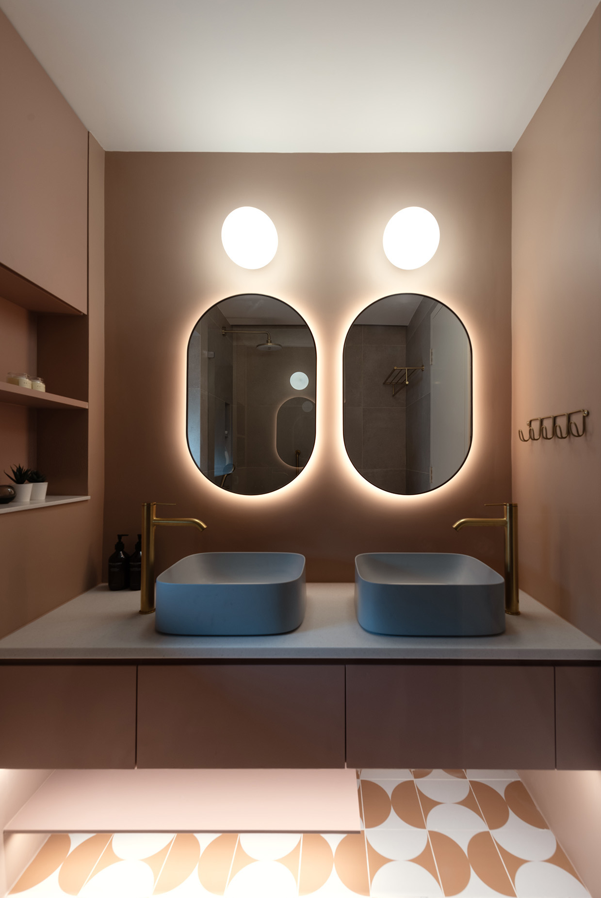 For the master bathroom, we applied red-coloured grouting between white tiles to add a sense of playfulness to the more mature setting. On the other hand, colour is used more liberally in the kids' bathroom with muted red walls and terracotta-coloured patterned tile flooring.