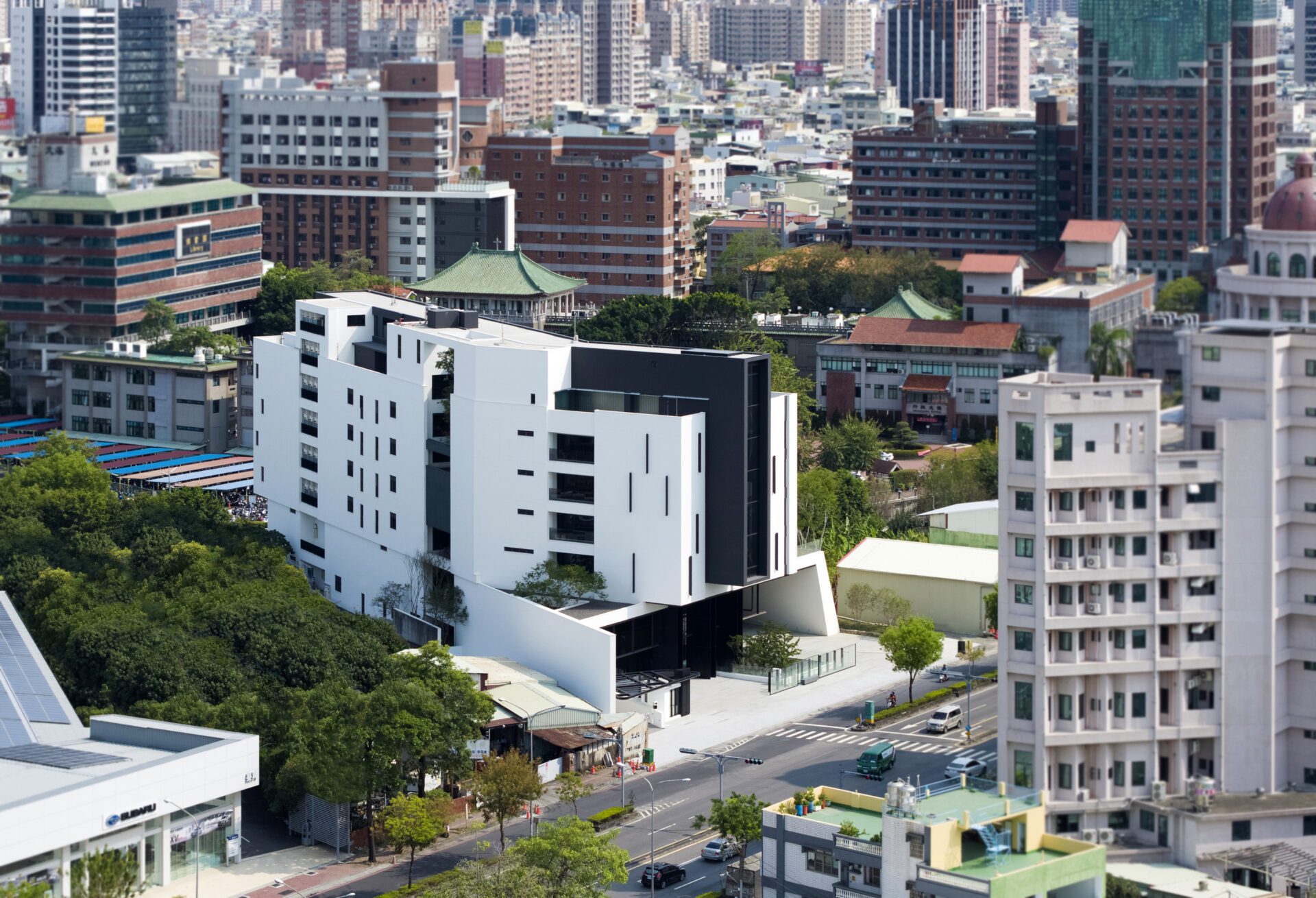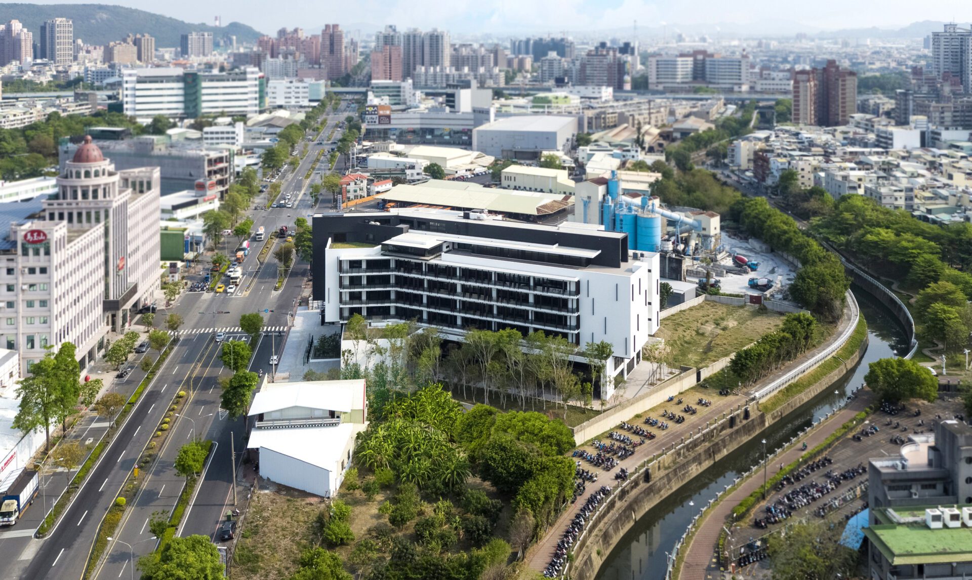 The project is located in the south and close to the north-south provincial highway in Taiwan. The narrow plot is less than 30 meters wide so space constraints are something that had to be accounted for. The site is hampered by noise from the provincial highway, air pollution, and concerns about employees and guests transiting to the office.