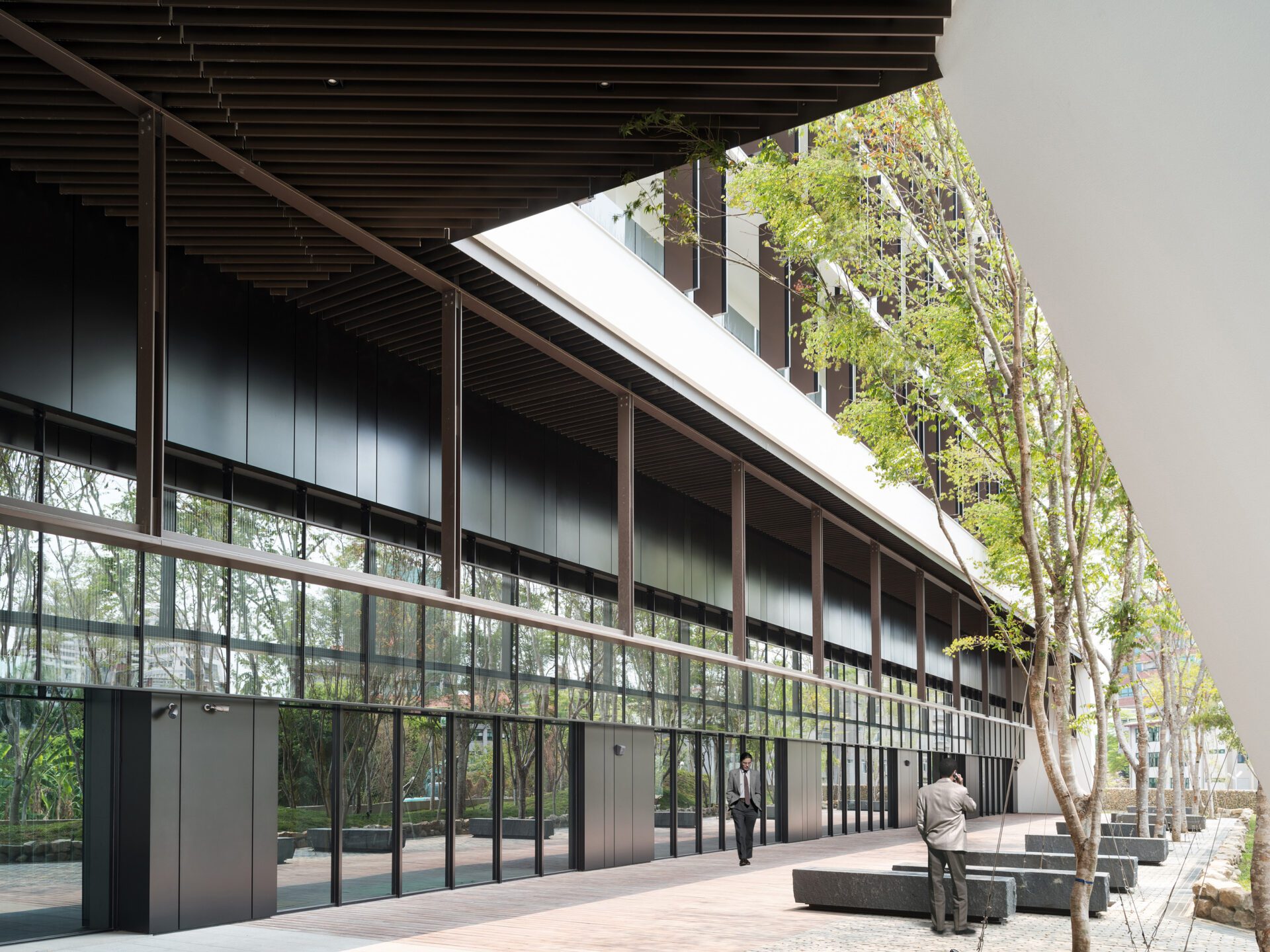 The color of the building and the large amount of greenery in the environment are intertwined with the greenery of the property to create a coordinated and friendly image of the entrance. The corridor of the entrance is surrounded by a high degree of natural sloping embankments and densely planted trees. The exterior is dotted with stone chairs. This creates a natural forest farm that reduces the impact of the polluted air on the human body and achieves the purpose of reducing noise.