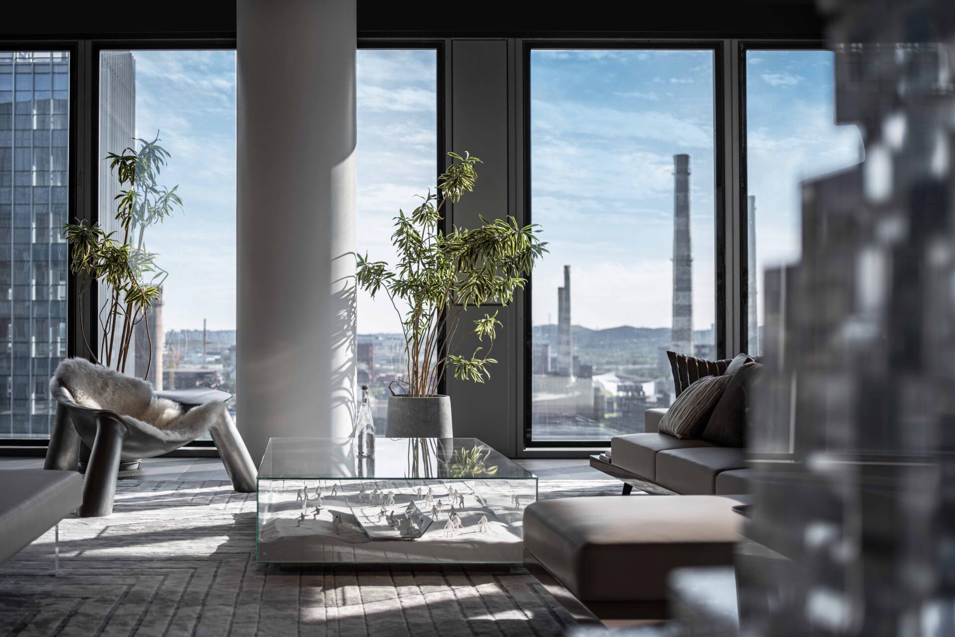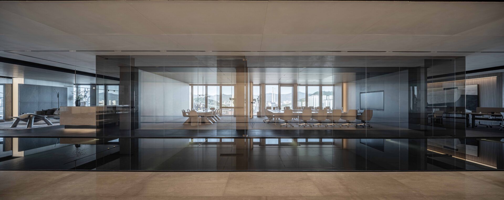 Modern materials such as glass and stainless steel will magnify the space so that it can be extended indefinitely, and maintain the maximum blend and continuity of the space, creating a free and boundless space. The space defined by the glass partition presents everything dynamically in the form of silhouette in the long scroll, creating a kind of visual performance that seems to be separated or non-separated, transparent or non-transparent. Compared with the horizontal flow of glass in the space, the scene in the space is reflected by the mirror waterscape and stainless steel mirror, so that the space builds a sense of extension in the vertical.