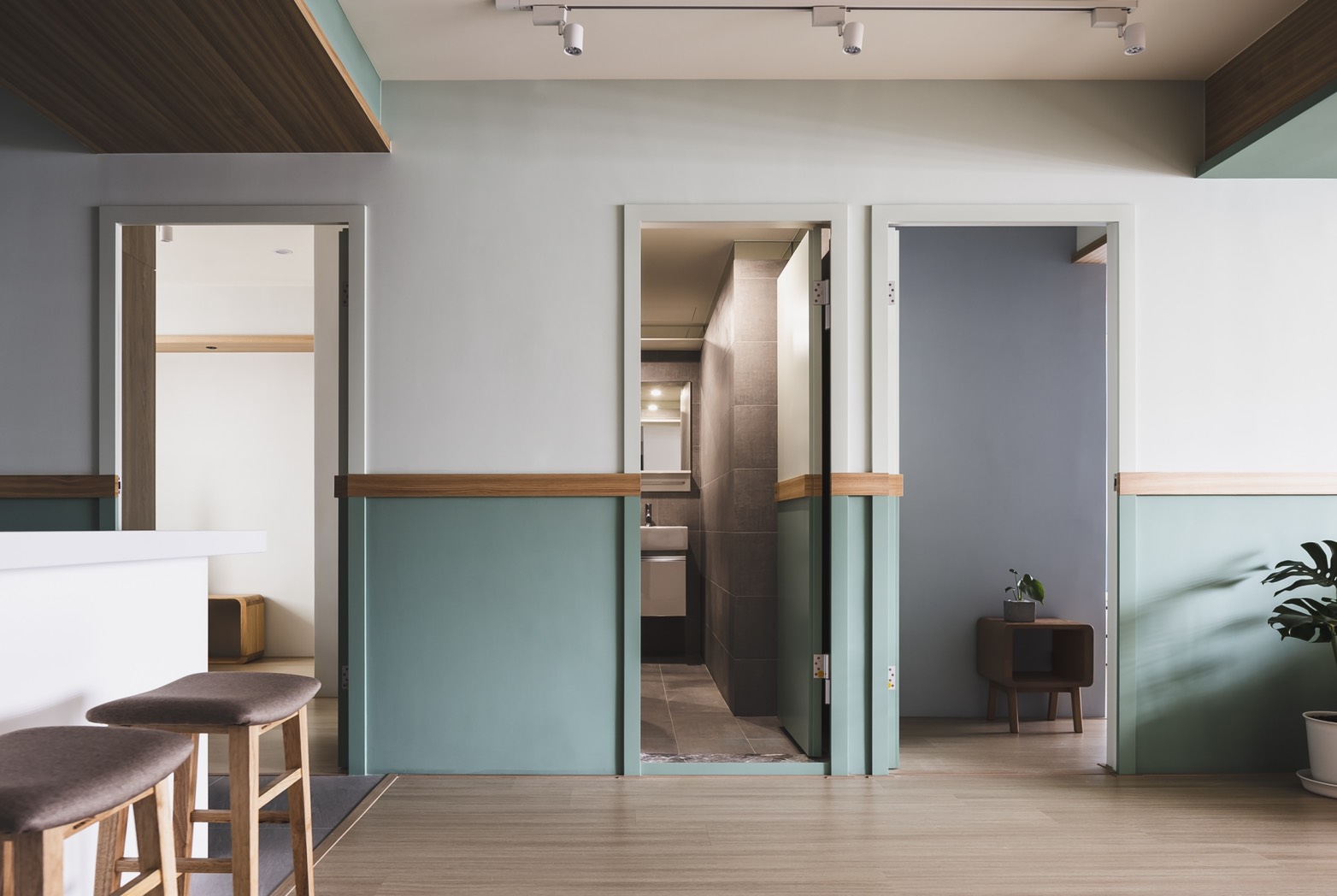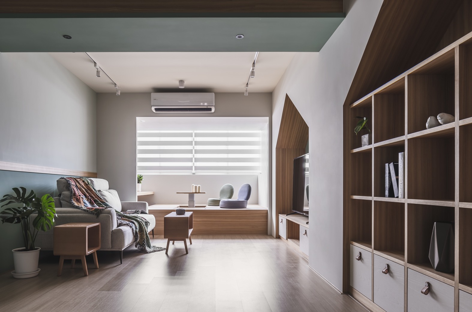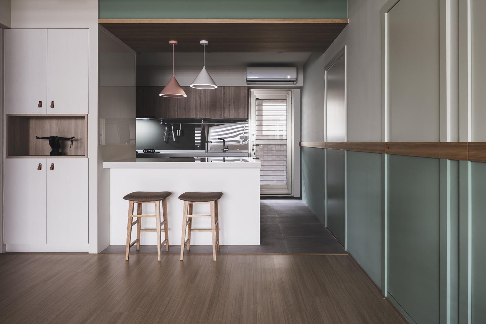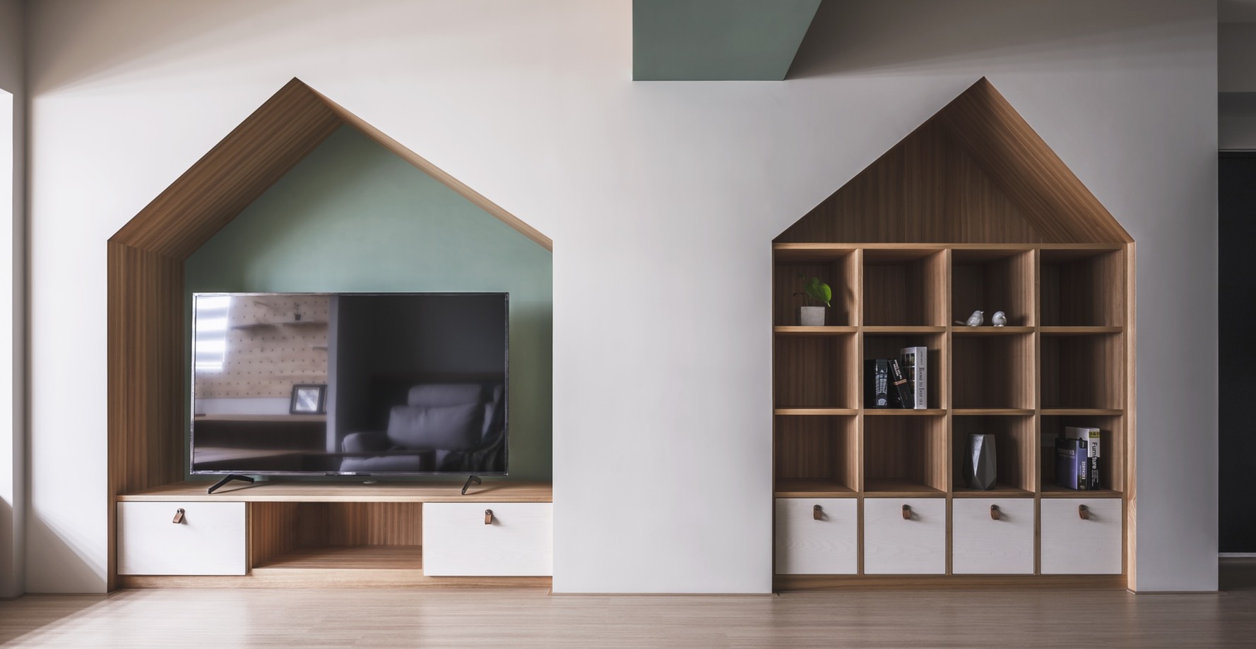 A warm and refreshing modern-minimalist-style house is a home that the client yearns for. After entering the space, people can experience the stress-free environment through the surrounding natural atmosphere, and the feeling of belonging as a "home" is reflected by the space design. After the design team fully understands the housing needs and requirements, through the perfect layout and circulation, the space is divided into public and private areas to create a harmonious and open space. The use of dimming roller blinds harmoniously deploys the light inside the space. Through the warm wooden material, light wood color paint, leather surface, woods and emerald green color, creating a quiet and fresh Northern European elegant house. Place the bedrooms on the same side and implementing a hidden door design style to maintain the feeling of cleanliness and harmony in the space. Through the fresh colors such as pink green, sky blue and embellished with warm wood materials, the space creates the natural space atmosphere. This project is adopting monotonic patterns, unlike any other conventional residential house. In the living room, the TV cabinet implements a playful triangle shape, adopting a playful appearance to create a sense of liveliness at home. Besides, a Japanese room with a retractable tabletop is added in the corner of the living room, and the movable wall making the space more flexible. Through the wooden flooring, the overall space is enclosed in the lower level of the multi-functional and room layout to create a modern, simple and transparent space experience.