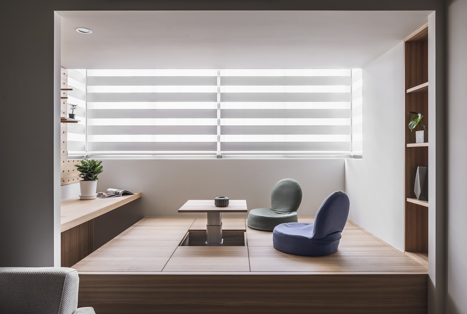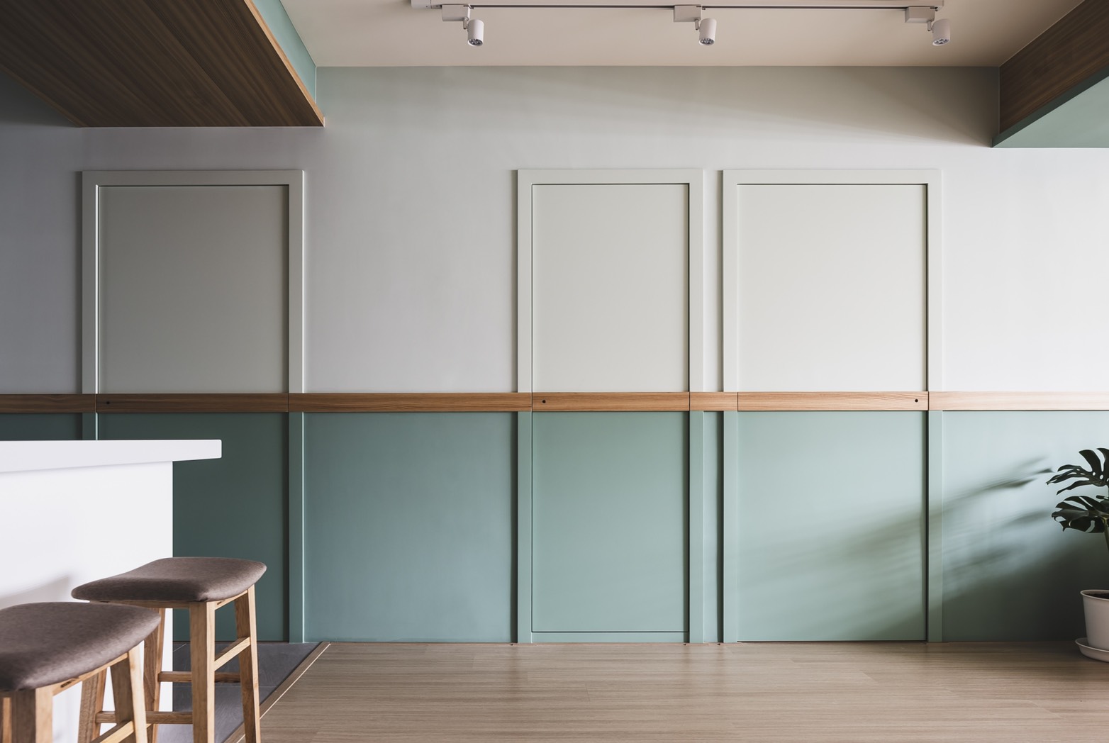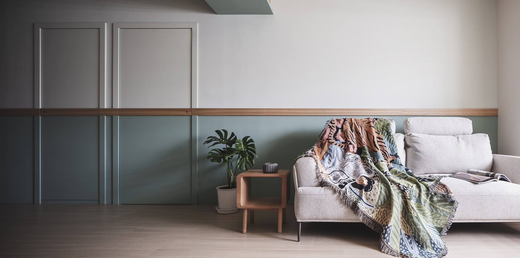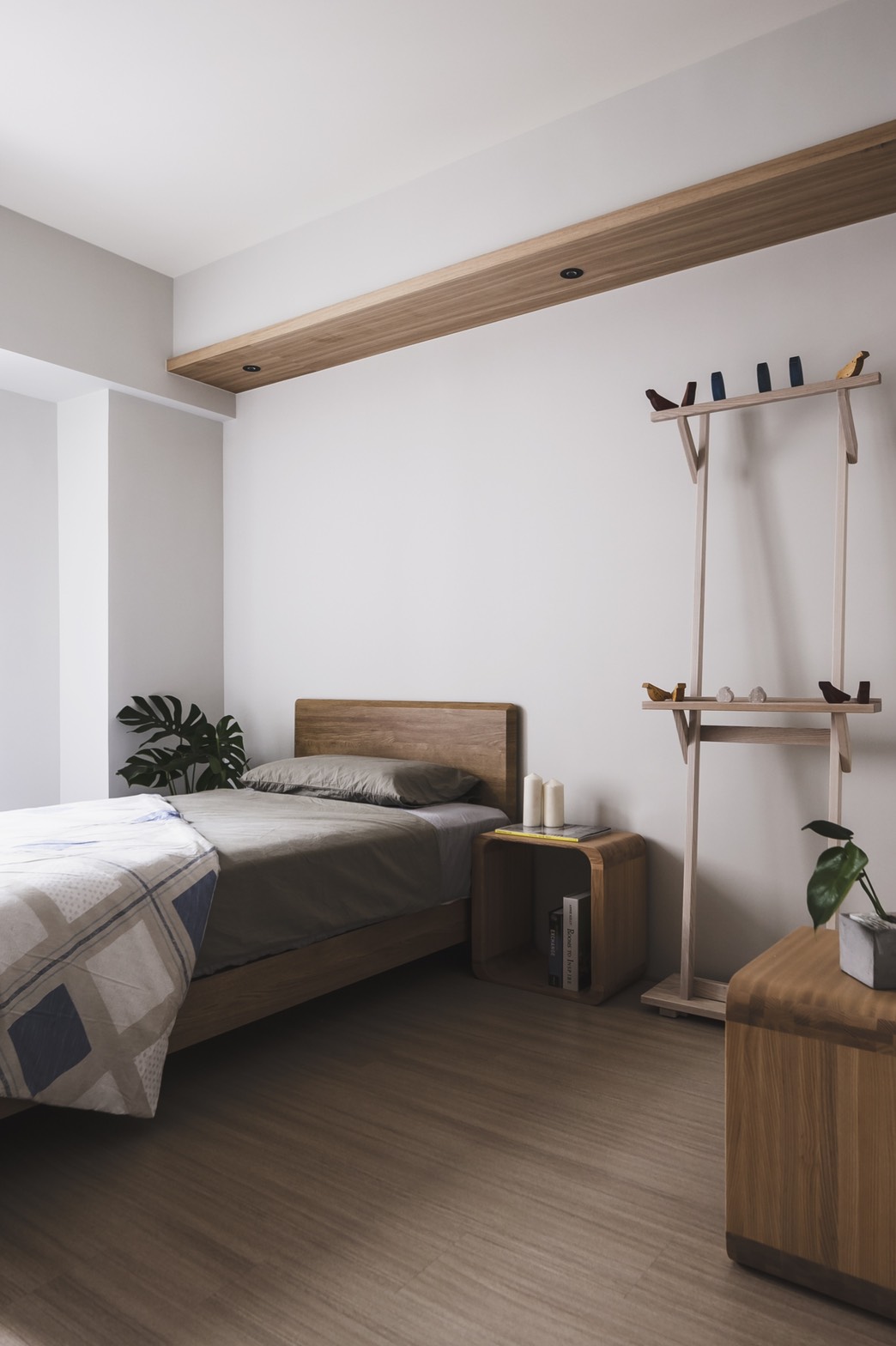A warm and refreshing modern-minimalist-style house is a home that the client yearns for. After entering the space, people can experience the stress-free environment through the surrounding natural atmosphere, and the feeling of belonging as a "home" is reflected by the space design. After the design team fully understands the housing needs and requirements, through the perfect layout and circulation, the space is divided into public and private areas to create a harmonious and open space. The use of dimming roller blinds harmoniously deploys the light inside the space. Through the warm wooden material, light wood color paint, leather surface, woods and emerald green color, creating a quiet and fresh Northern European elegant house. Place the bedrooms on the same side and implementing a hidden door design style to maintain the feeling of cleanliness and harmony in the space. Through the fresh colors such as pink green, sky blue and embellished with warm wood materials, the space creates the natural space atmosphere. This project is adopting monotonic patterns, unlike any other conventional residential house. In the living room, the TV cabinet implements a playful triangle shape, adopting a playful appearance to create a sense of liveliness at home. Besides, a Japanese room with a retractable tabletop is added in the corner of the living room, and the movable wall making the space more flexible. Through the wooden flooring, the overall space is enclosed in the lower level of the multi-functional and room layout to create a modern, simple and transparent space experience.